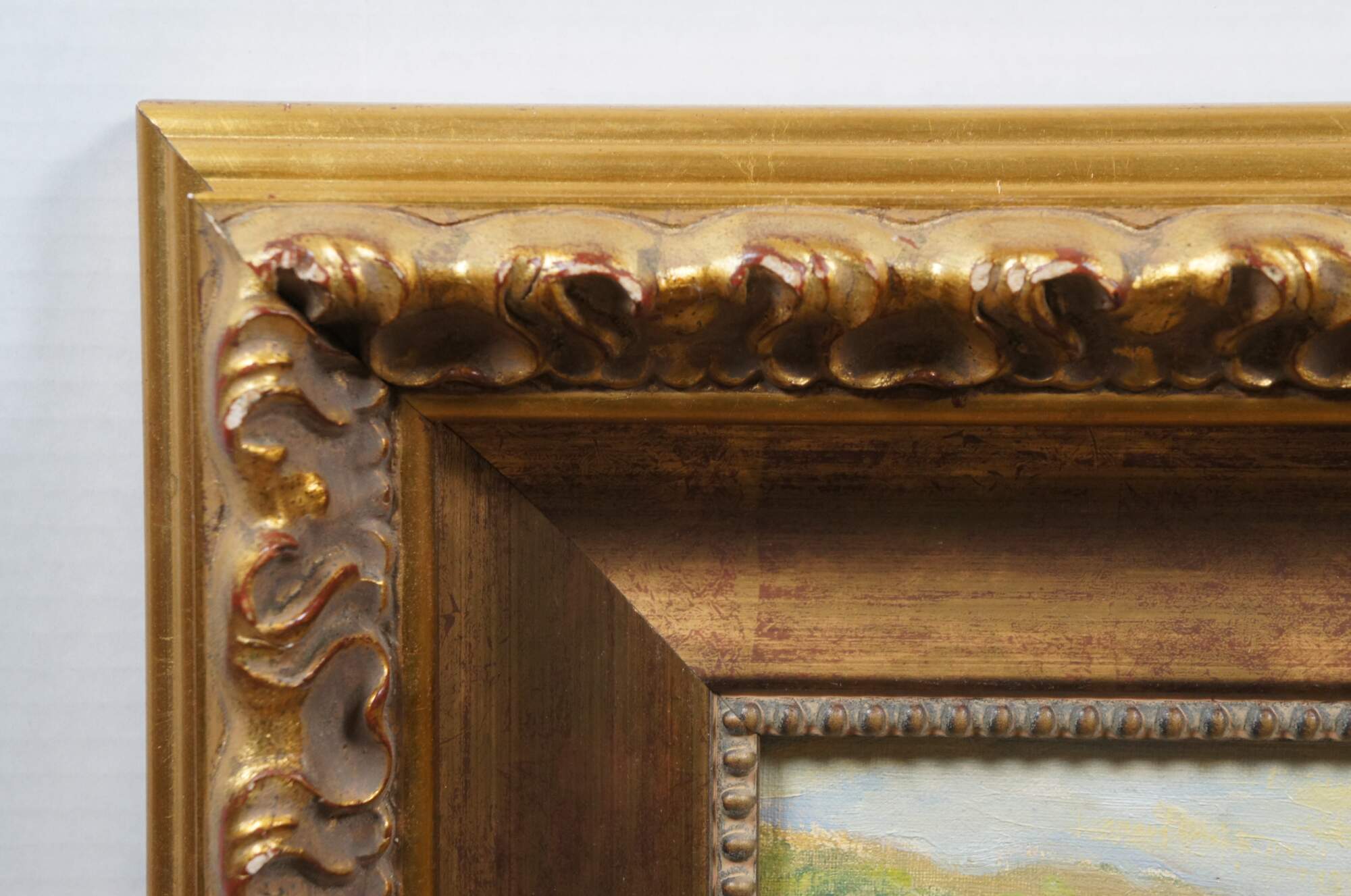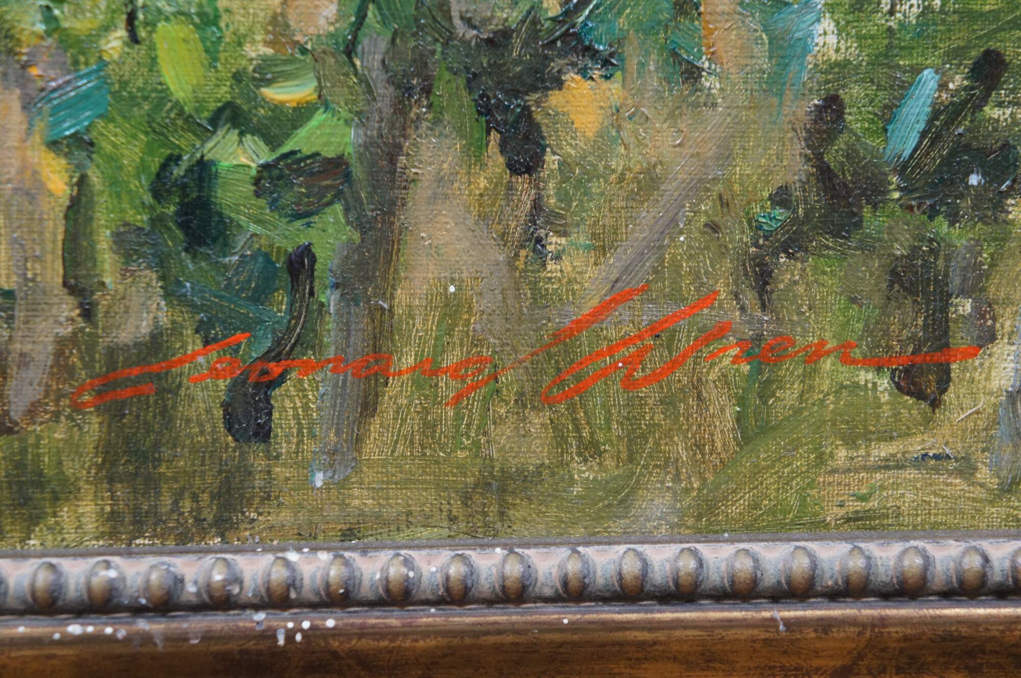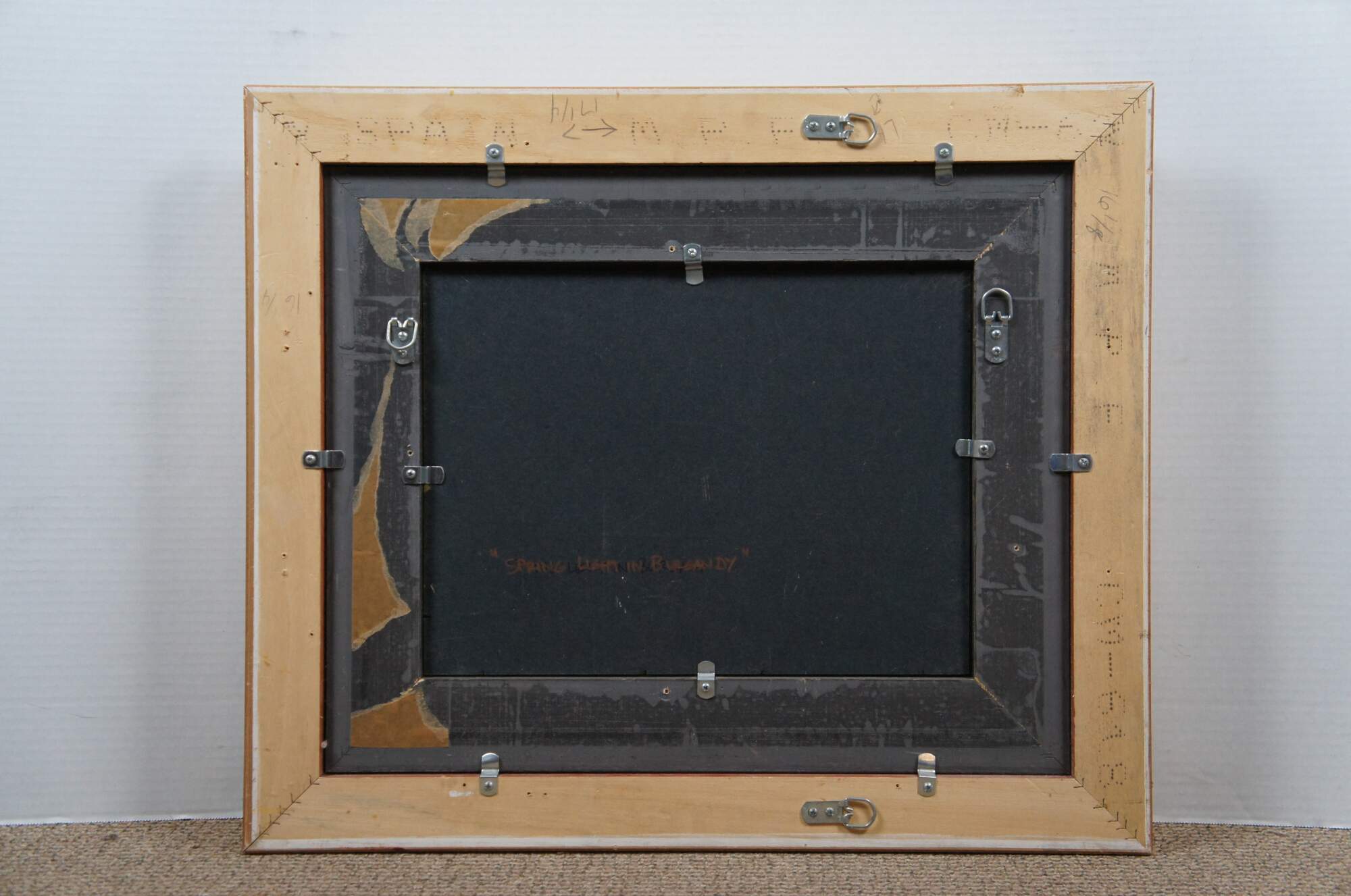 Late 20th century landscape oil painting on board titled "Spring Light in Burgundy (France)" by Leonard Wren. Depicts a charming French Impressionist country landscape of a village viewed across a Vineyard / field. Signed in lower right corner. Beveled frame with molded foliate edge and gold finish.