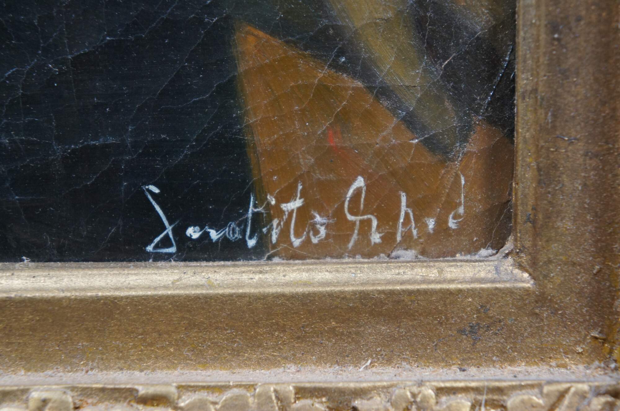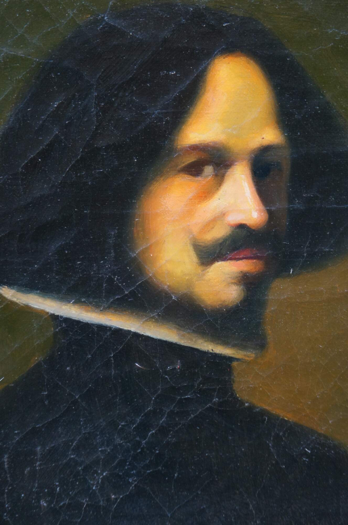 Late 20th century oil painting on linen after a circa 1645 Self Portrait by Diego Velazquez (original housed in the Uffizi Gallery, Florence). High relief baroque floral and foliate resin frame with antiqued gold finish.