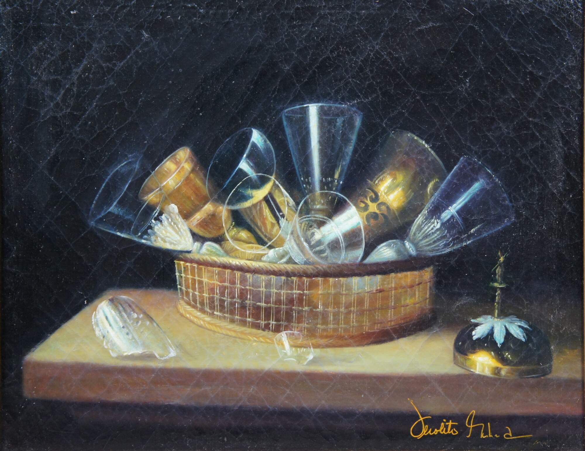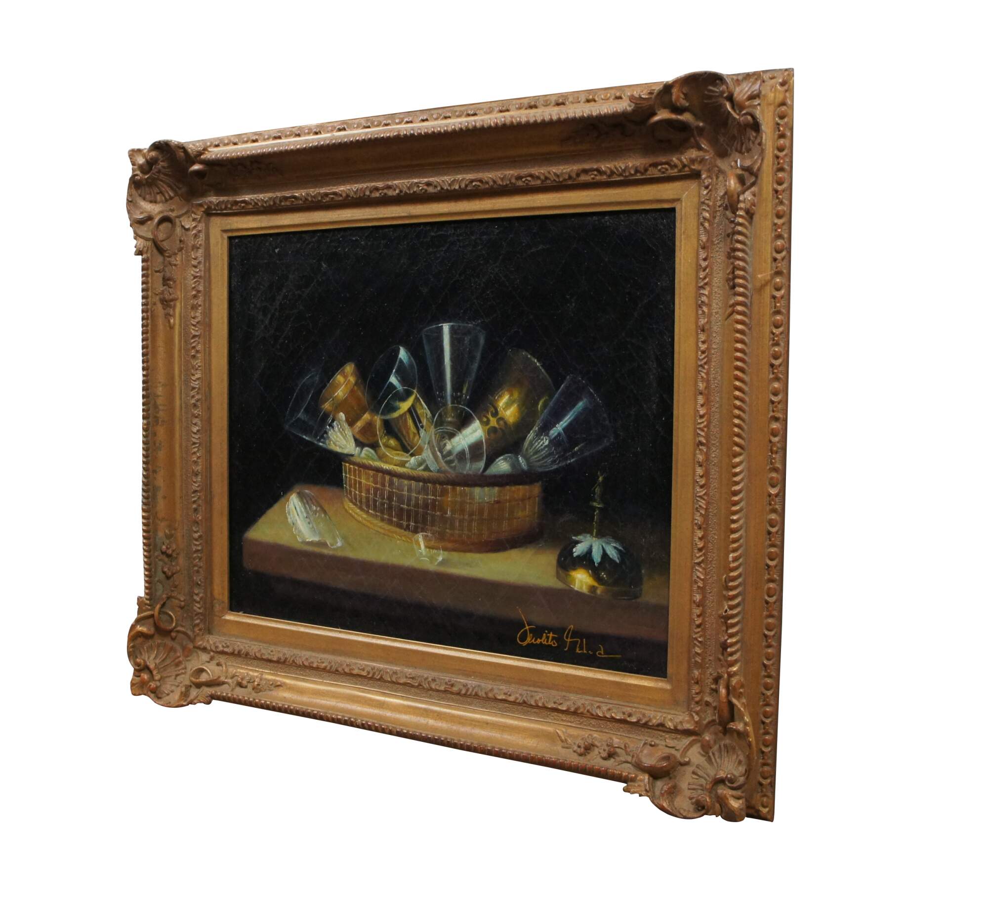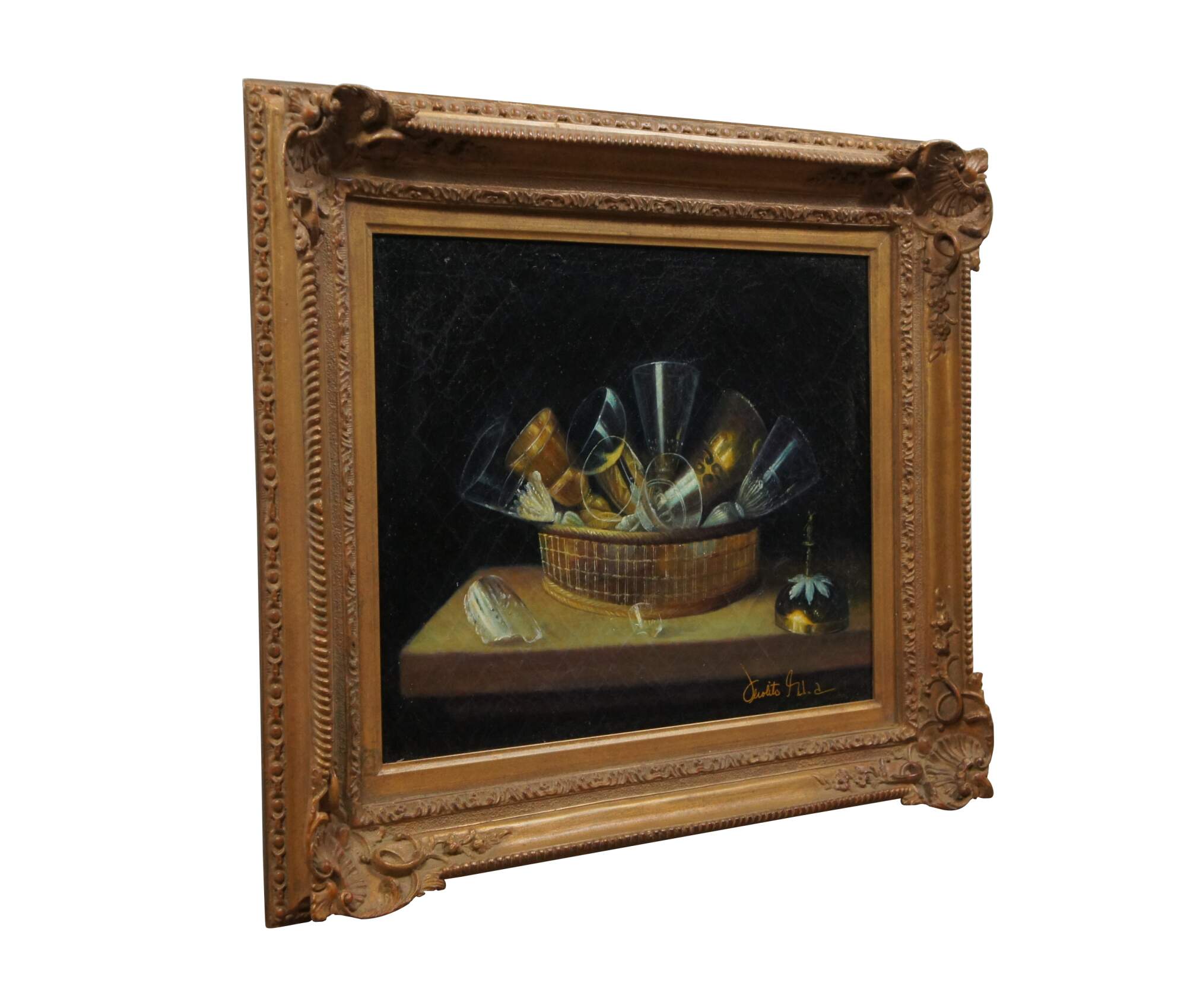 Late 20th century still life oil painting on linen after "Glasses in a Basket" originally painted in 1644 by Sebastian Stoskopff. Depicts several glass goblets in a small basket with one broken to the left and a small lid or figurine to the right. Molded frame with scallop shall corners and foliate / rope twist details in a dull gold finish.