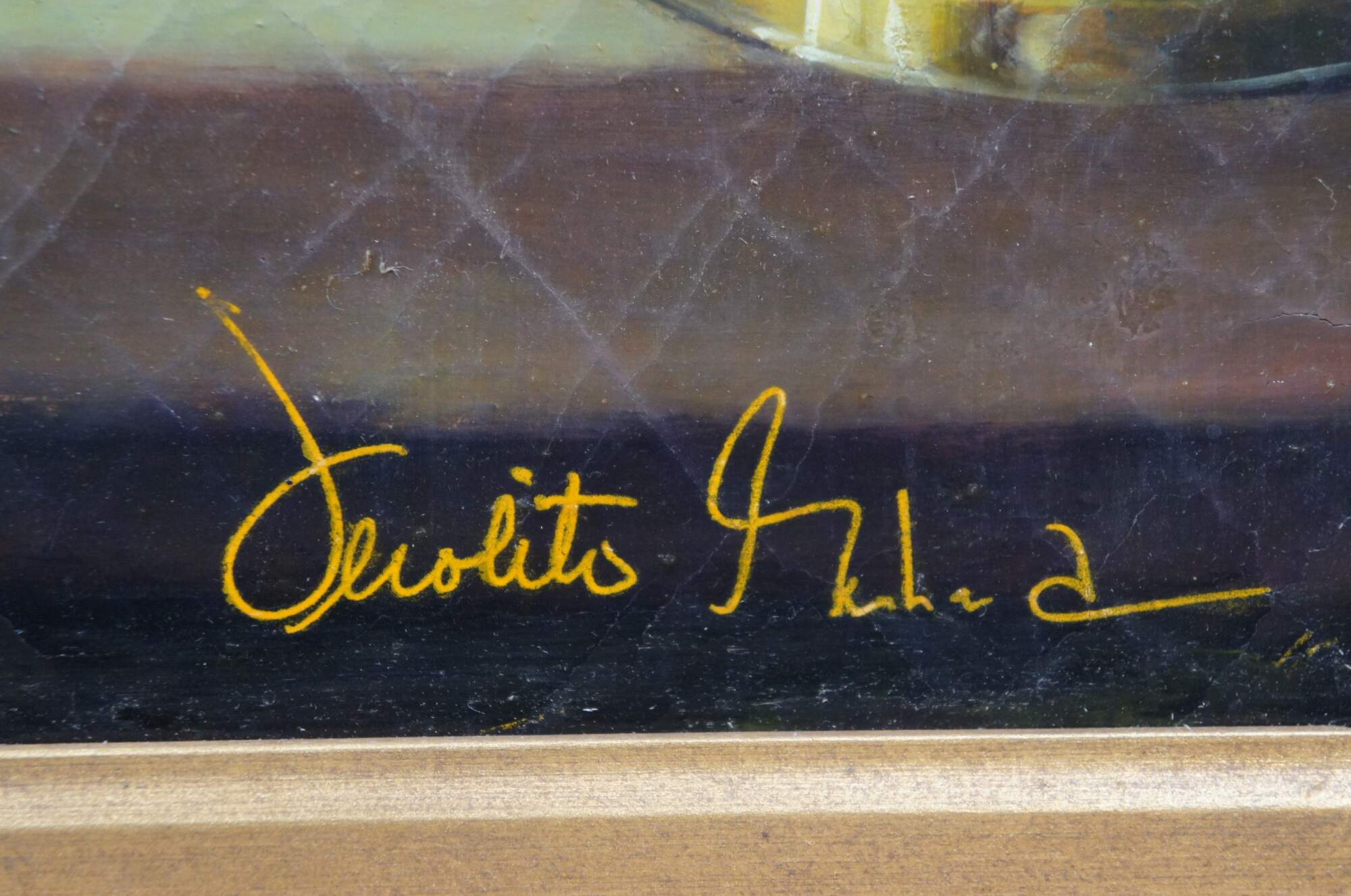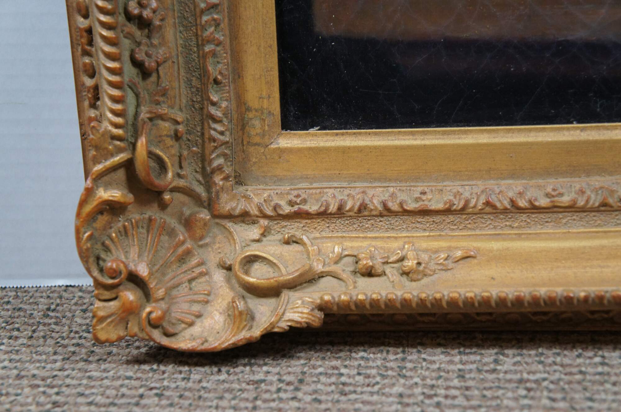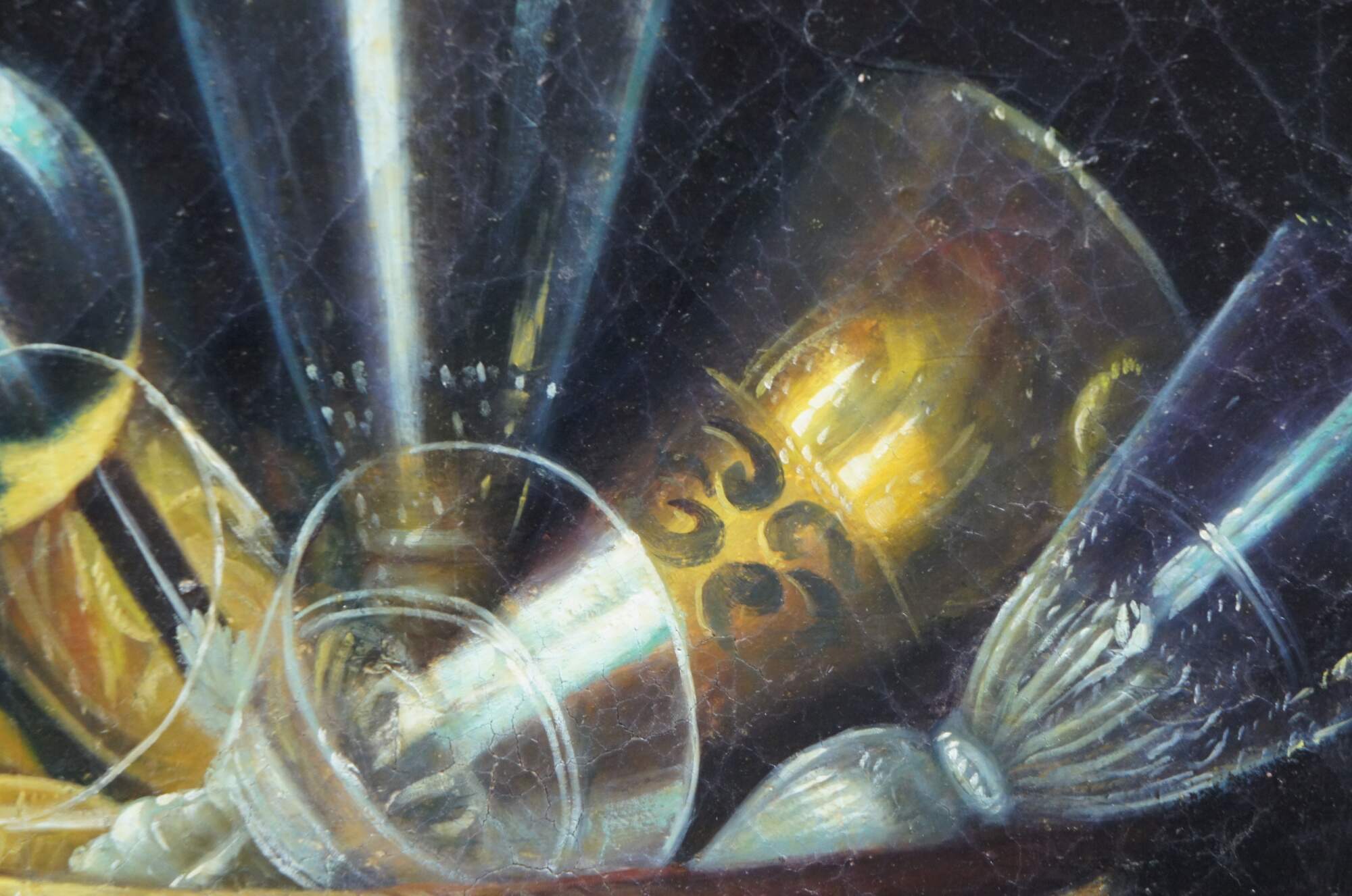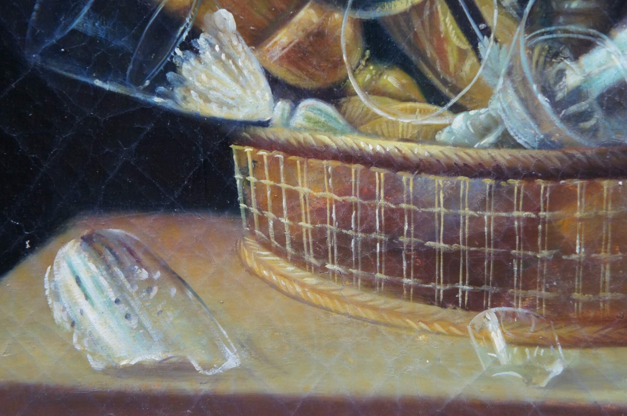 Late 20th century still life oil painting on linen after "Glasses in a Basket" originally painted in 1644 by Sebastian Stoskopff. Depicts several glass goblets in a small basket with one broken to the left and a small lid or figurine to the right. Molded frame with scallop shall corners and foliate / rope twist details in a dull gold finish.