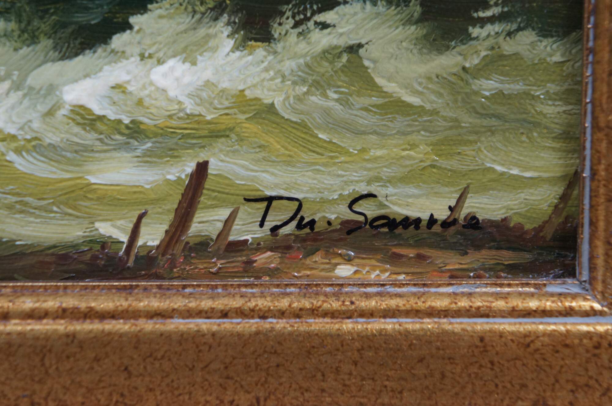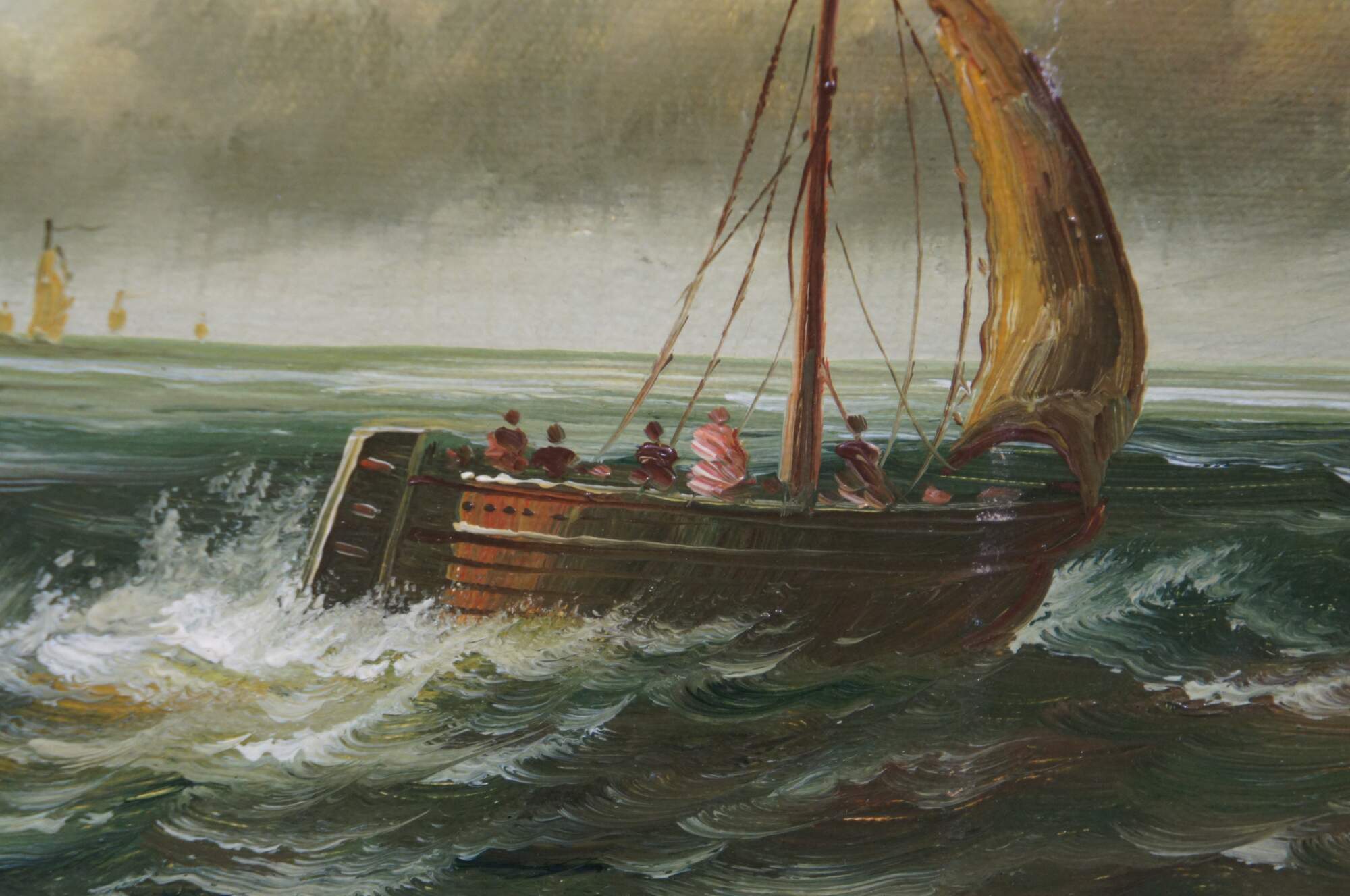 Late 20th century coastal seascape oil painting on canvas depicting sailboats/ ships / boats on choppy seas, one in particular flying a French pennant. Signed in lower right corner. Beveled frame with molded foliate designs and bright gold finish.