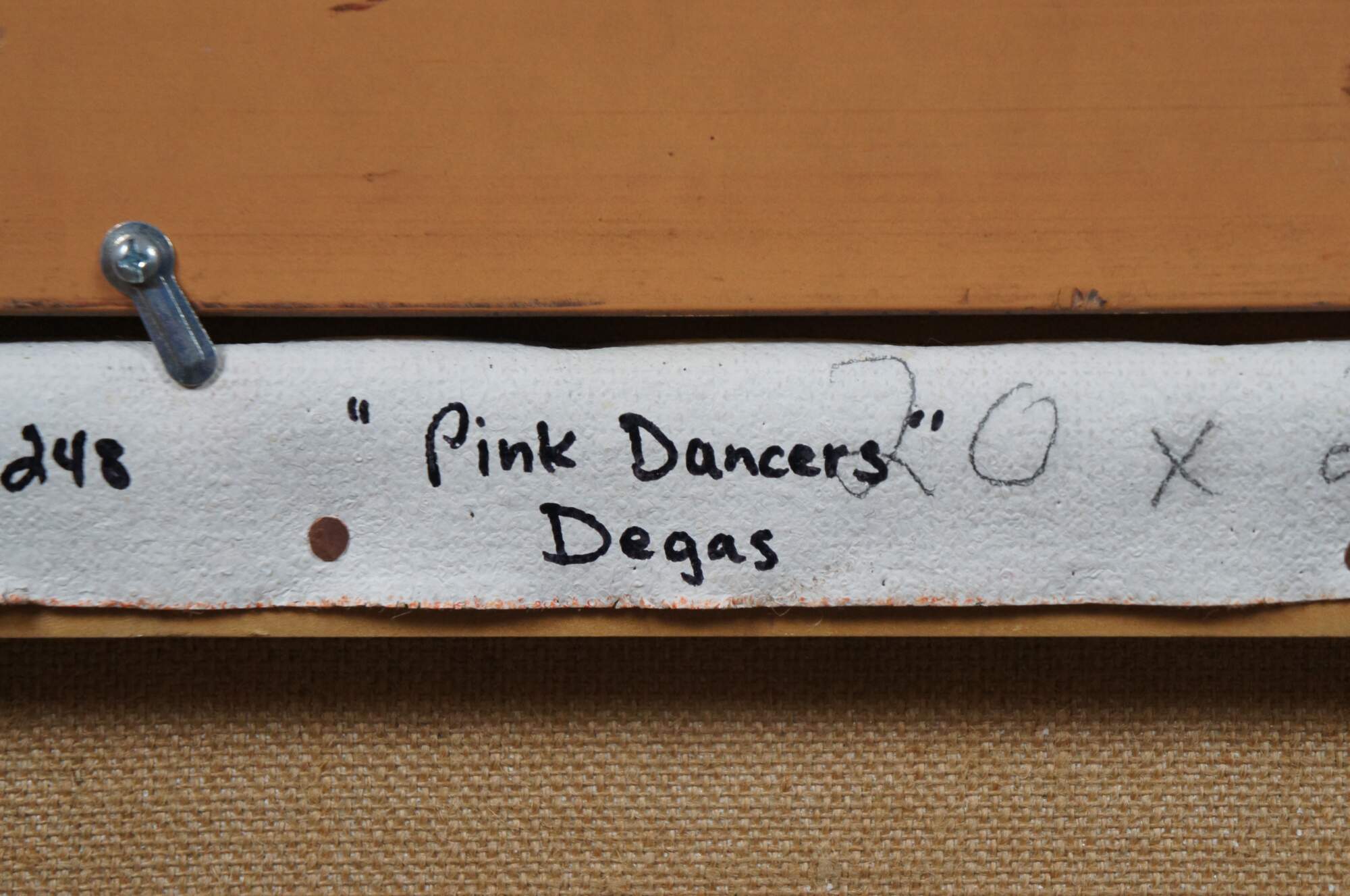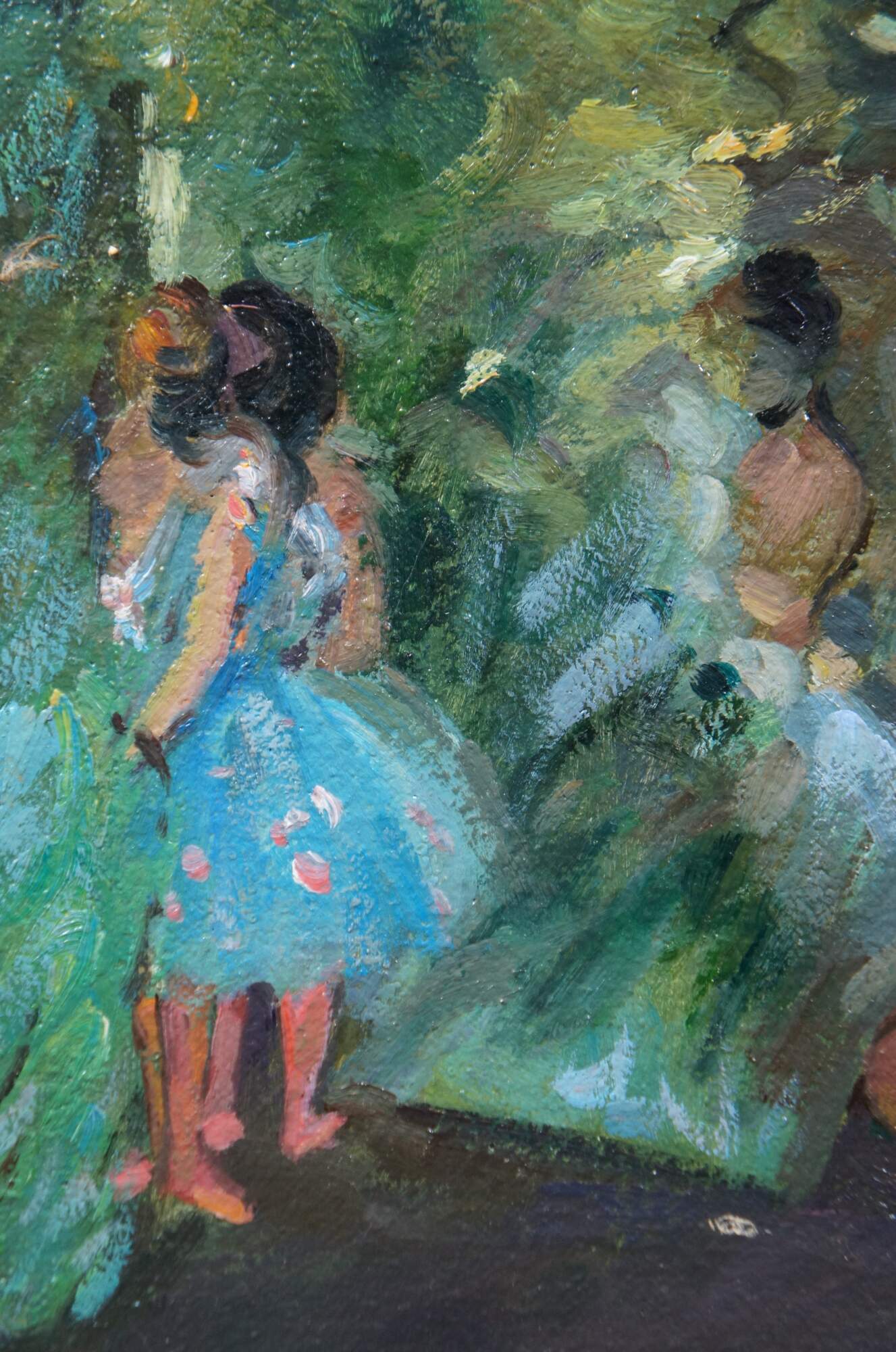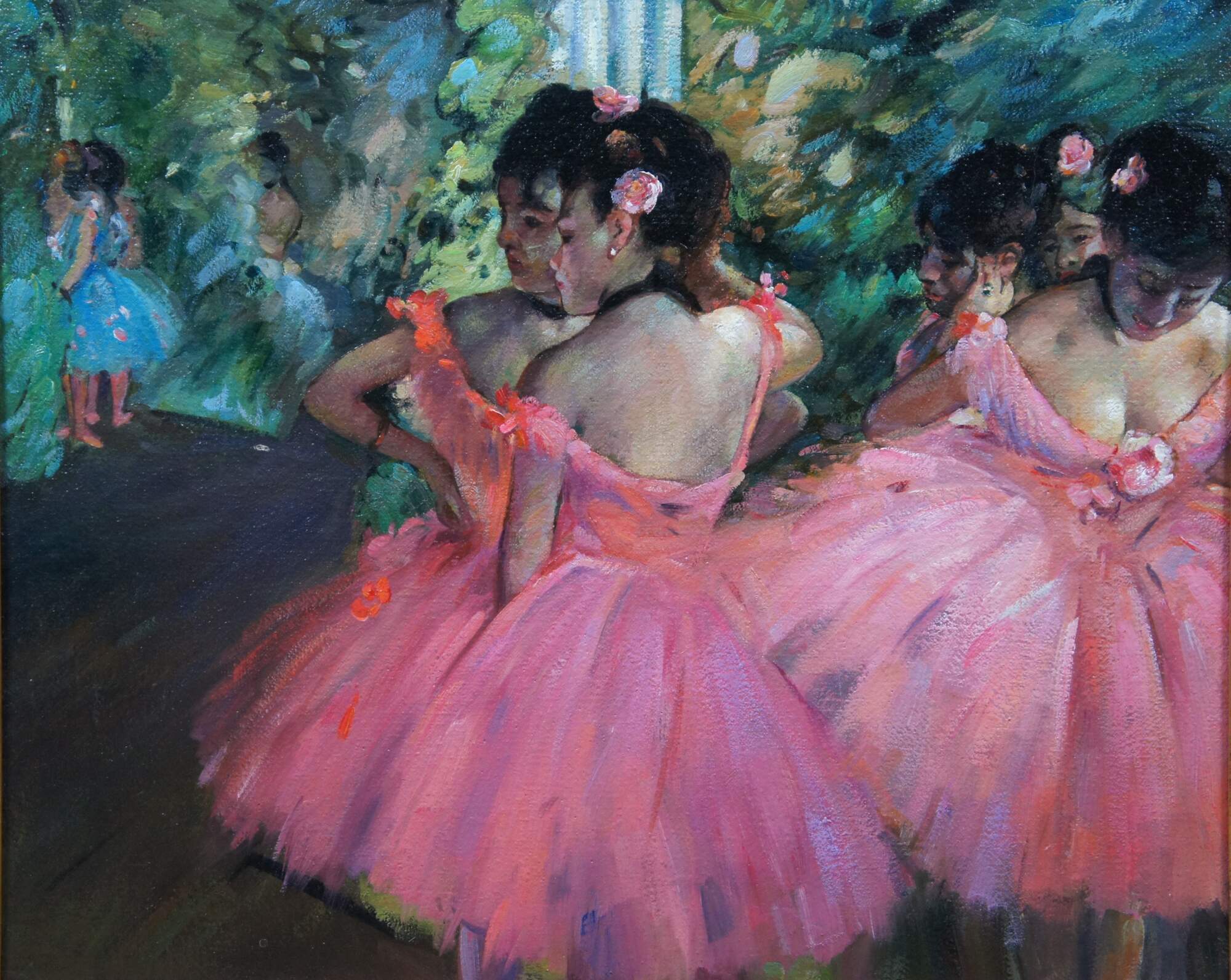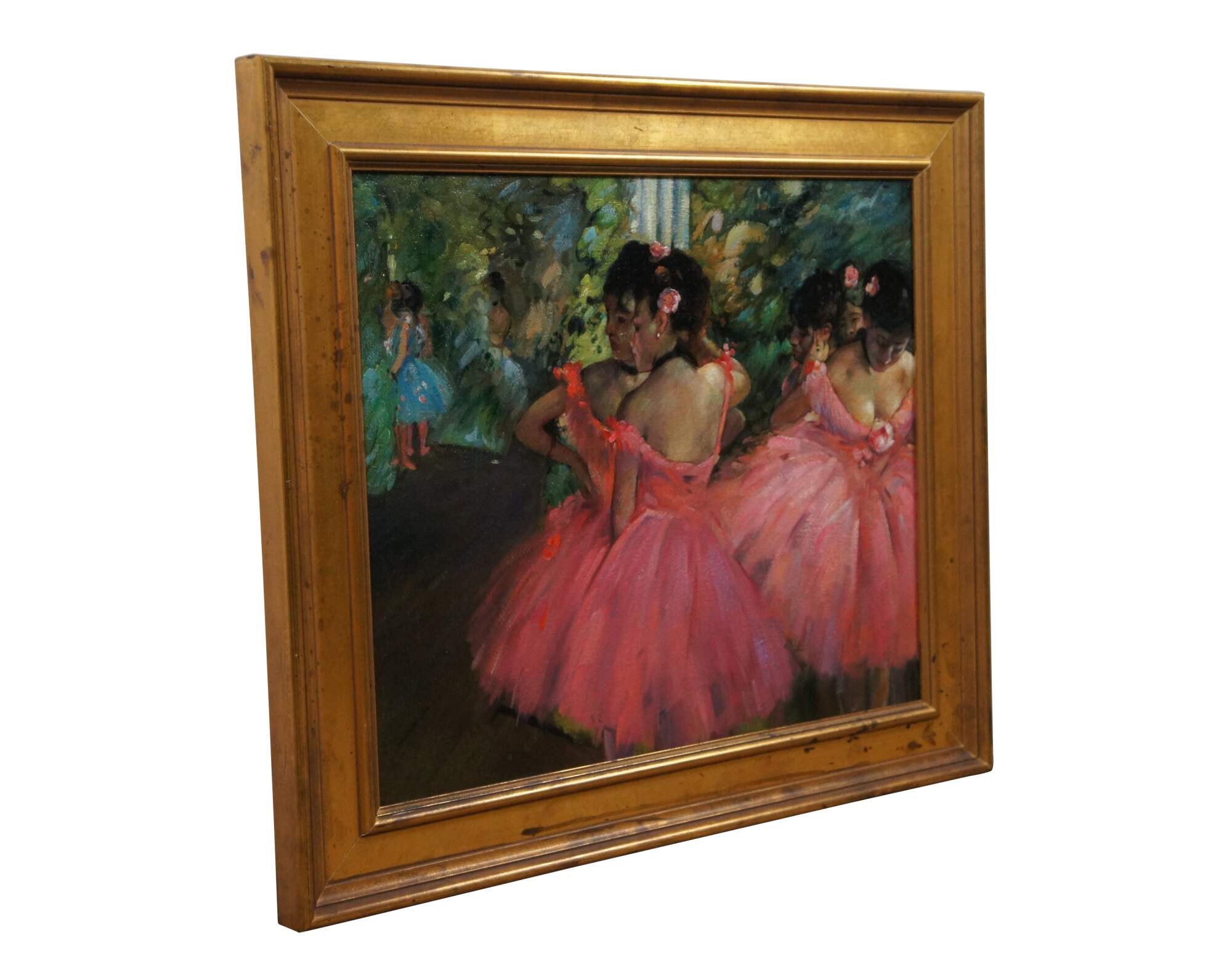 Late 20th century French Impressionist oil painting on canvas of "Ballerinas in Pink" or "pink Dancers" originally painted circa 1876 by Edgar Degas. Depicts a group of ballerinas in pink waiting for their cue as they watch other dancers in blue, standing in the wings of the stage for their entrance. Beveled resin frame with distressed gold finish.