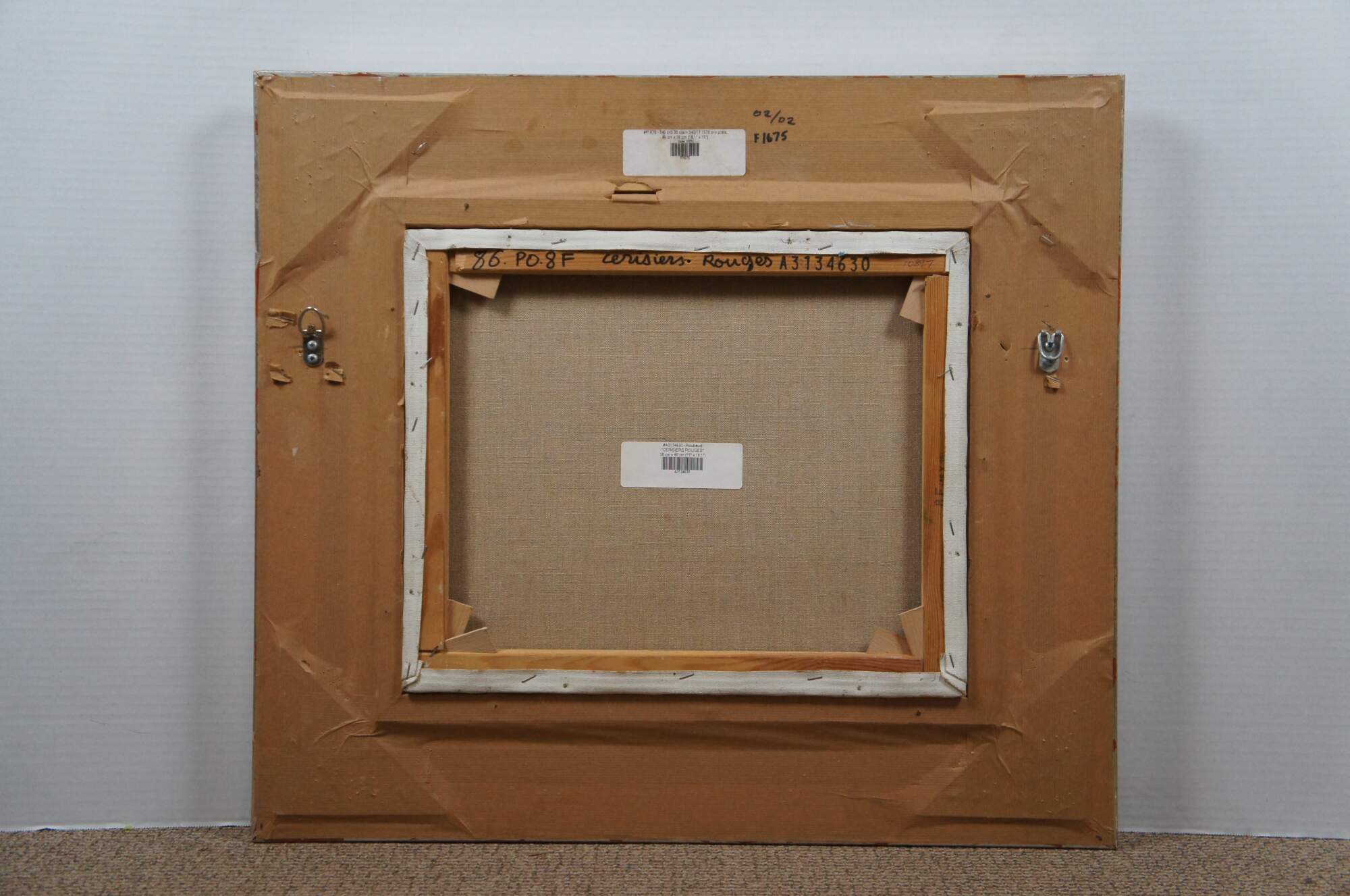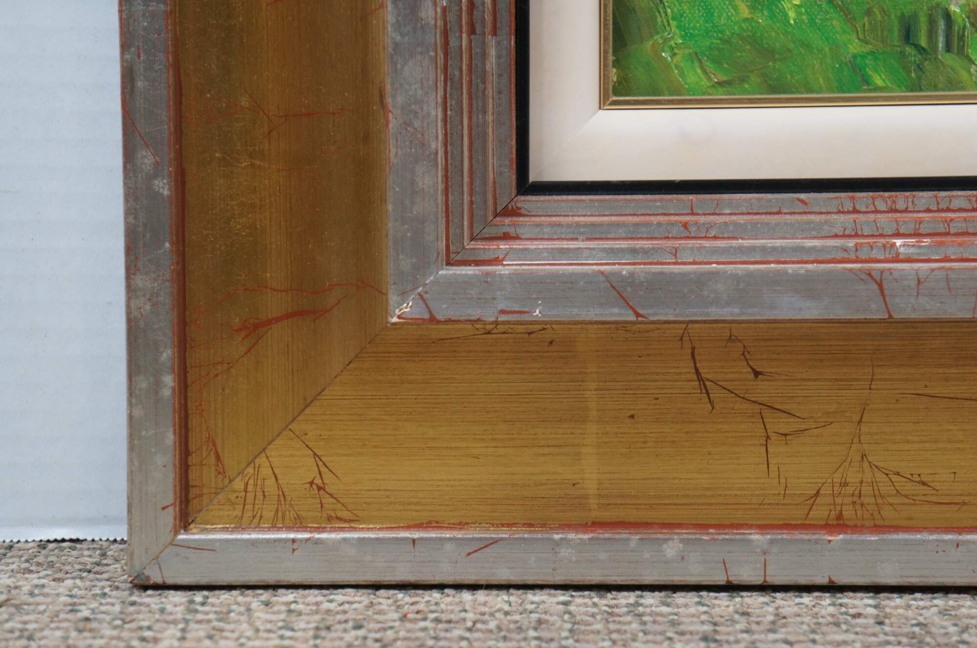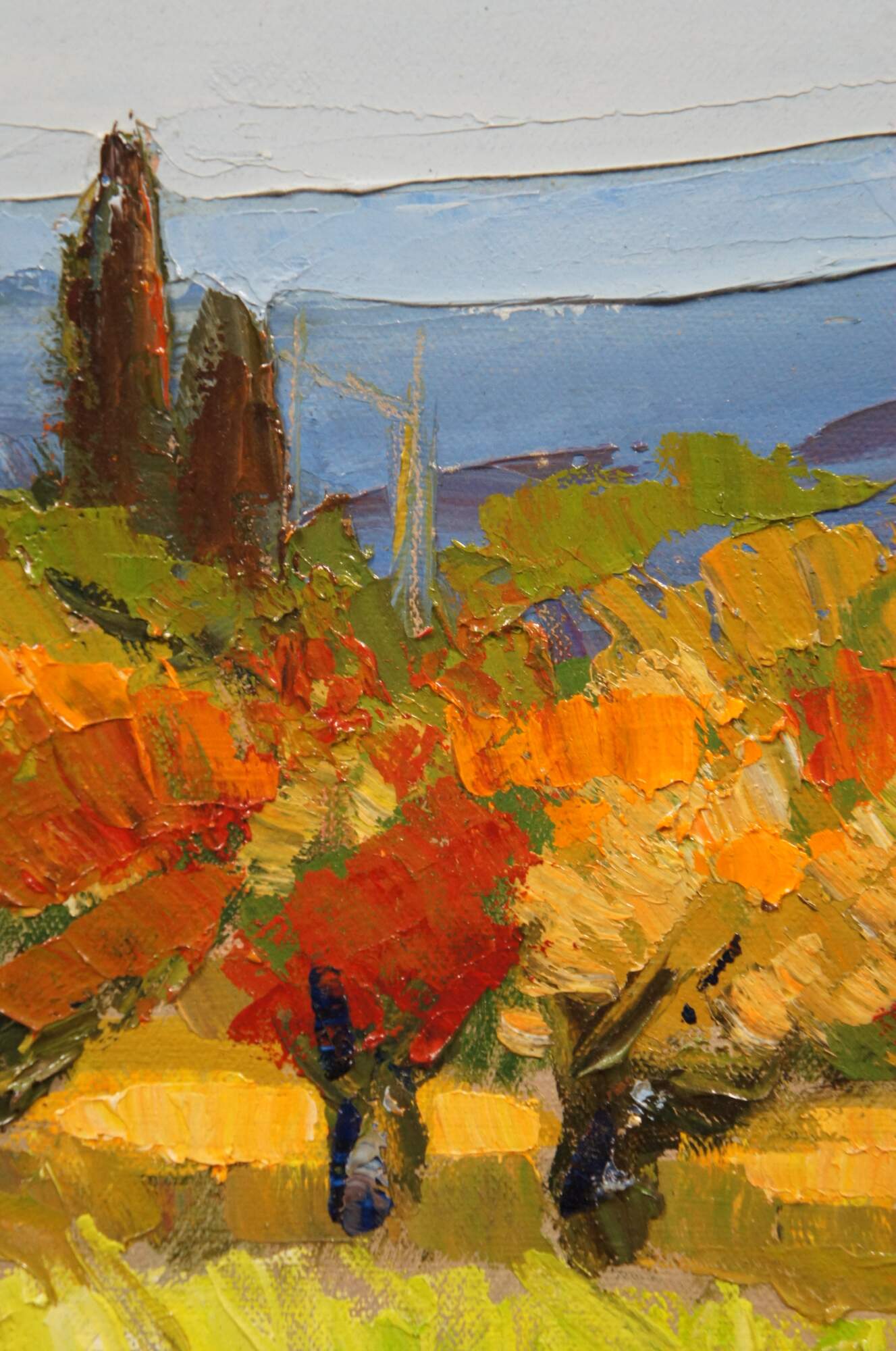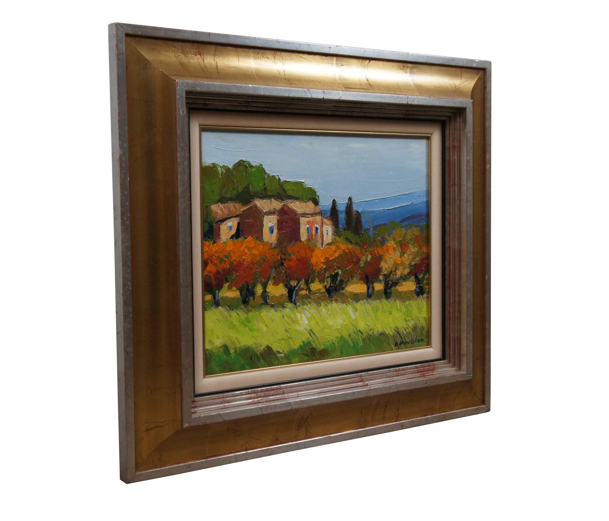 Late 20th century Impressionist landscape oil painting on canvas titled "Cerisiers Rouges" (Red Cherry Trees) by Andres Roubaud. Depicts a landscape of a field lined with red-orange cherry trees and cottage / farmhouse / chateau in the background, resembling a vineyard in the hillsides France. Signed in lower right corner. Silver and gold beveled giltwood frame with white linen mat.