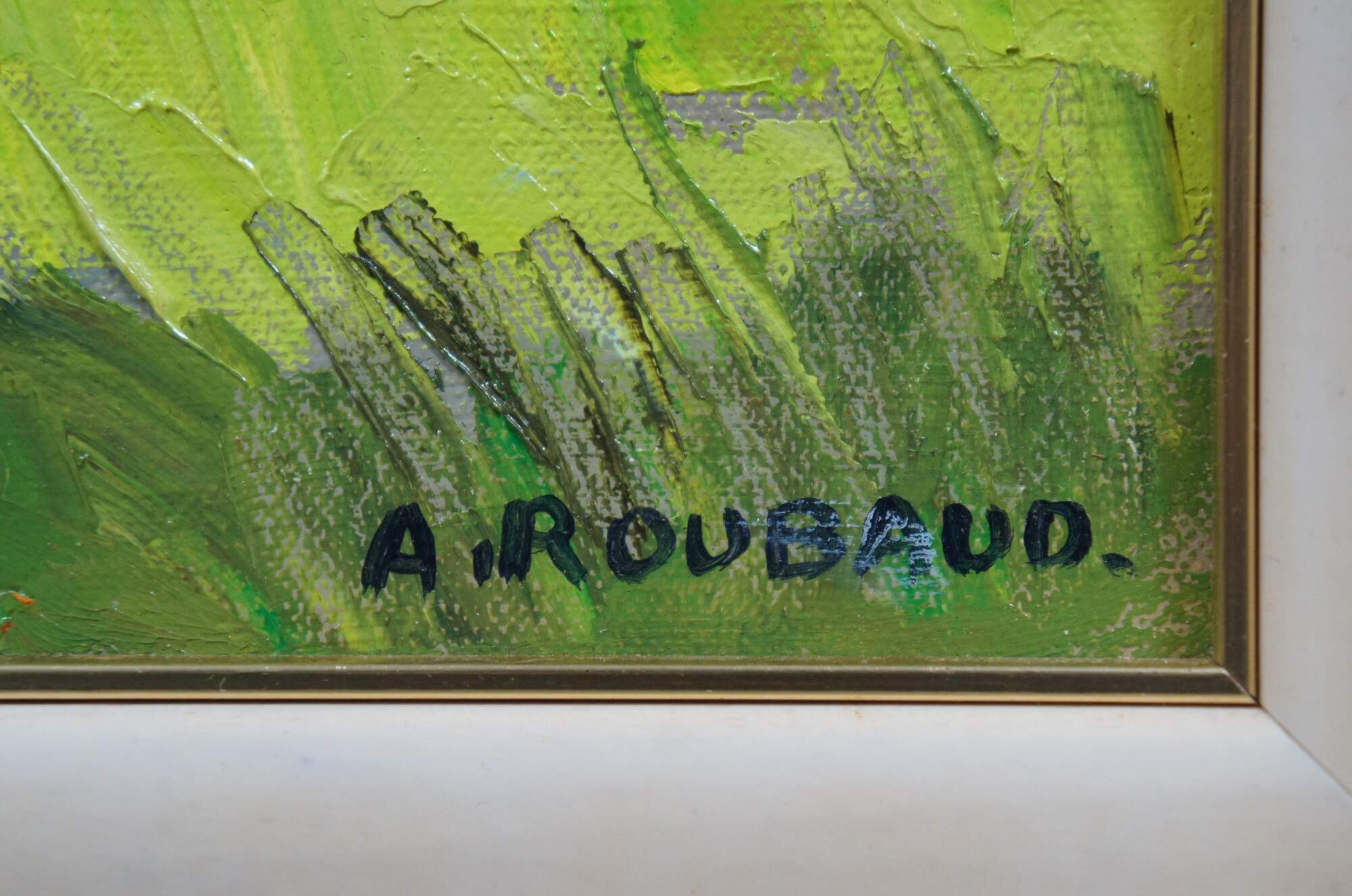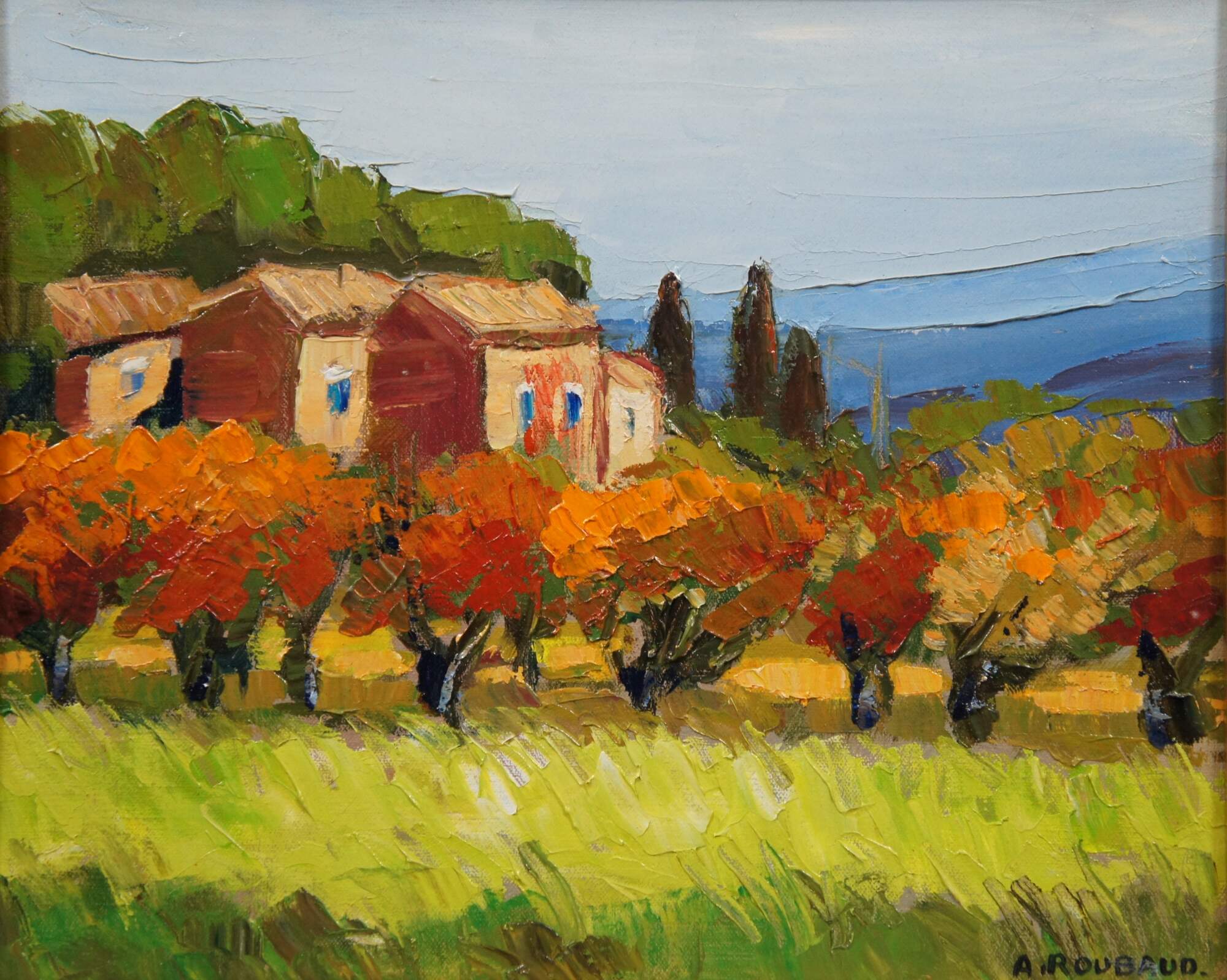 "For the past 40 Years Andre Roubaud has been working as an artist. "Reality and dreams, realism and poetry, combine in his eyes and by his hand to move us," said Jean-Claude Gaudin, Senator of the "Bouches-du-Rhone." Andre Roubaud was born in France in 1929, and continues to live there, pictorially describing the natural beauty of Provence where he grew up. He began painting at a very early age - well before he attended art school. Roubaud enjoyed painting the things that surrounded him: landscapes, flowers and people. Andre Roubaud uses vivid colors and thick texture. The hues on his images are bright yellow, green, red and blue and are intended to draw the viewer's eyes into the image. He uses a palette knife to move the thick paint around his canvas. This strong texture gives the painting depth, and for some viewers the feeling they could almost walk into the scene of the painting. Roubaud works quickly to capture his excitement onto the canvas and to achieve a reflection of his soul. If an image looses his interest, he pushes it aside until he finds his inspiration again. " (Source: askART)