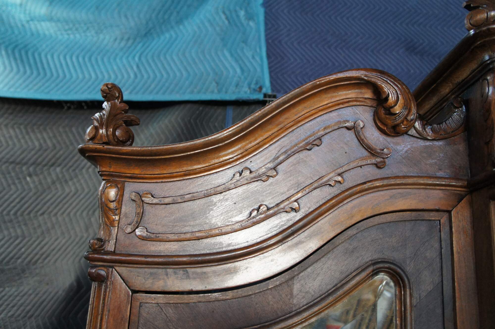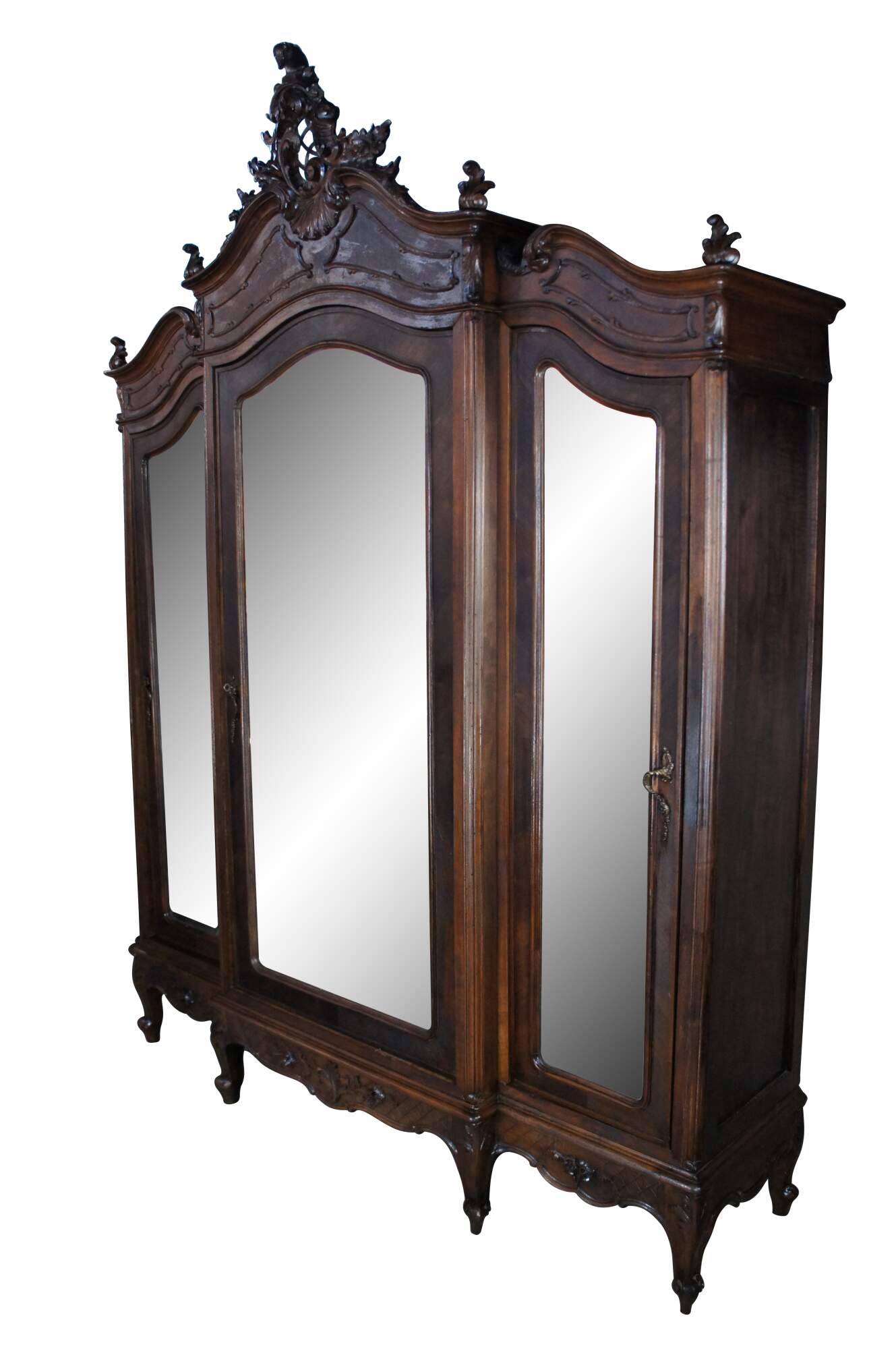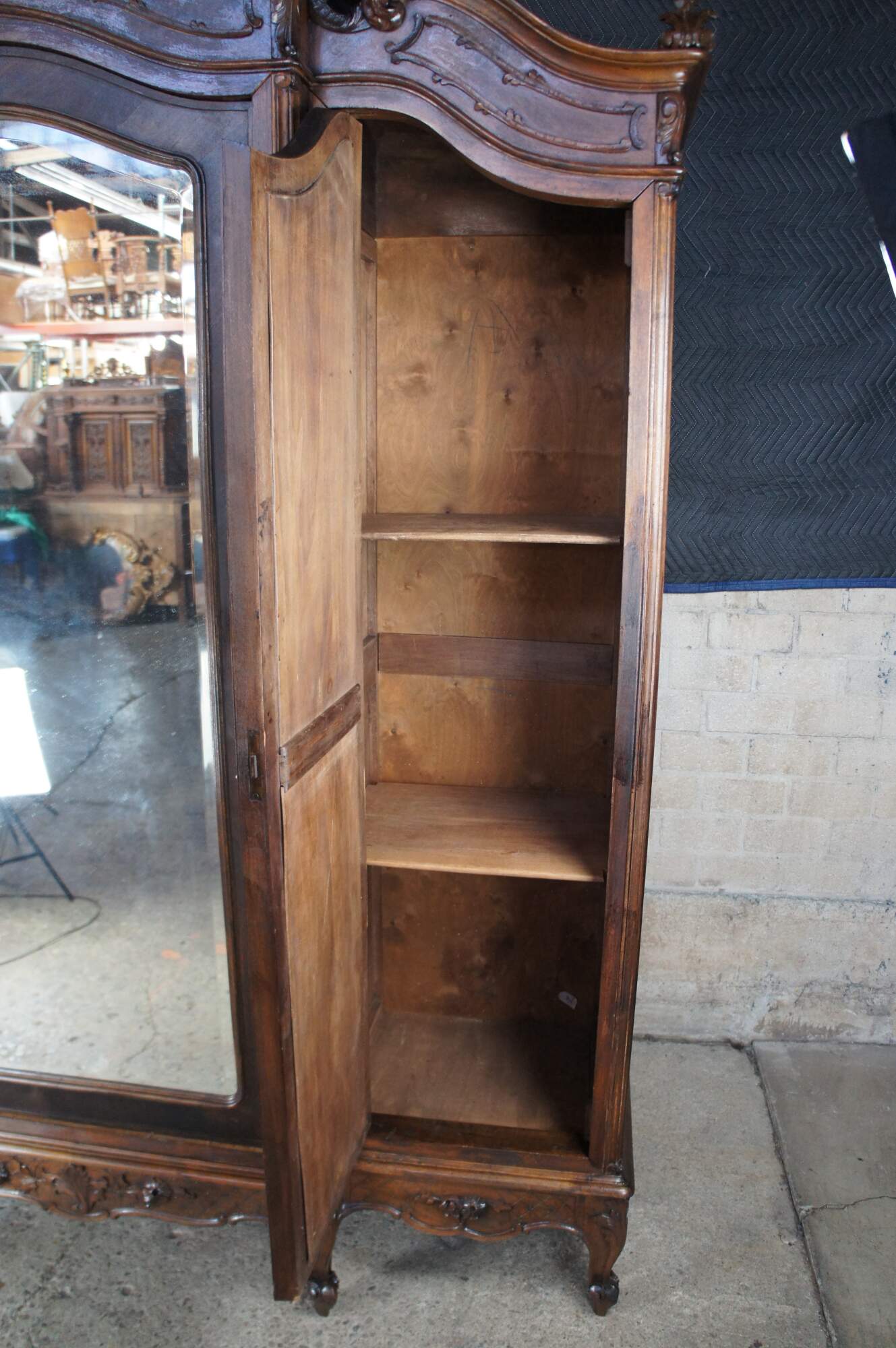 A beautiful antique 19th Century French Knockdown Armoire / Wardrobe. Features a walnut frame with three large beveled glass mirrored doors The cabinet opens to a large central area for hanging garments at the center which is flanked by smaller outer cabinets with shelves. The central crown has a beautifully carved cartouche with shell and acanthus motifs. Lower aprons showcase a lattice carved design, with rose carved accents over cabriole legs.