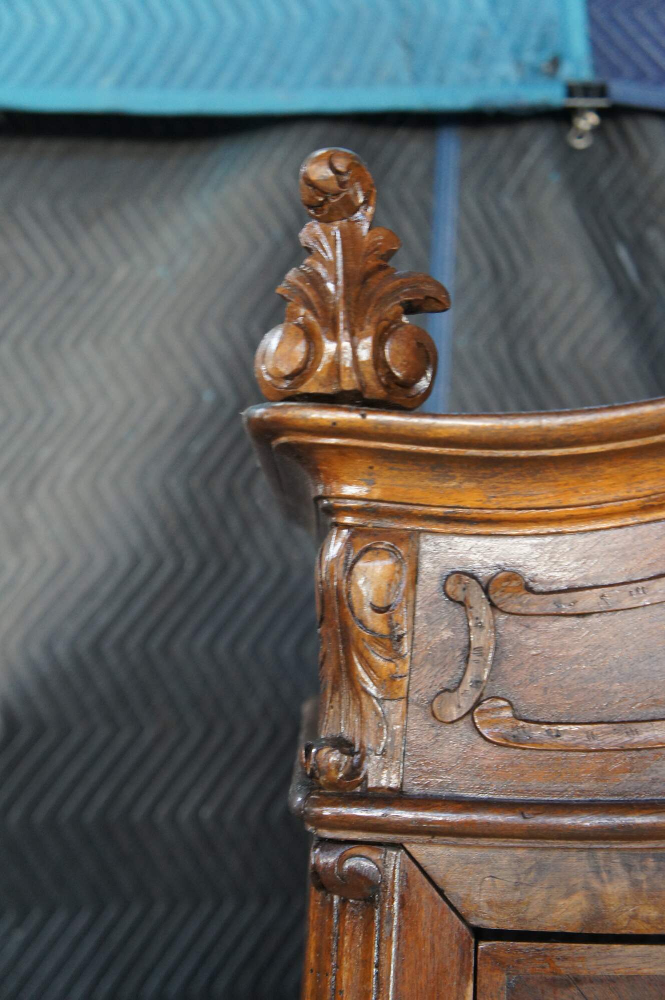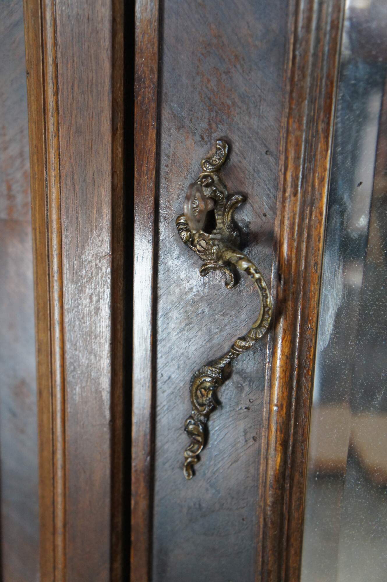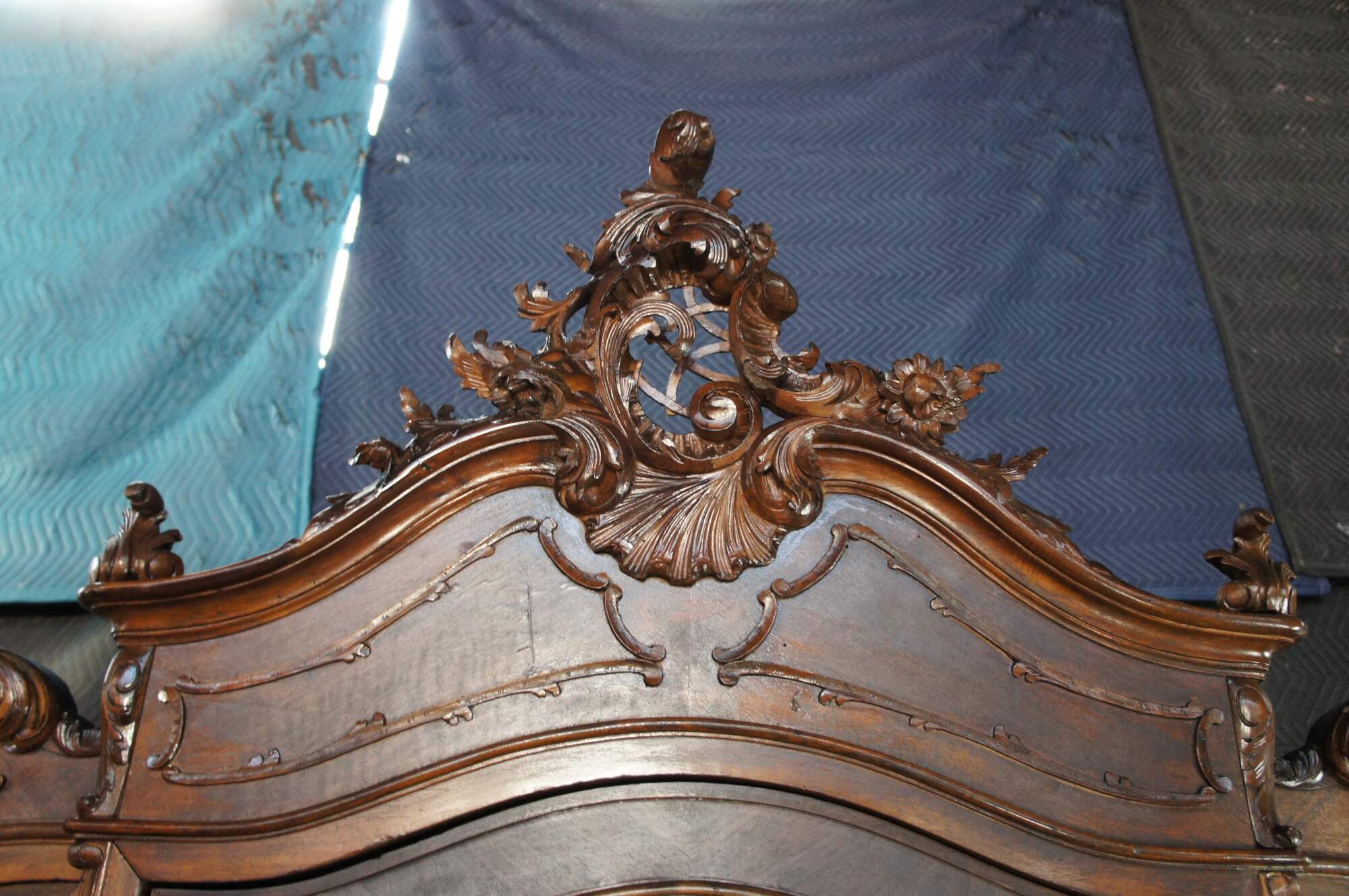 A beautiful antique 19th Century French Knockdown Armoire / Wardrobe. Features a walnut frame with three large beveled glass mirrored doors The cabinet opens to a large central area for hanging garments at the center which is flanked by smaller outer cabinets with shelves. The central crown has a beautifully carved cartouche with shell and acanthus motifs. Lower aprons showcase a lattice carved design, with rose carved accents over cabriole legs.