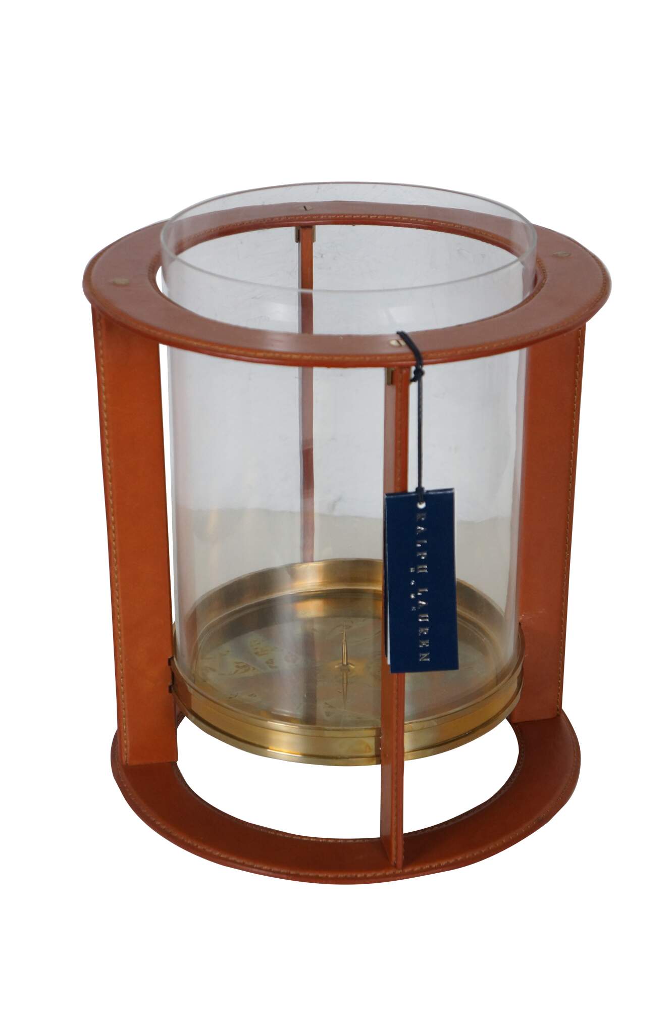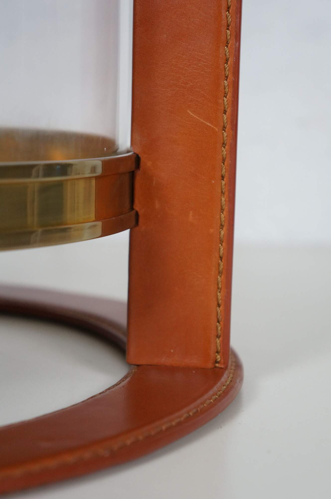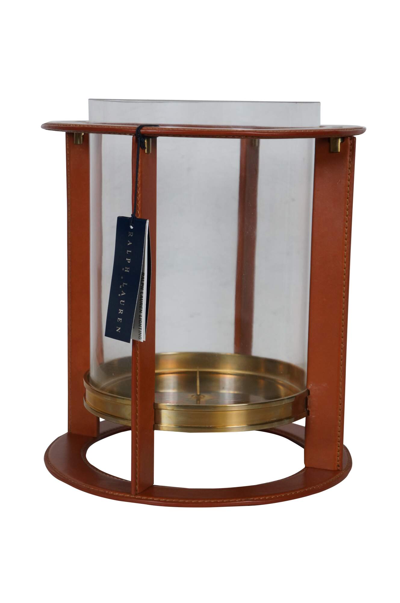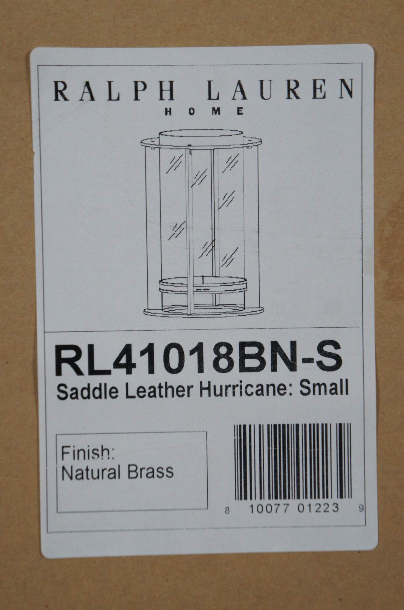 New in box Ralph Lauren Home Saddle Leather Hurricane: Small. Finish: Natural Brass. These pieces are no longer in production and very unique. The sculptural hurricane candleholders are part of the timeless home collection by Ralph Lauren. Constructed in saddle leather, patinated brass and glass. The shape of these models is perfectly classic and timeless. Ideal for placement on side tables in a living room, or in a dining room, as a centerpiece. Model No: RL41018BH-S. Date Code: 2008-11. Identification: C211329.