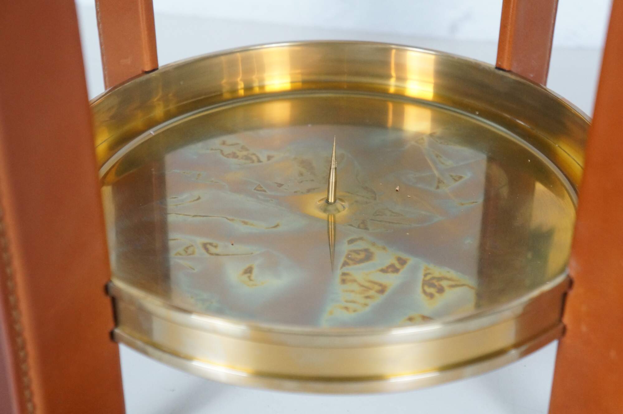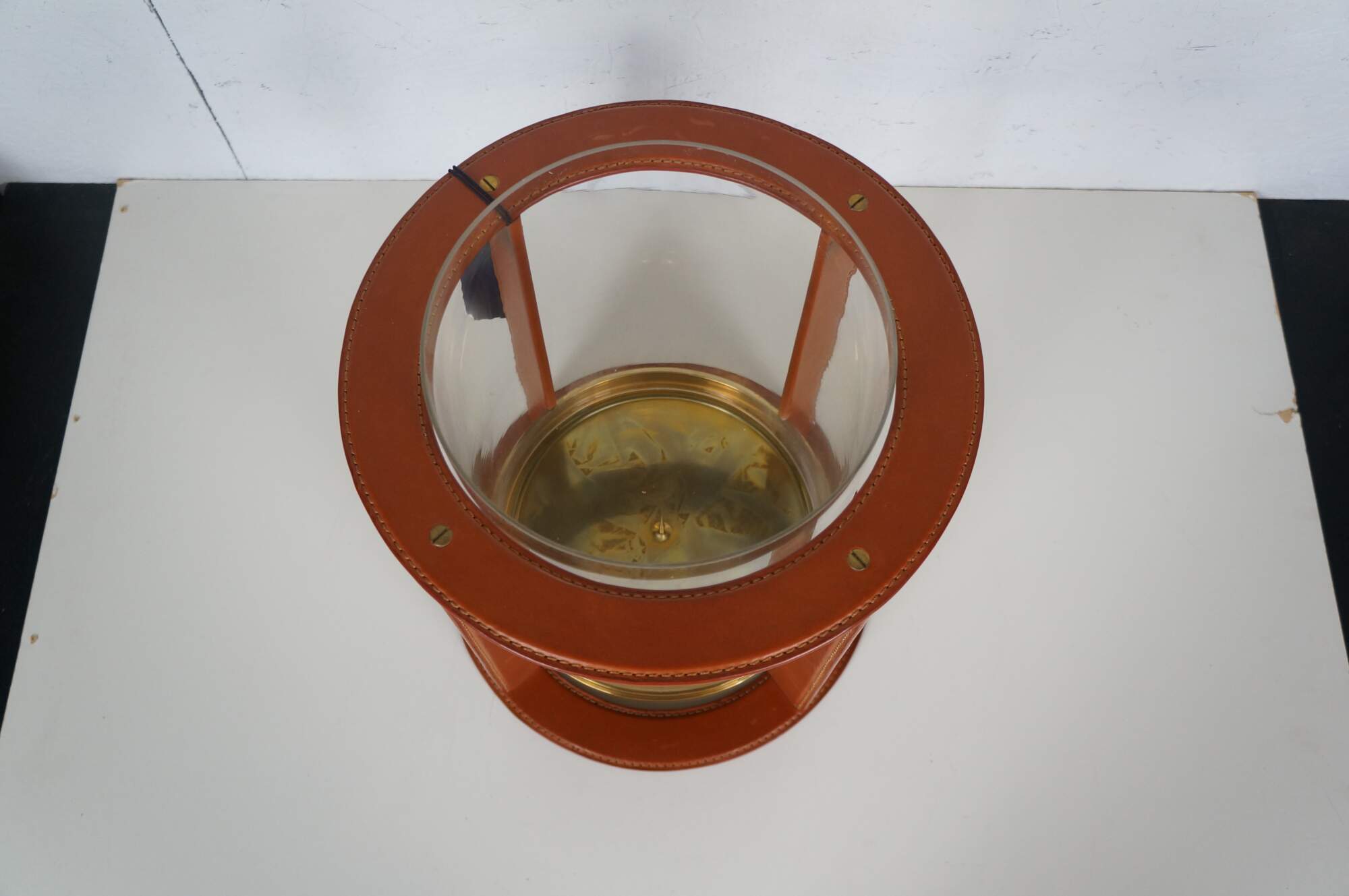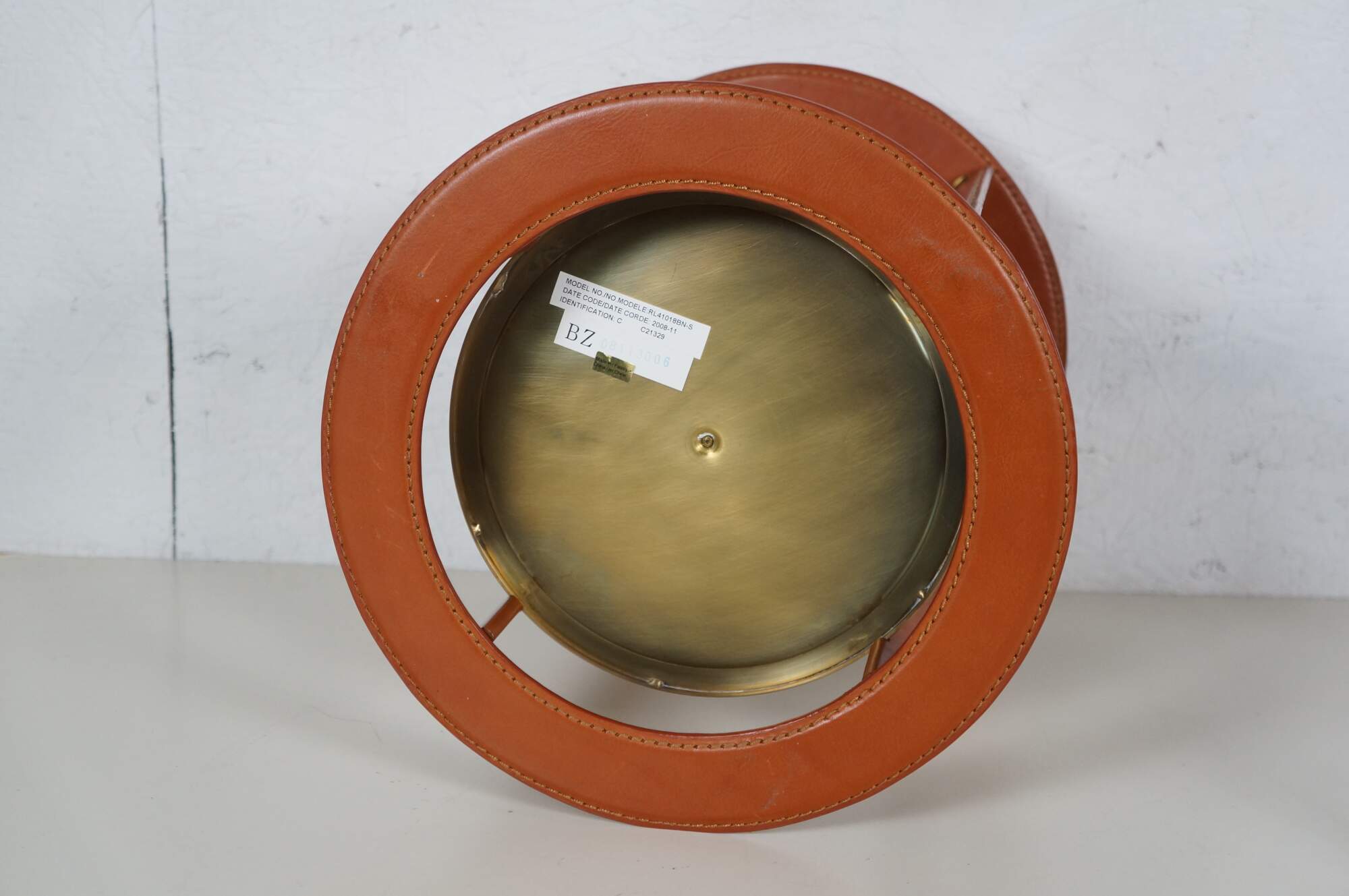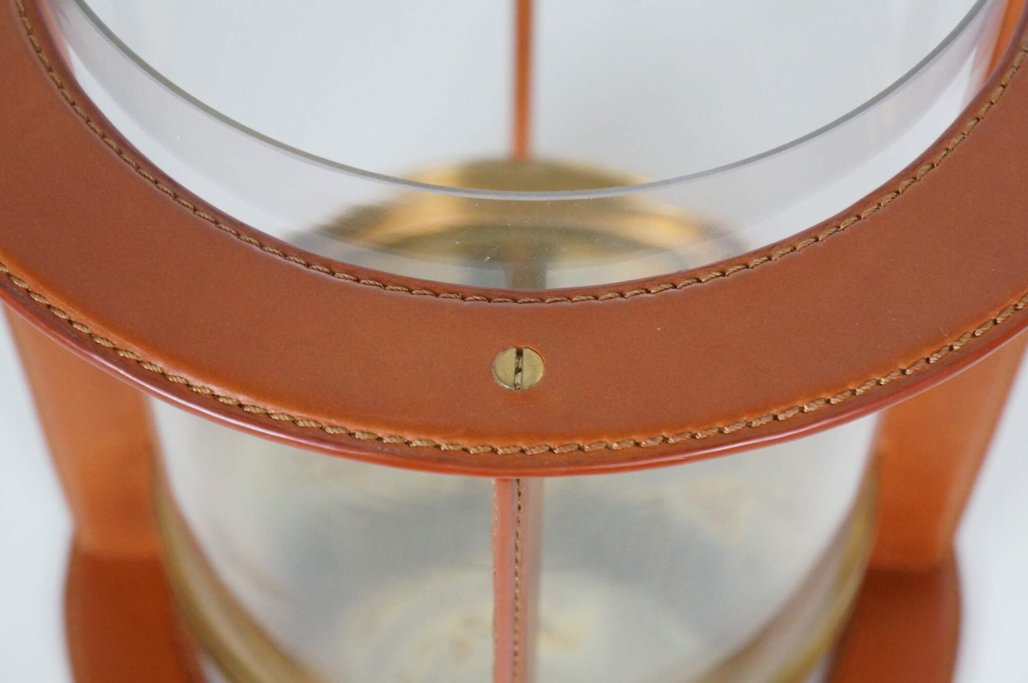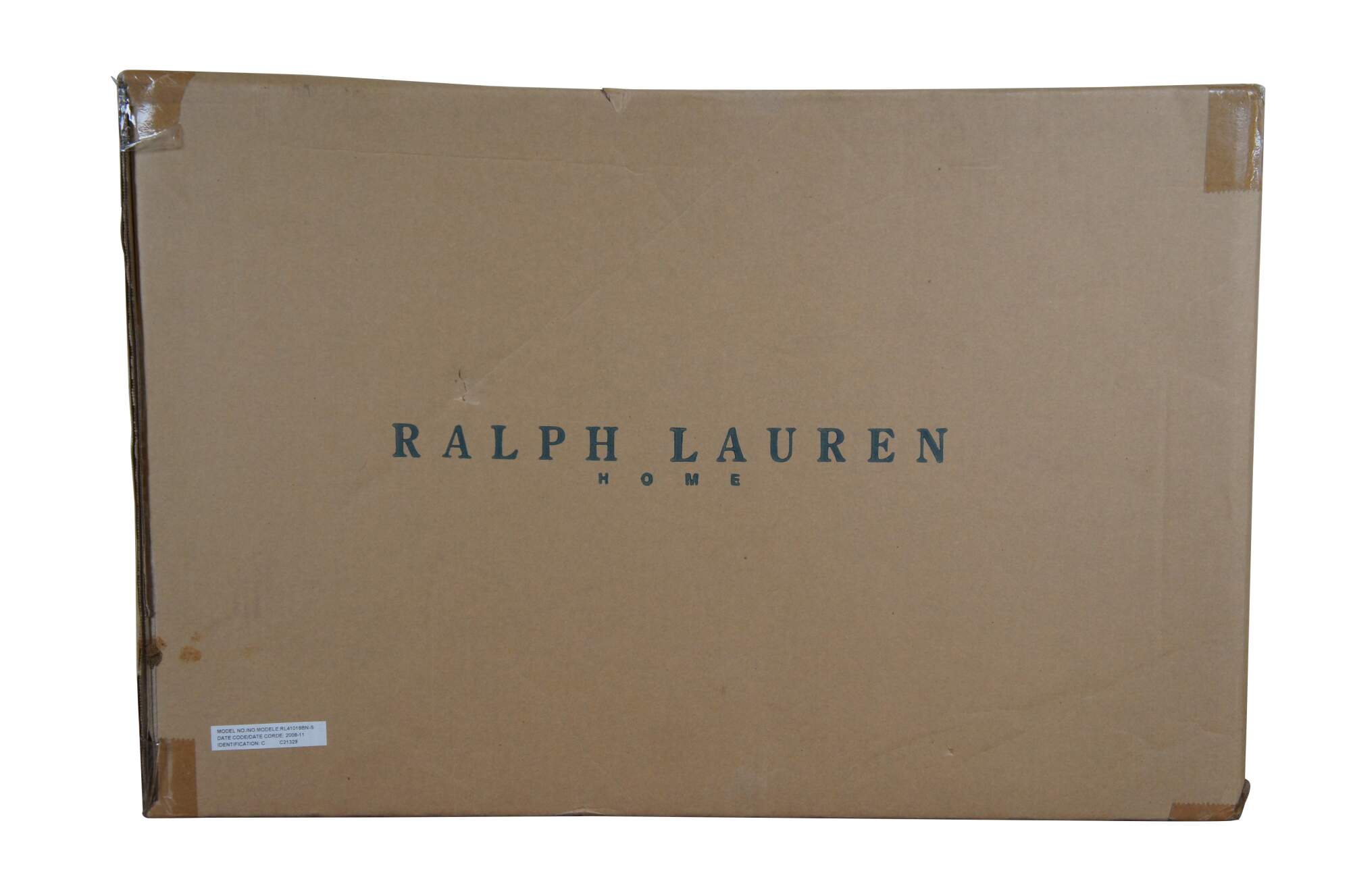 New in box Ralph Lauren Home Saddle Leather Hurricane: Small. Finish: Natural Brass. These pieces are no longer in production and very unique. The sculptural hurricane candleholders are part of the timeless home collection by Ralph Lauren. Constructed in saddle leather, patinated brass and glass. The shape of these models is perfectly classic and timeless. Ideal for placement on side tables in a living room, or in a dining room, as a centerpiece. Model No: RL41018BH-S. Date Code: 2008-11. Identification: C211329.
