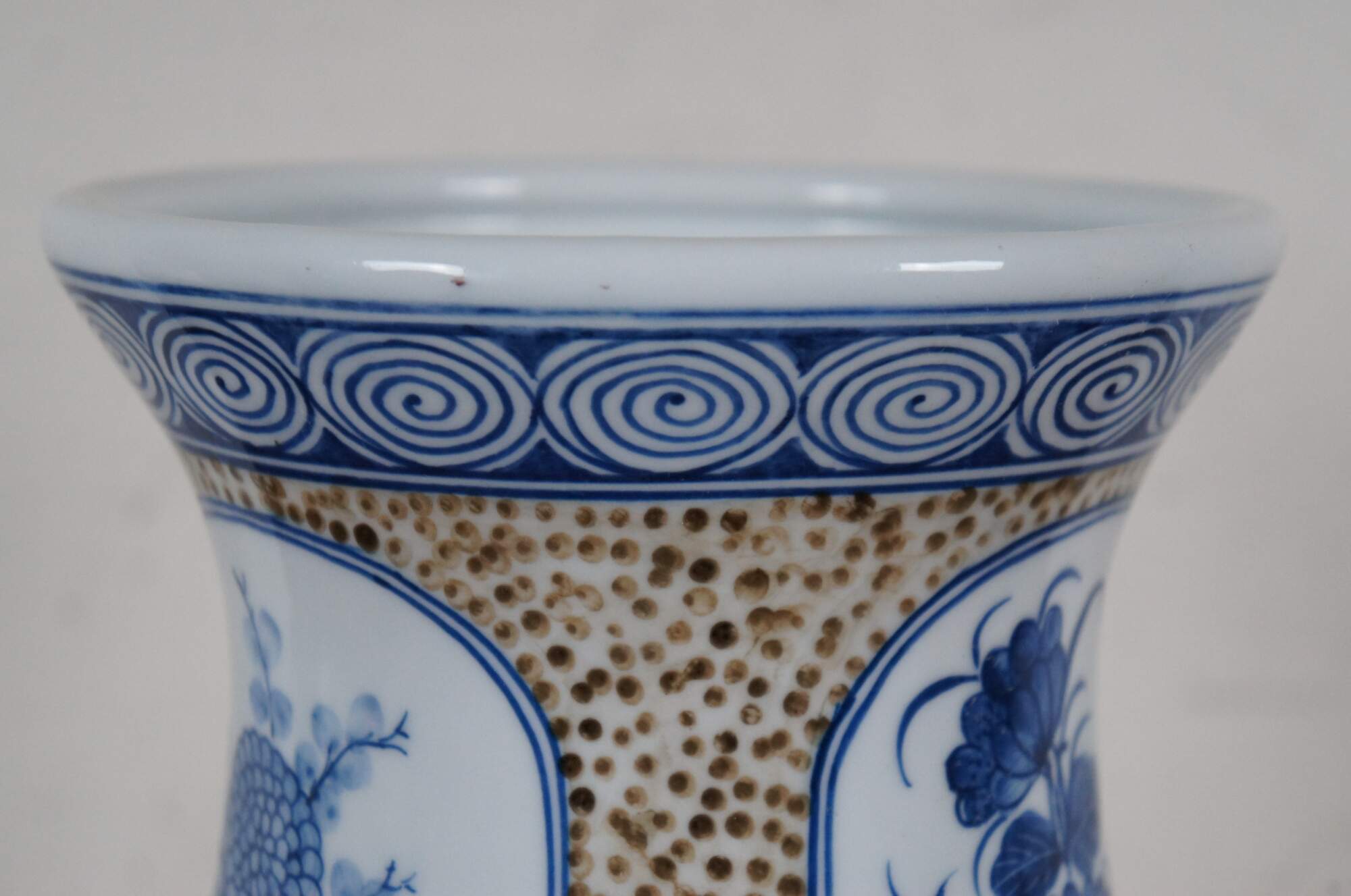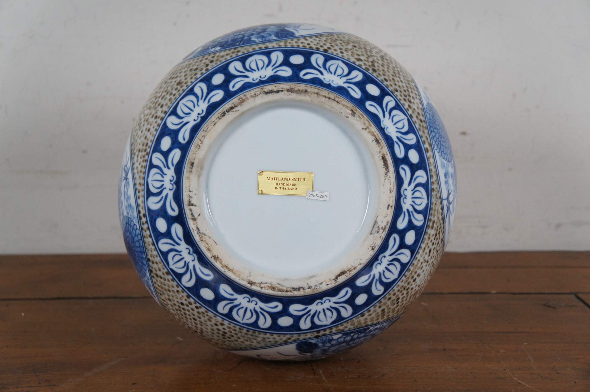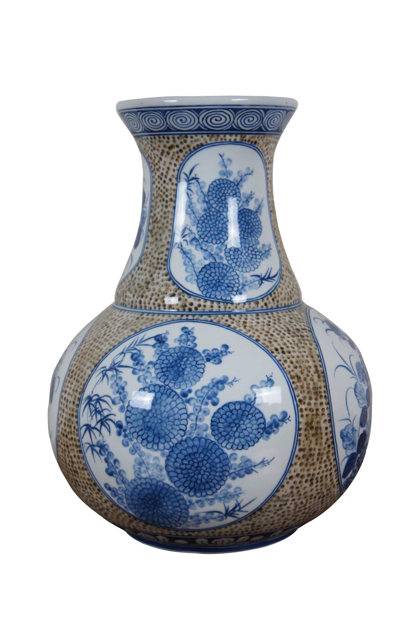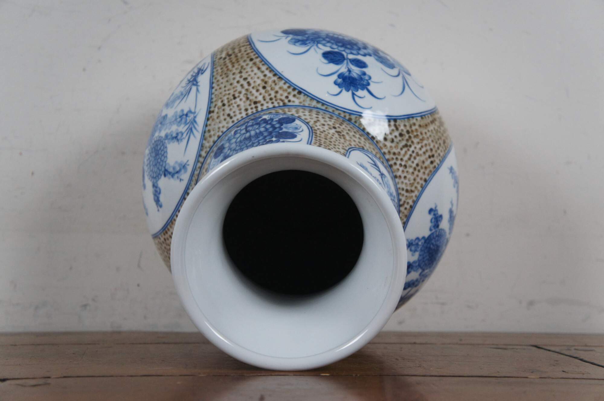 Late 20th century porcelain vase / urn by Maitland Smith. Features round panels of chinoiserie floral designs, framed in a background of speckled brown and a pattern of spirals around the rim. Hand Made in Thailand. 2185-259.