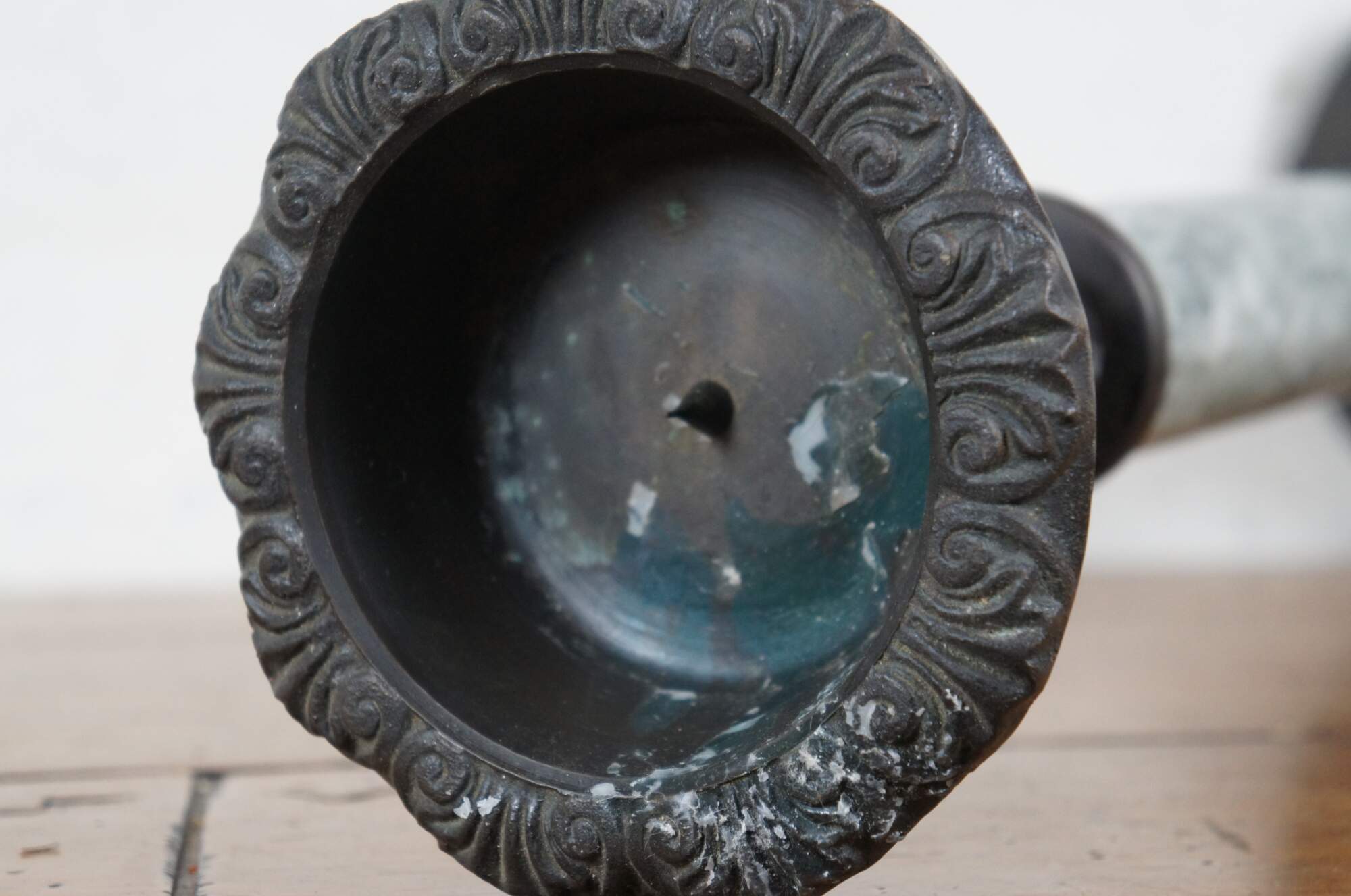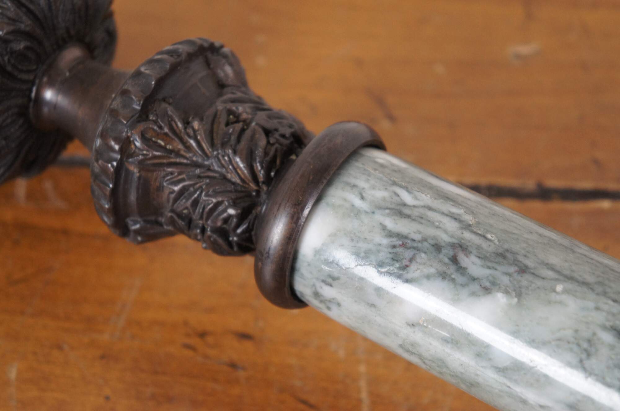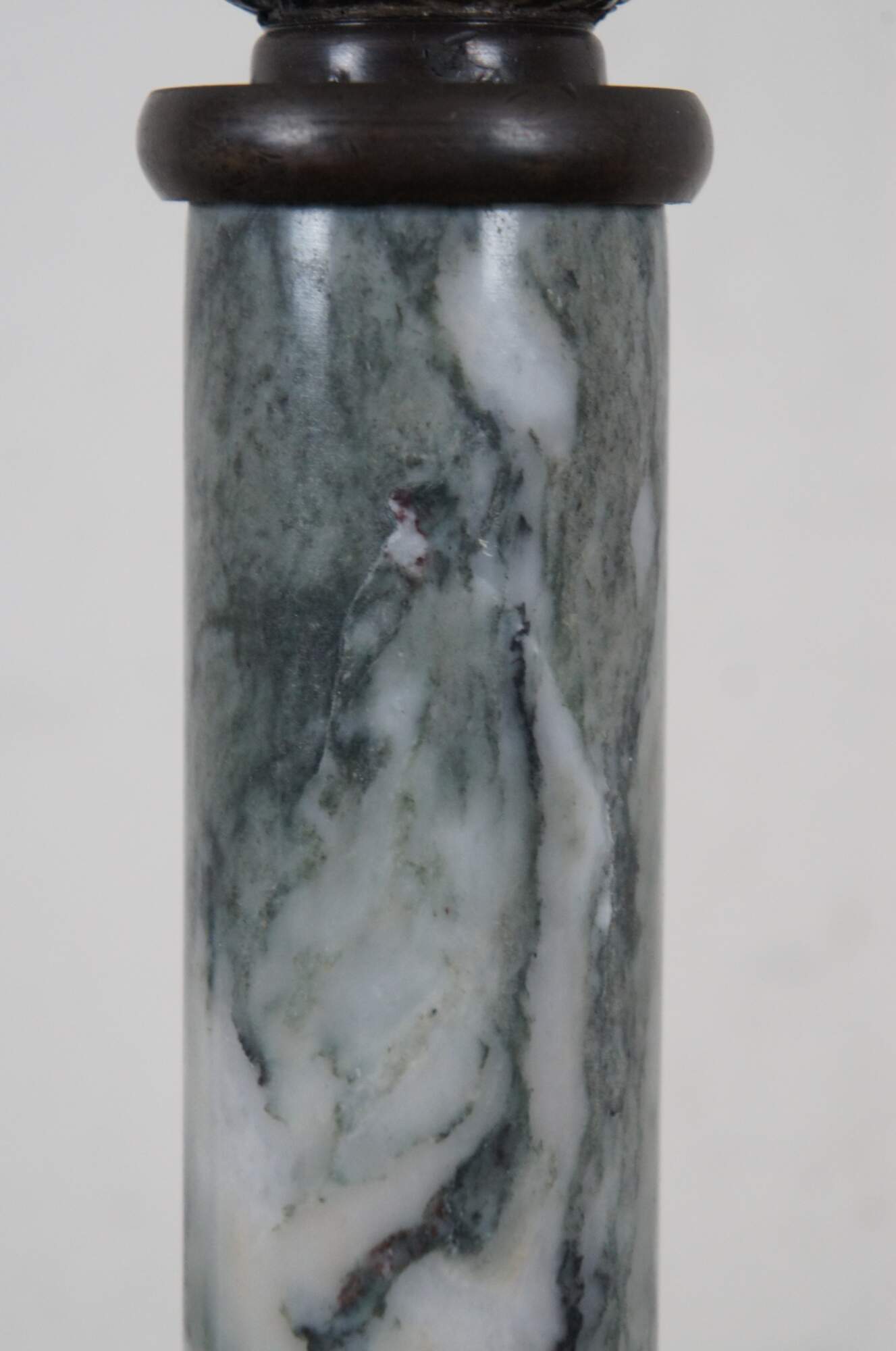 Late 20th century candle holder. Features a Baroque Classical design with a marble column center flanked by ornate bronze. Made in Thailand.