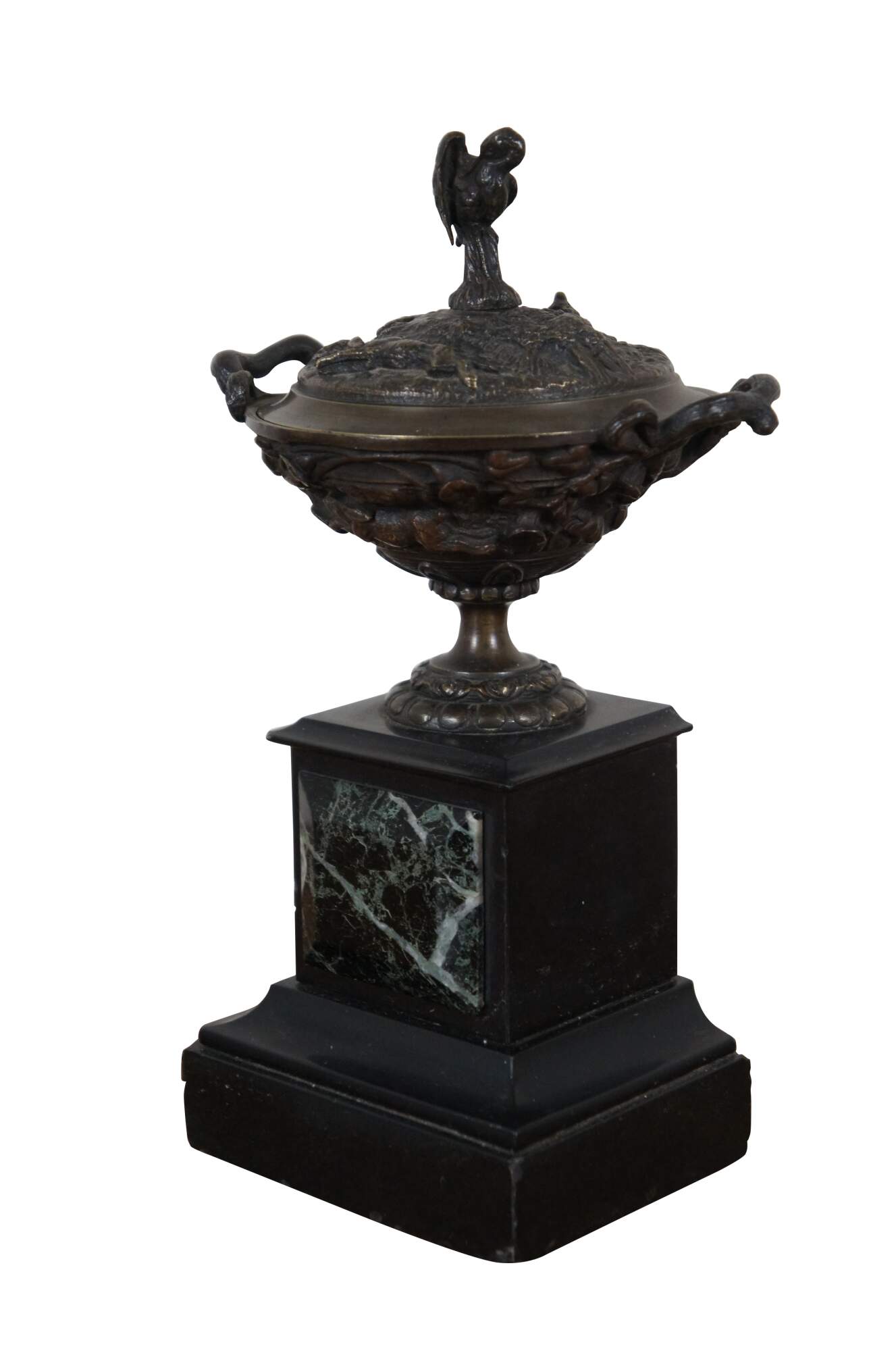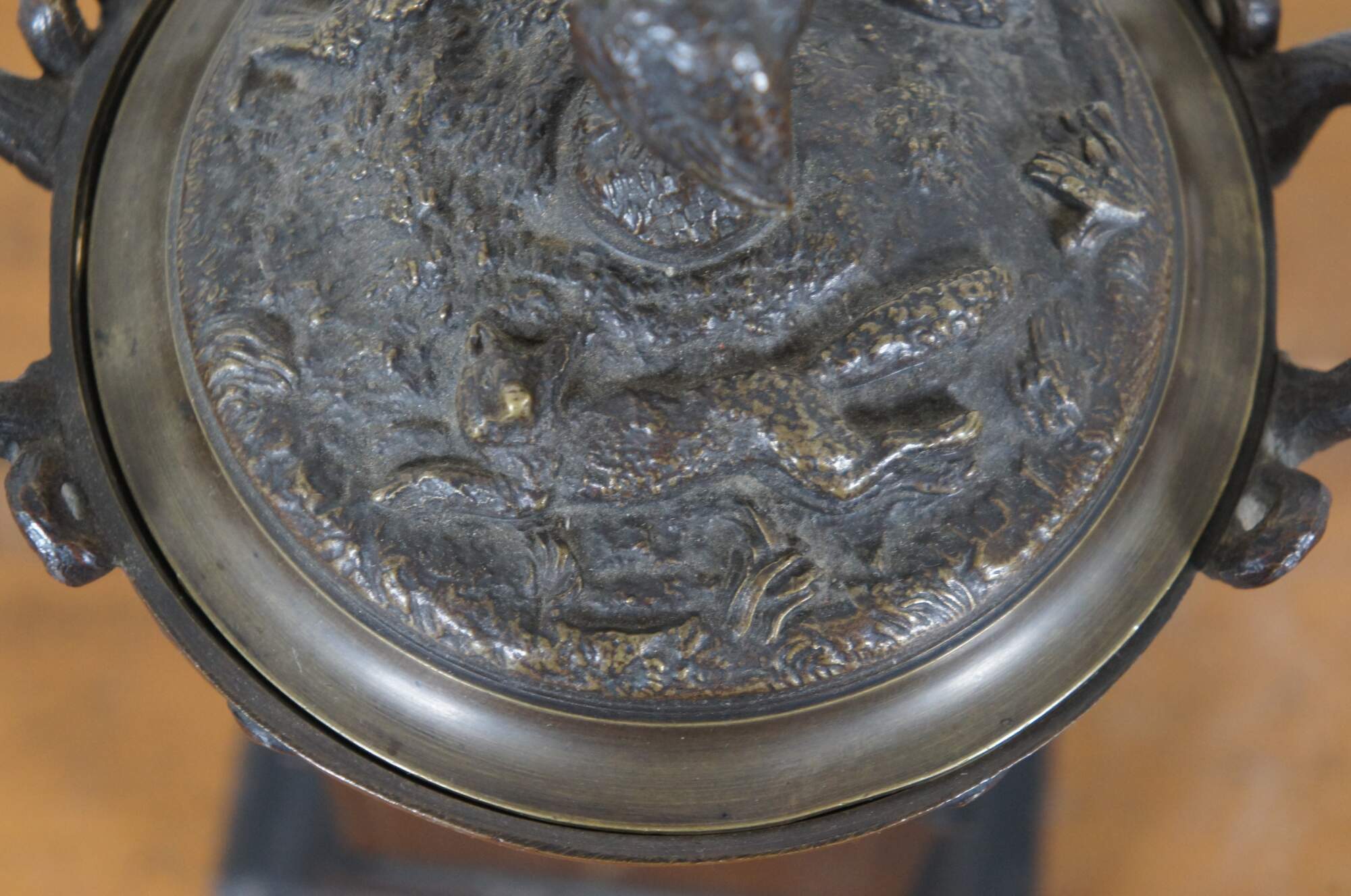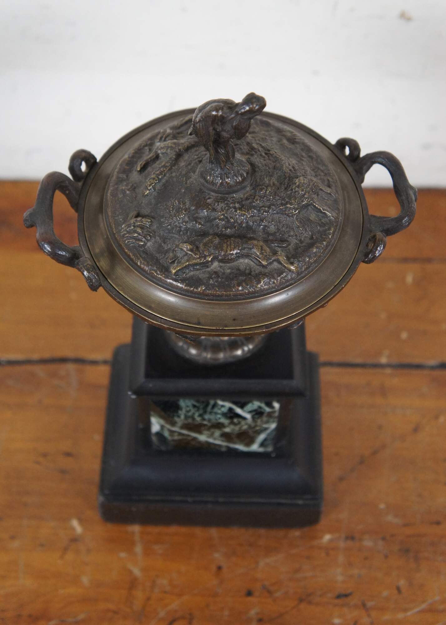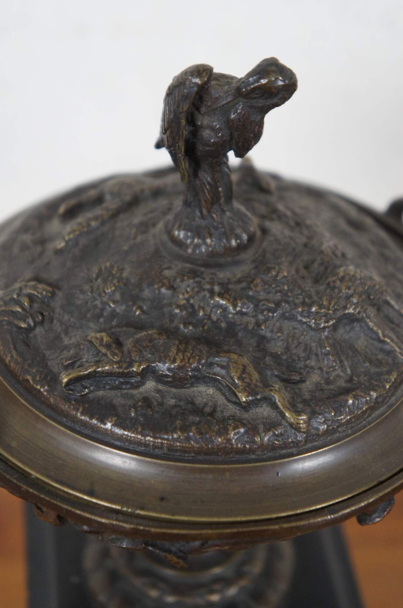Antique French mantel clock garniture / cassolette vase / trophy urn / bookend featuring a black stepped pedestal base set with a green and black marble panel, topped with a cast bronze coupe shaped lidded urn, featuring a flowering hunt theme landscape with game animals - a goose, rabbit, fox and hound - centered around a crane / bird shaped finial and branch shaped handles.