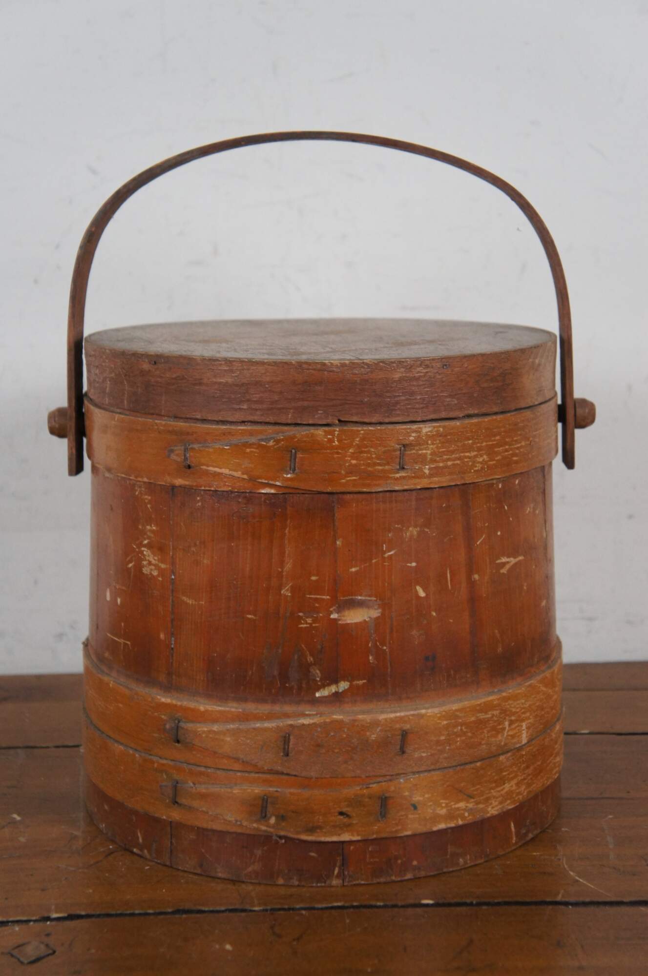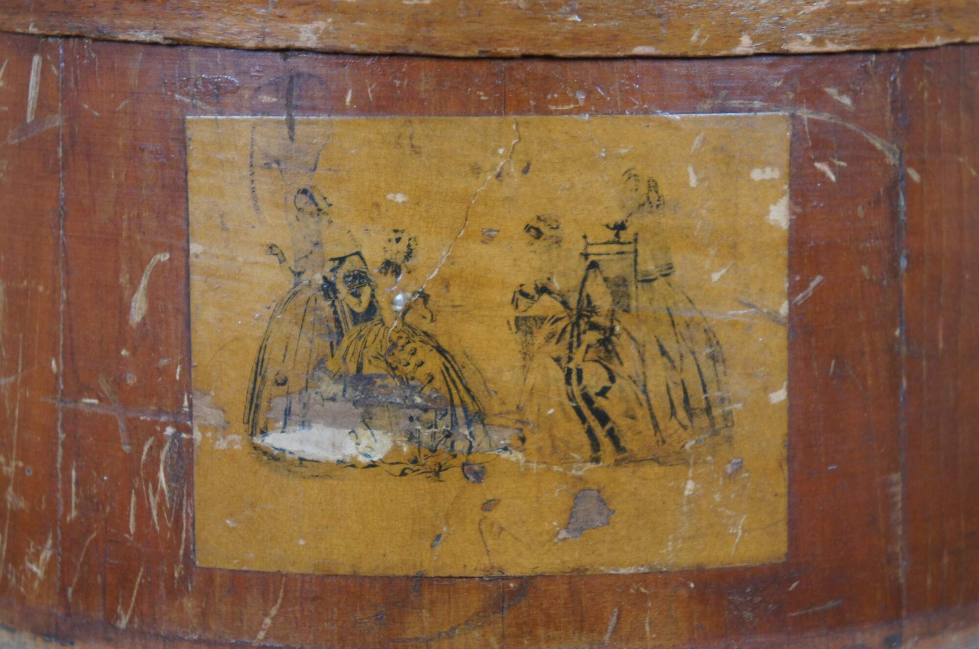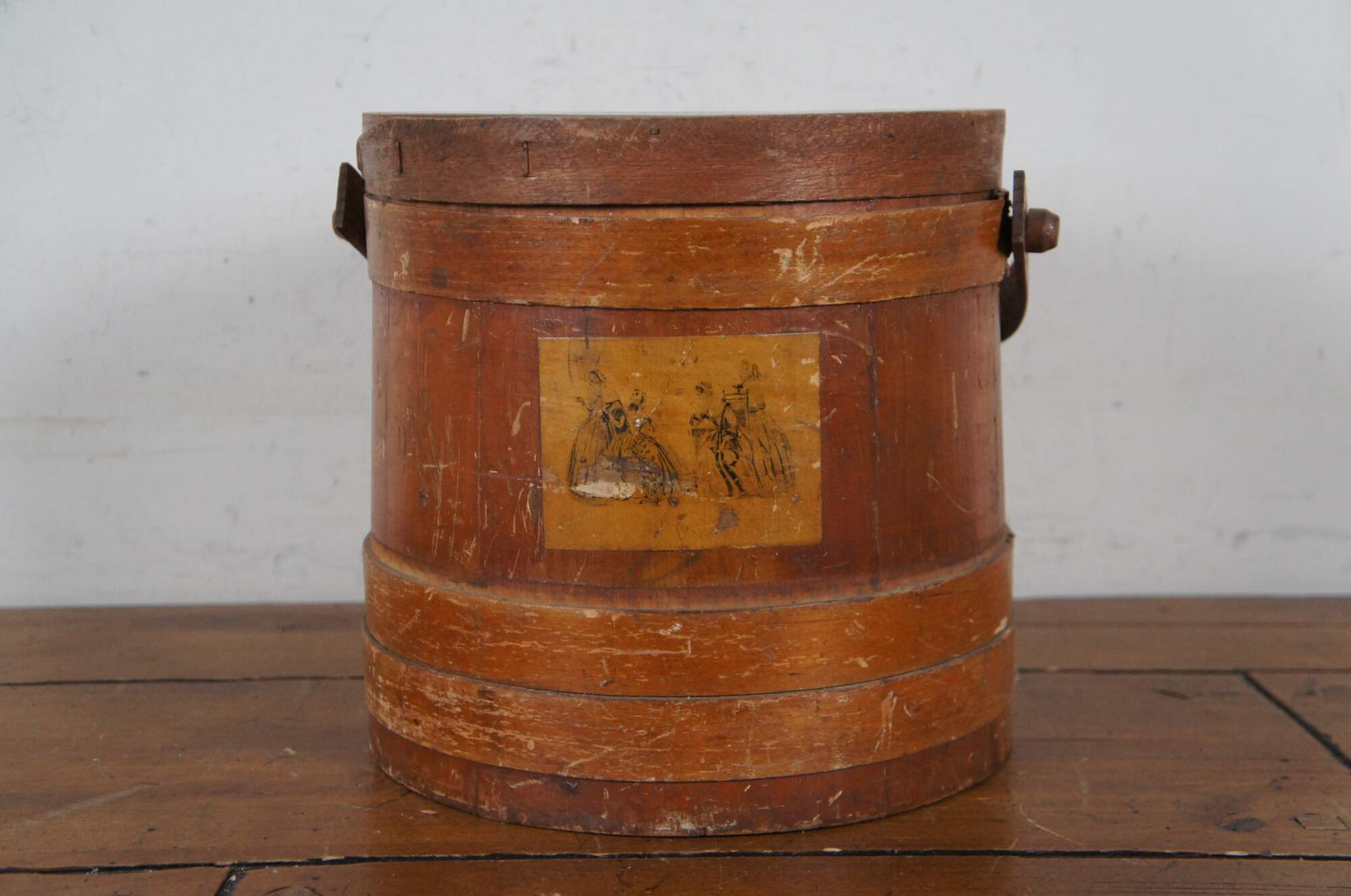 Antique pine farmhouse firkin / sugar stroage bucket with paneled sides, banded lid and rotating bail handle. Decoupaged on one side with small fashion plate of women in mid Victorian clothing.