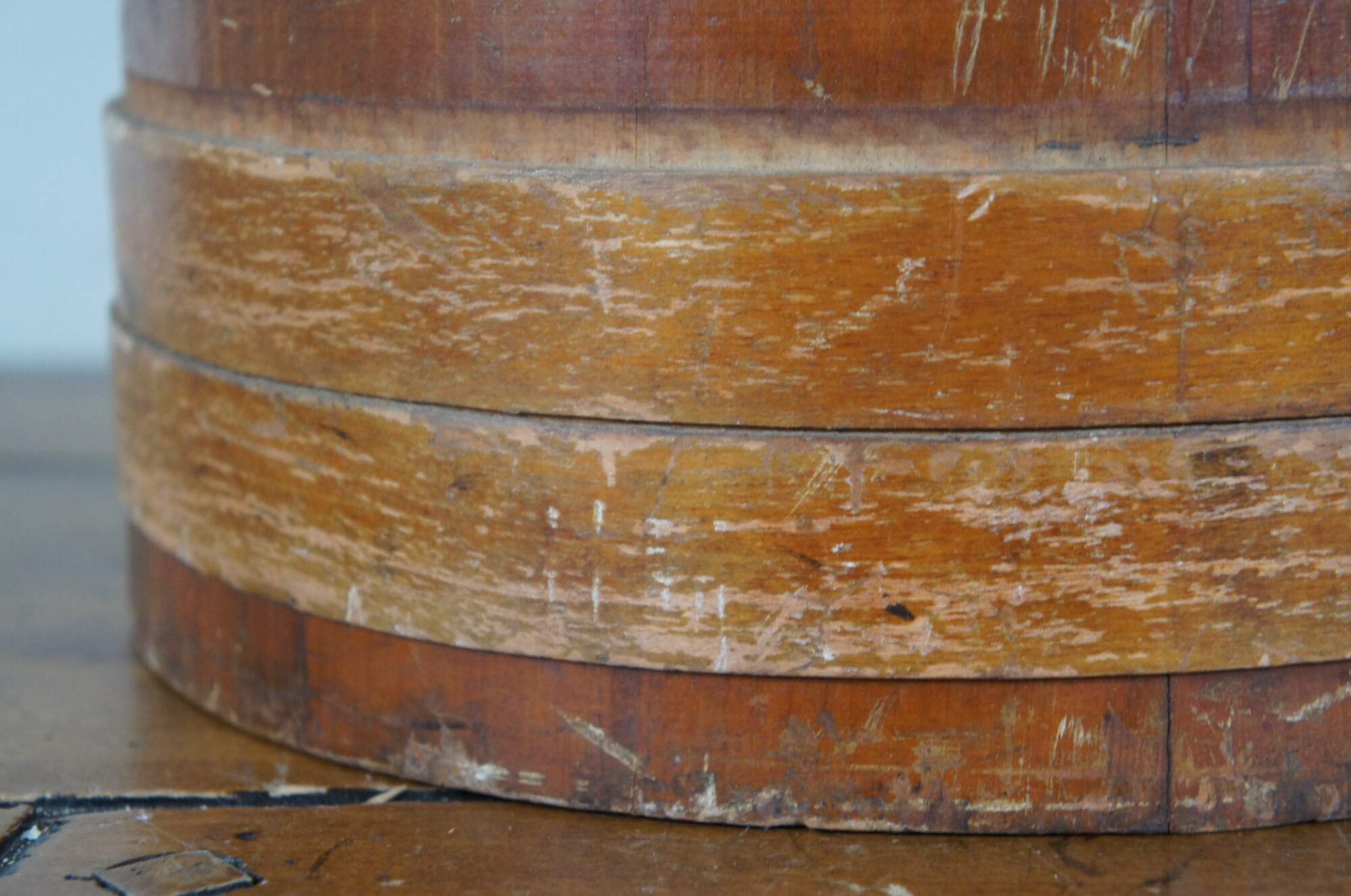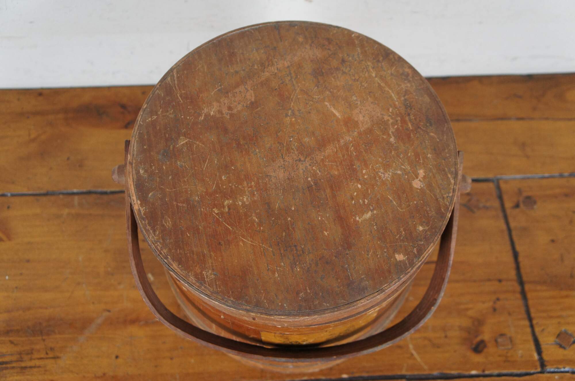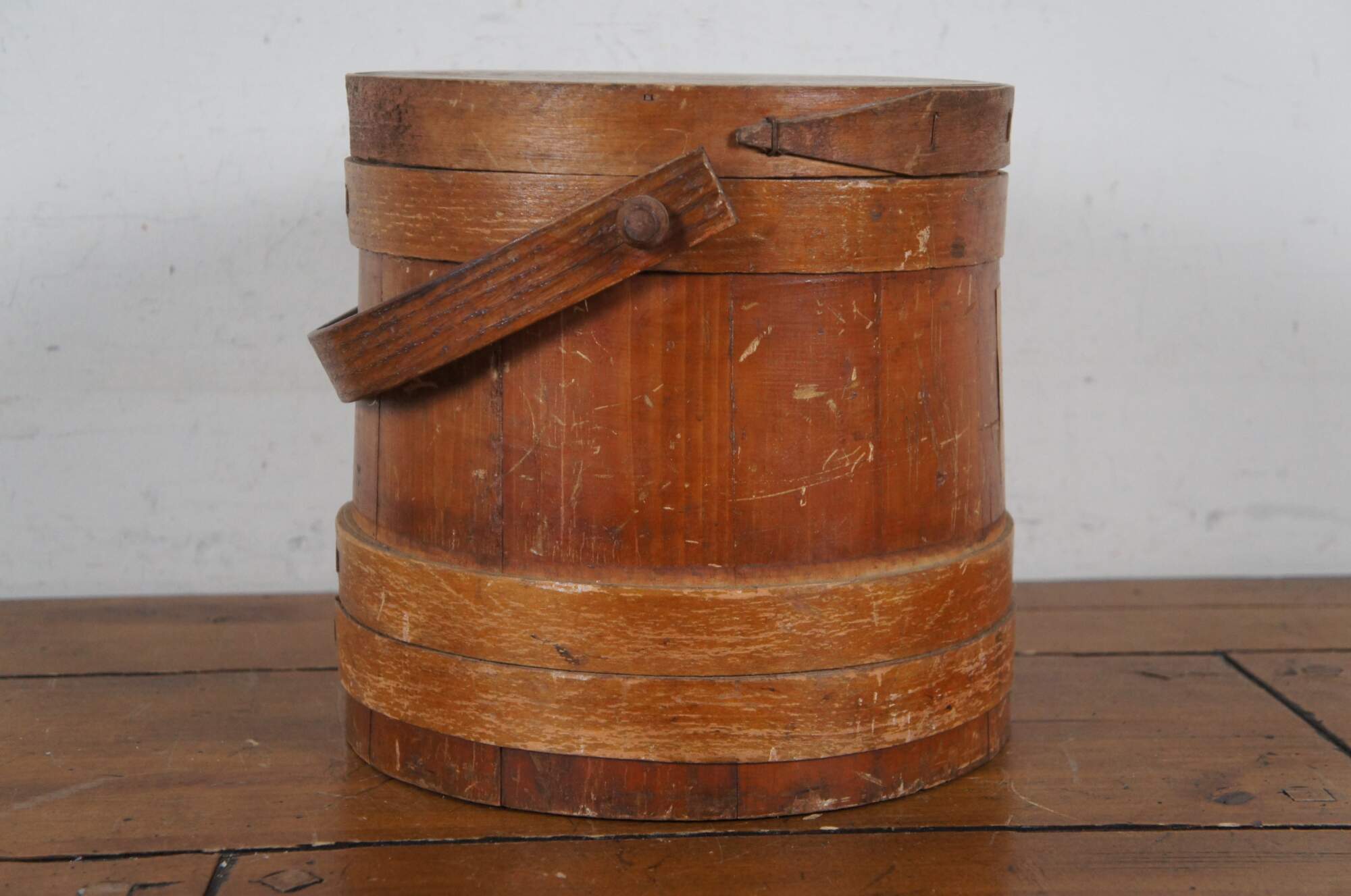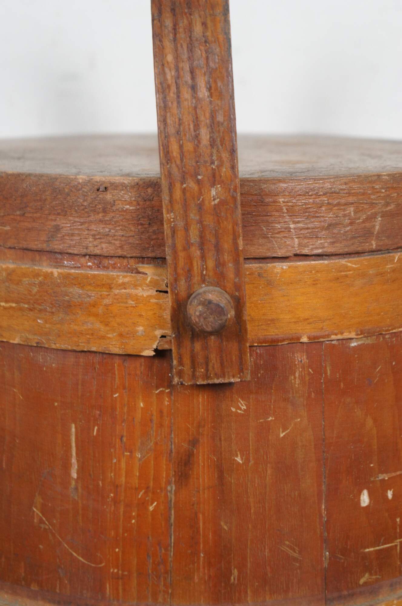 Antique pine farmhouse firkin / sugar stroage bucket with paneled sides, banded lid and rotating bail handle. Decoupaged on one side with small fashion plate of women in mid Victorian clothing.