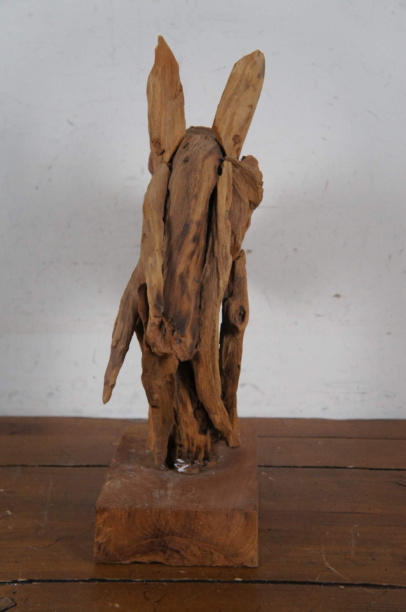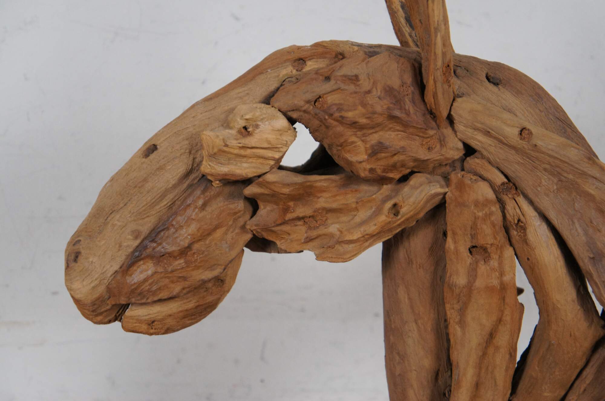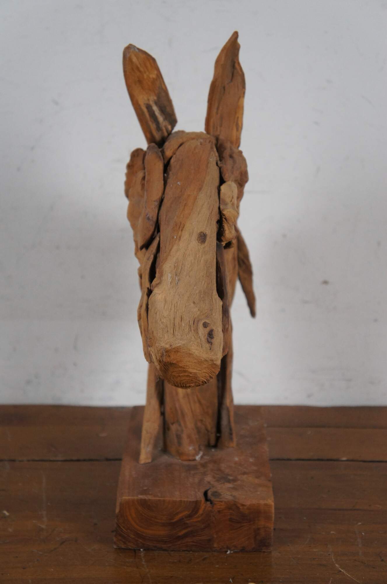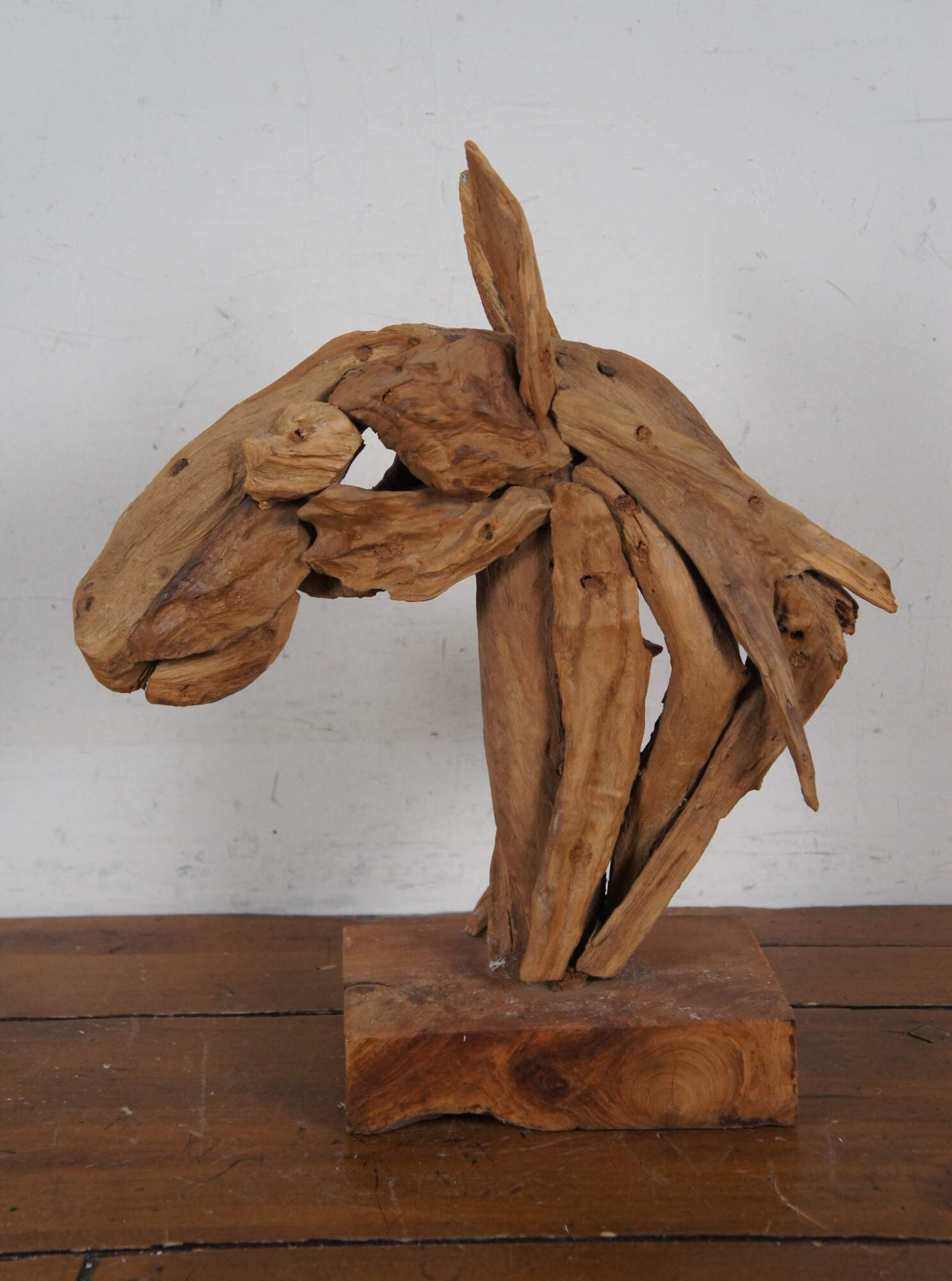 Vintage 20th century bust / sculptur depicting a semi-abstract horse's head crafted of pieces of driftwood, mounted on a rectangular burl wood base.