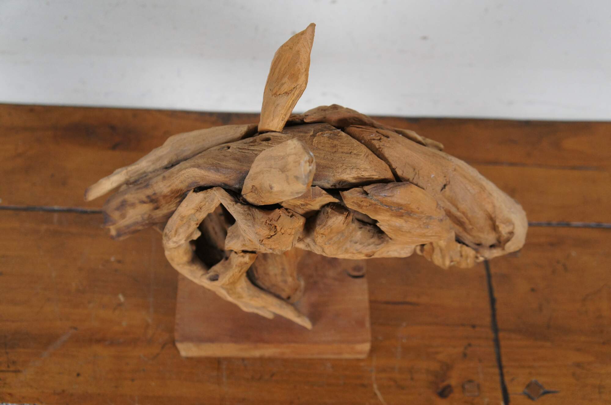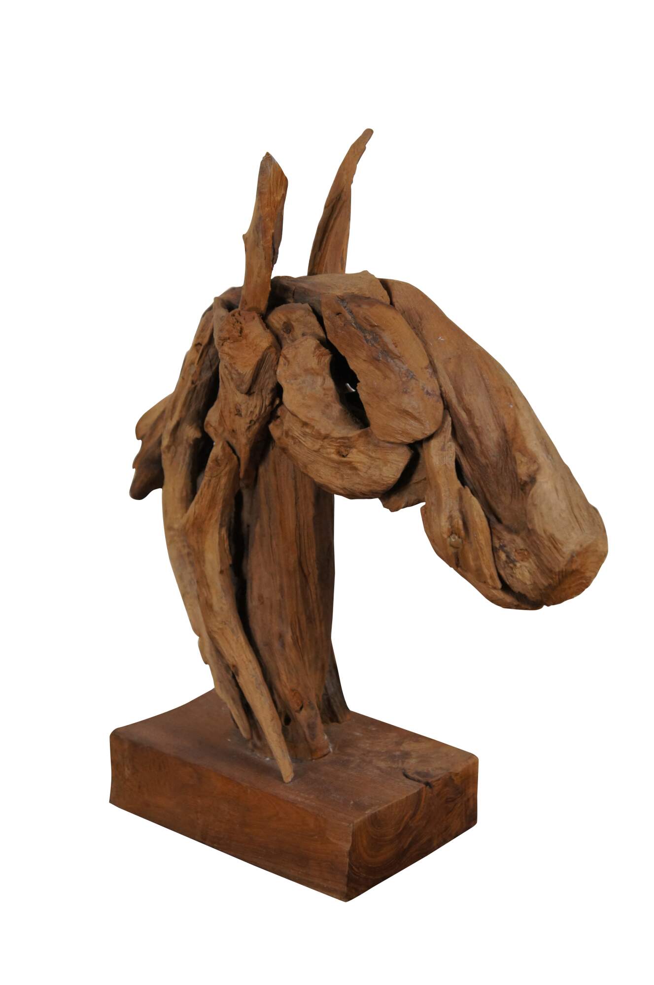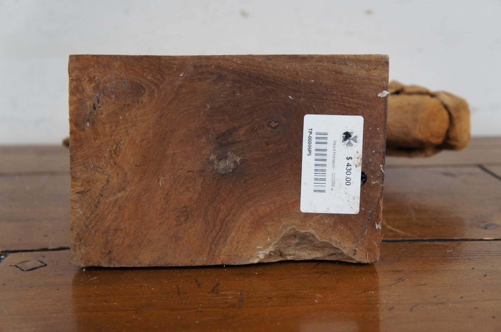 Vintage 20th century bust / sculptur depicting a semi-abstract horse's head crafted of pieces of driftwood, mounted on a rectangular burl wood base.