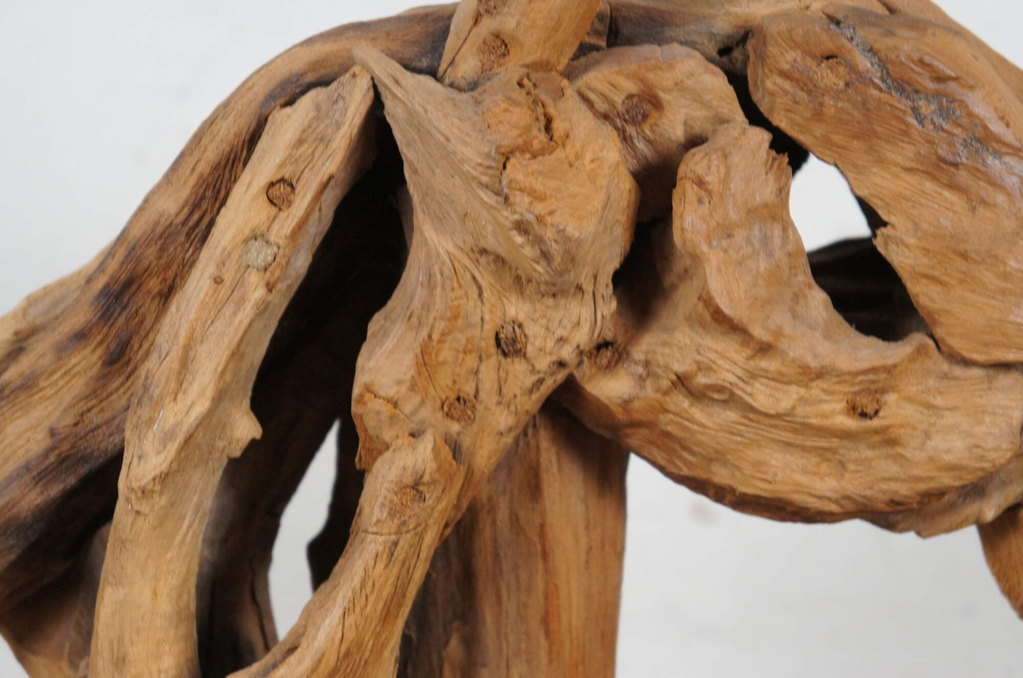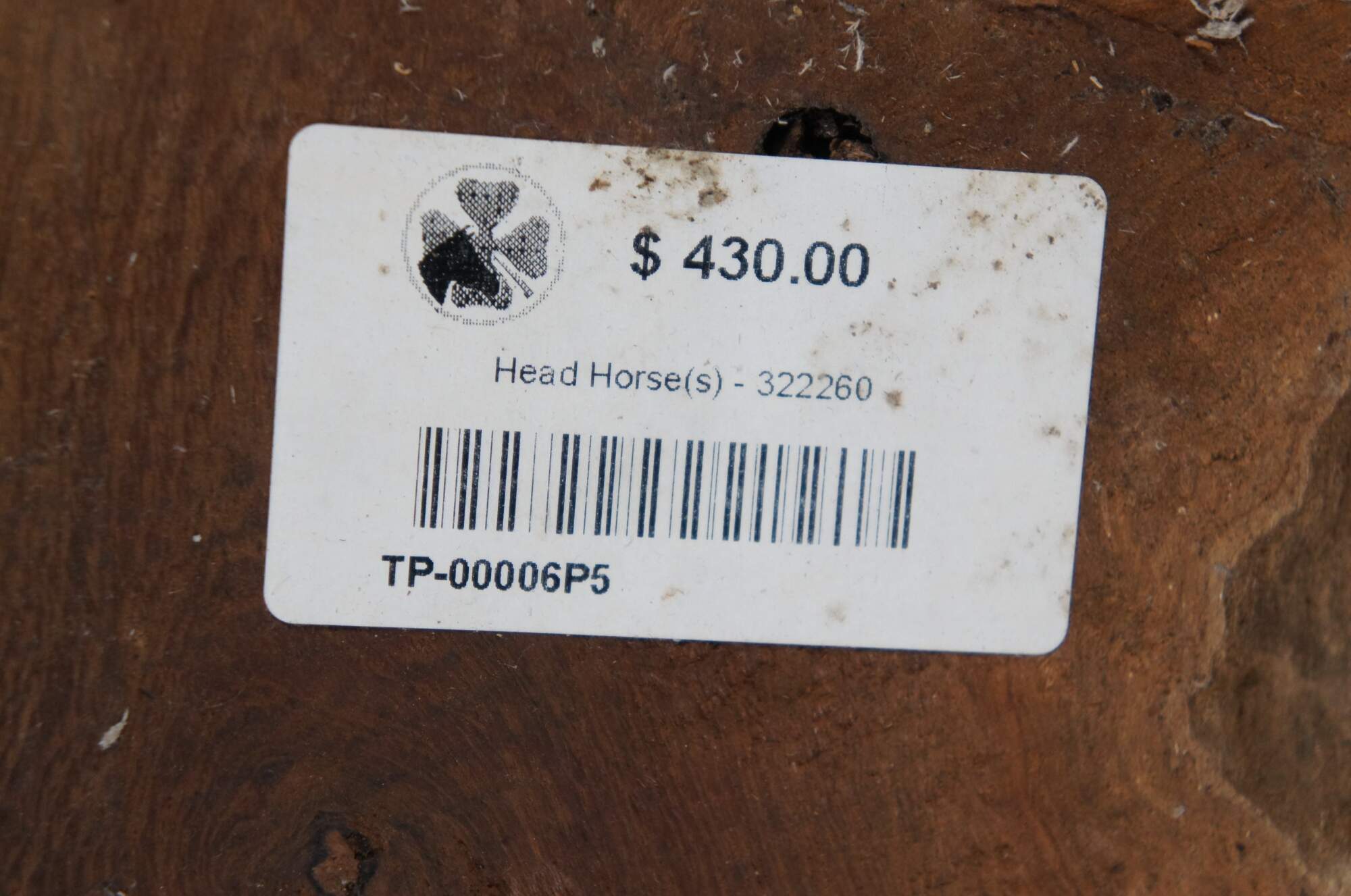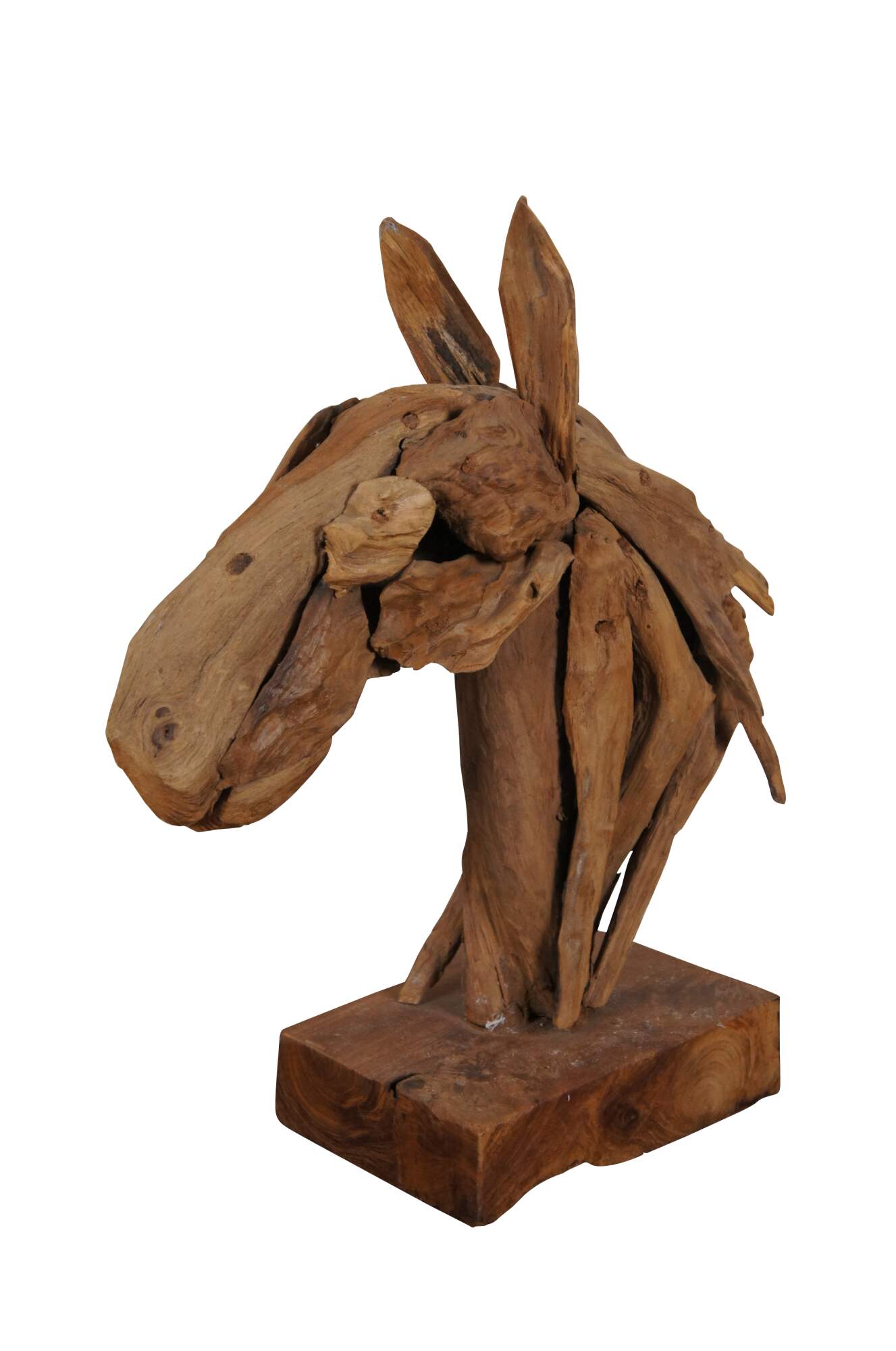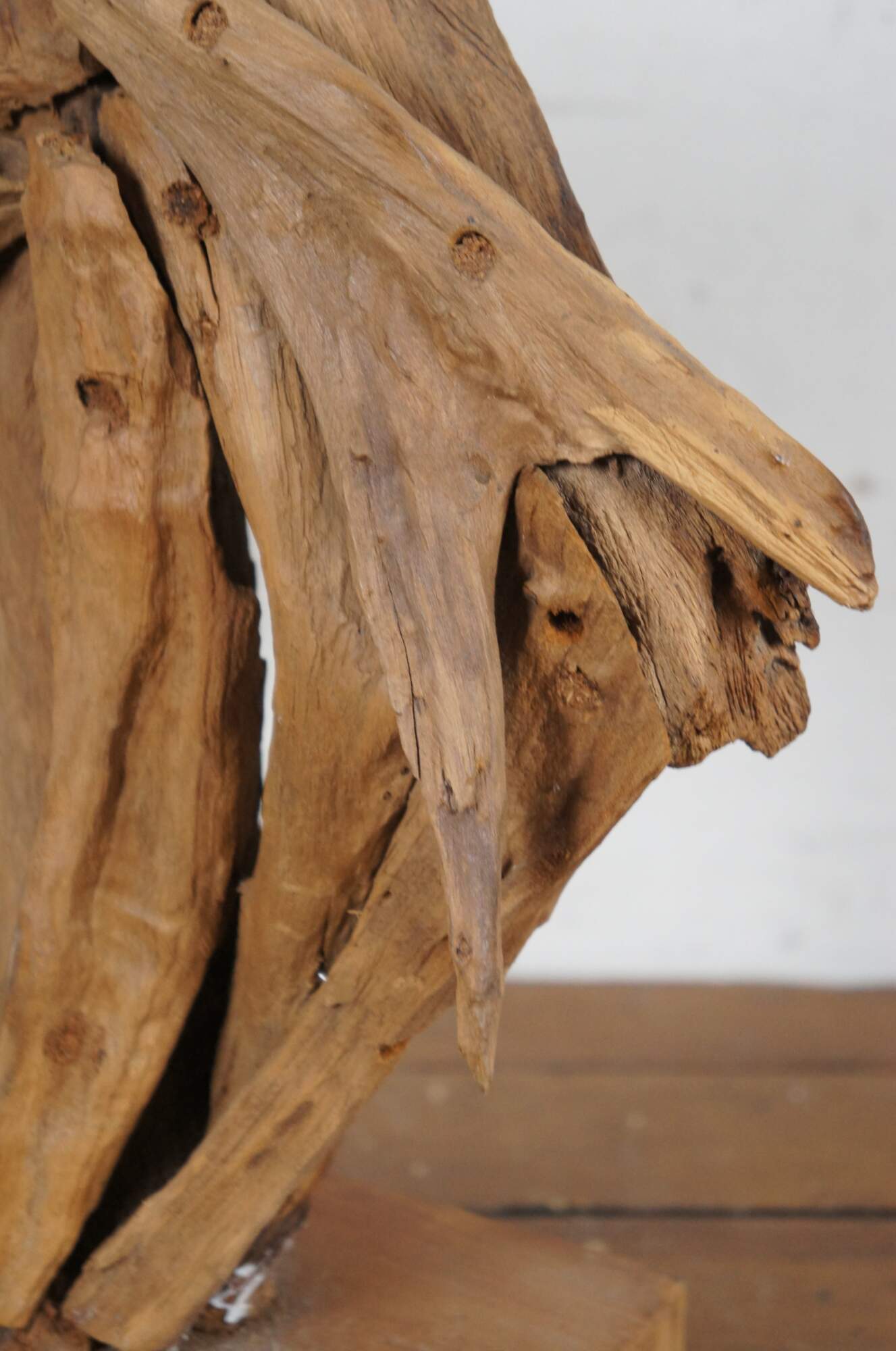 Vintage 20th century bust / sculptur depicting a semi-abstract horse's head crafted of pieces of driftwood, mounted on a rectangular burl wood base.