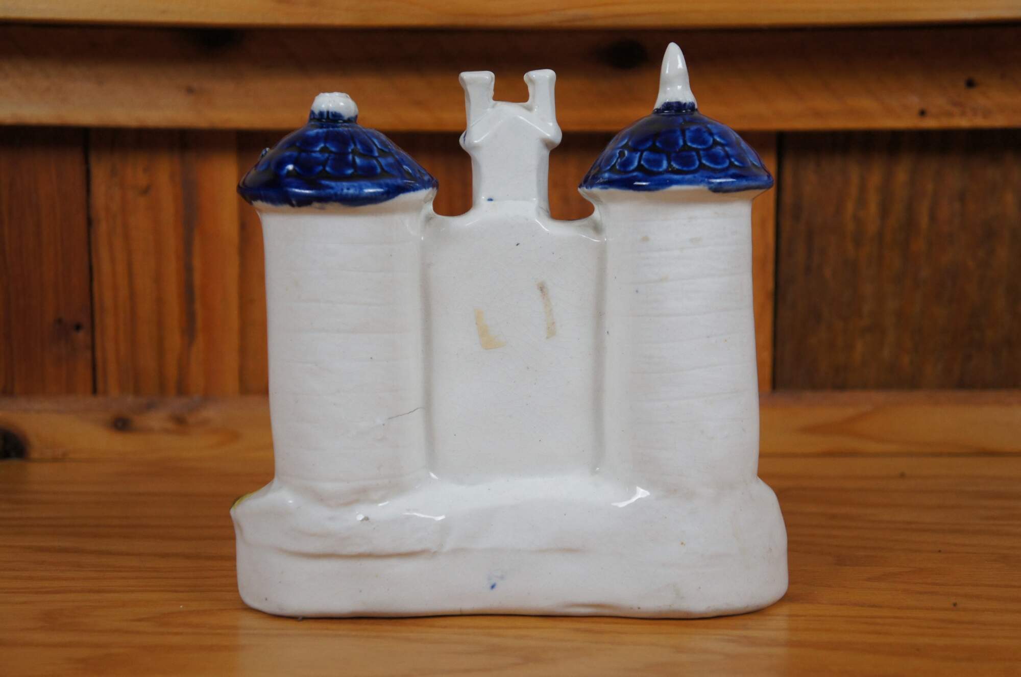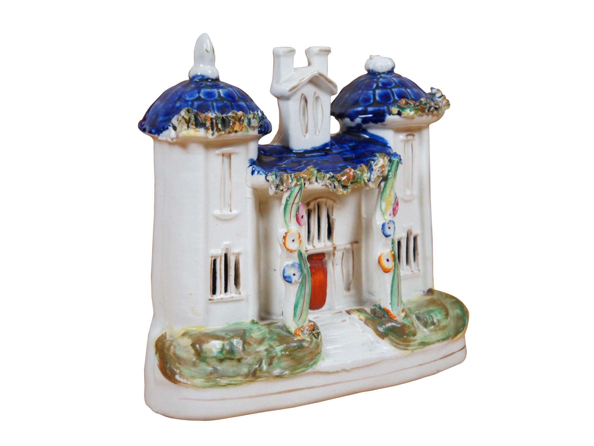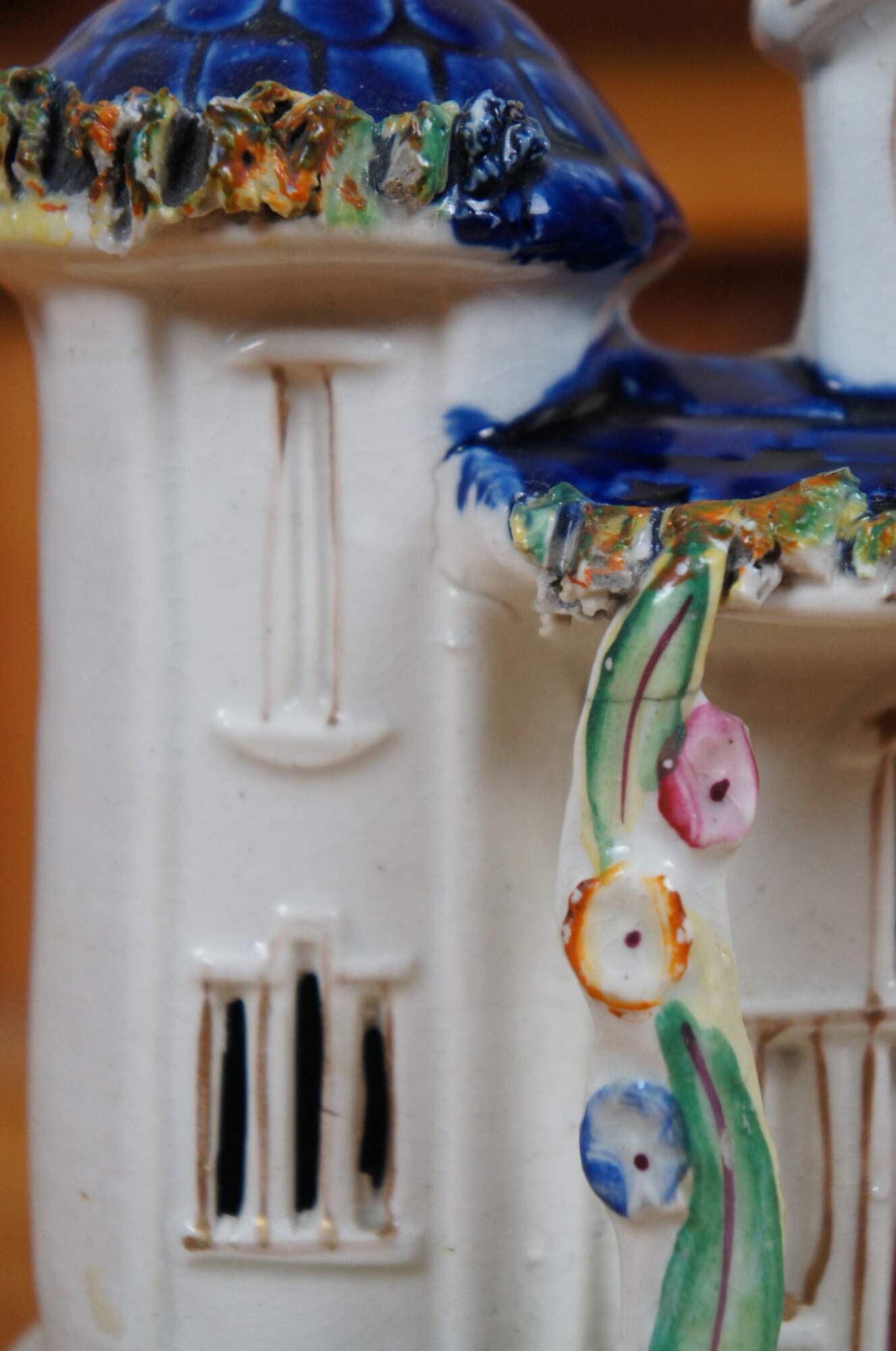 Antique 19th century English Staffordshire porcelain flatback figurine in the shape of a church / manor house / castle / pastille burner with three towers and blue roofs, front columns trimmed with flowering vines.