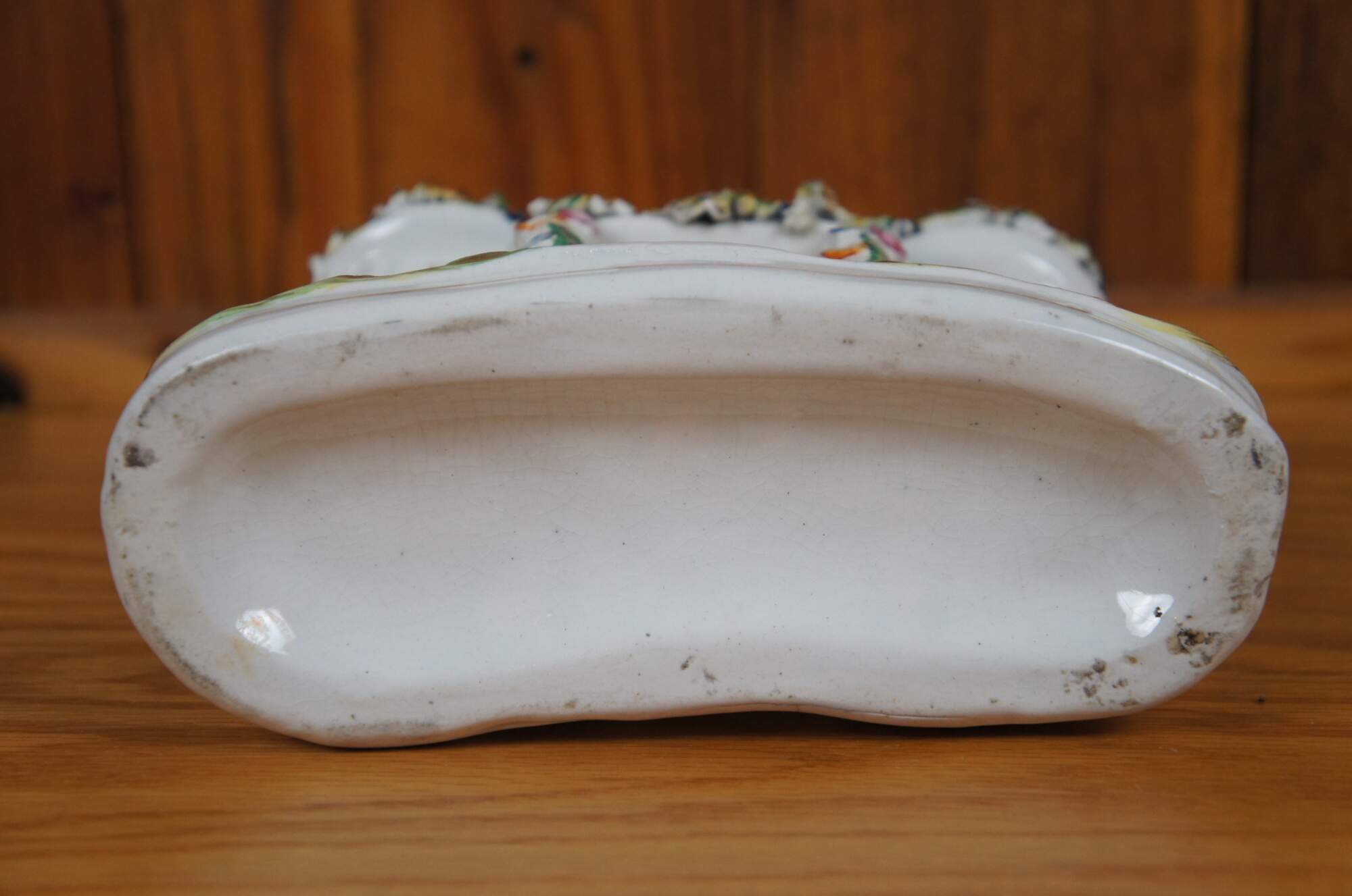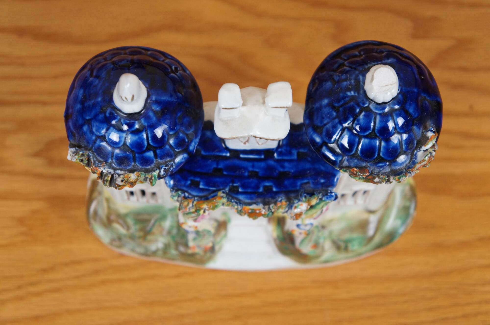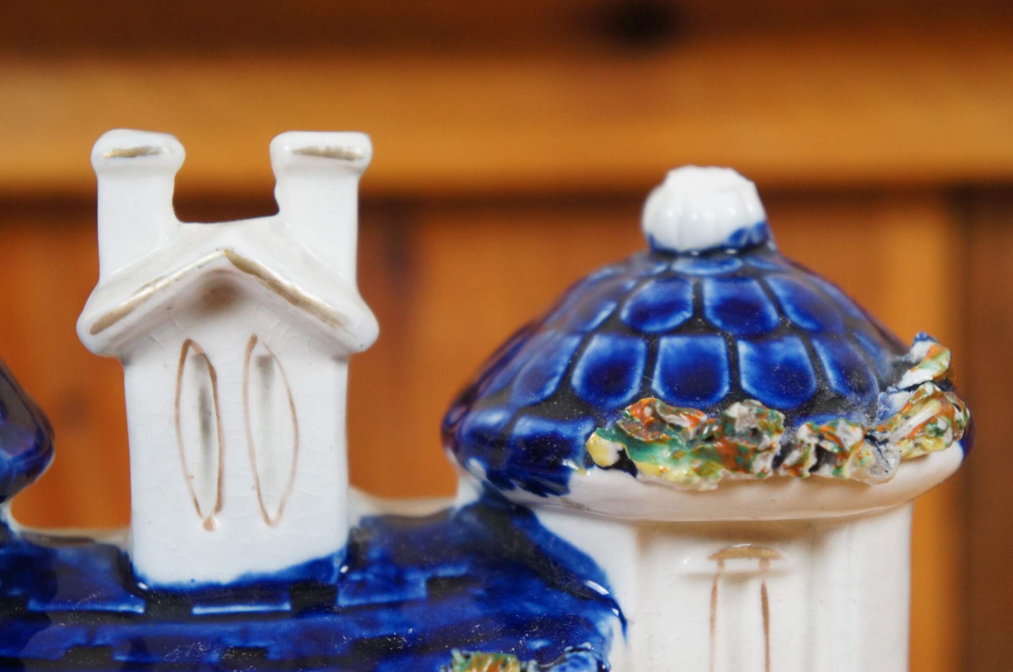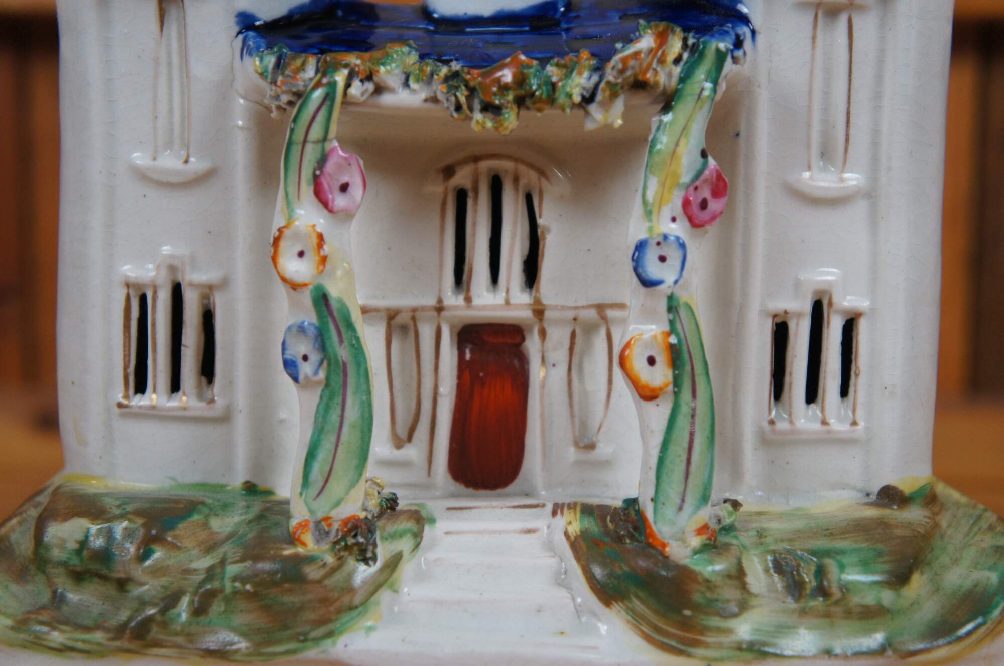 Antique 19th century English Staffordshire porcelain flatback figurine in the shape of a church / manor house / castle / pastille burner with three towers and blue roofs, front columns trimmed with flowering vines.