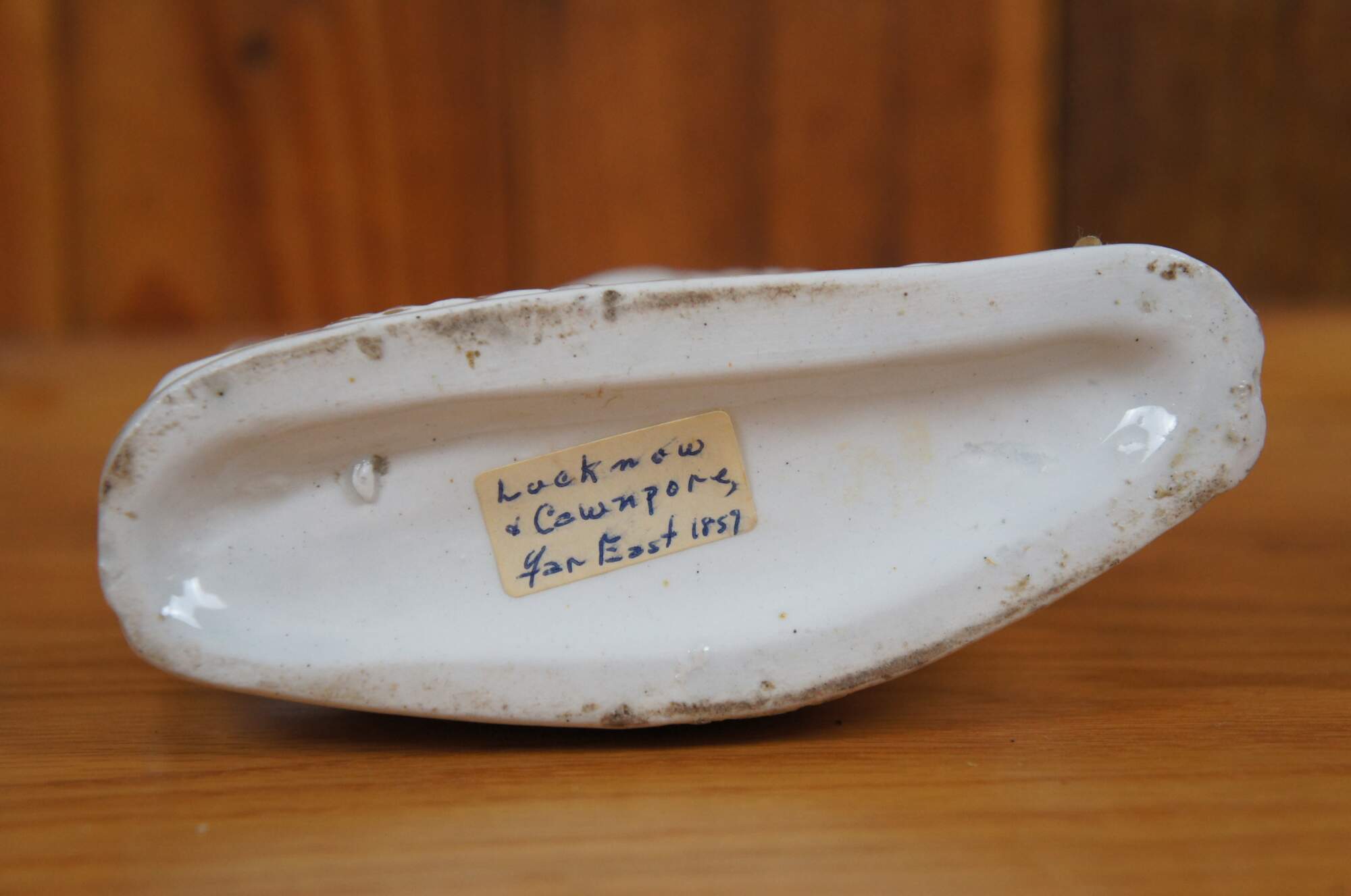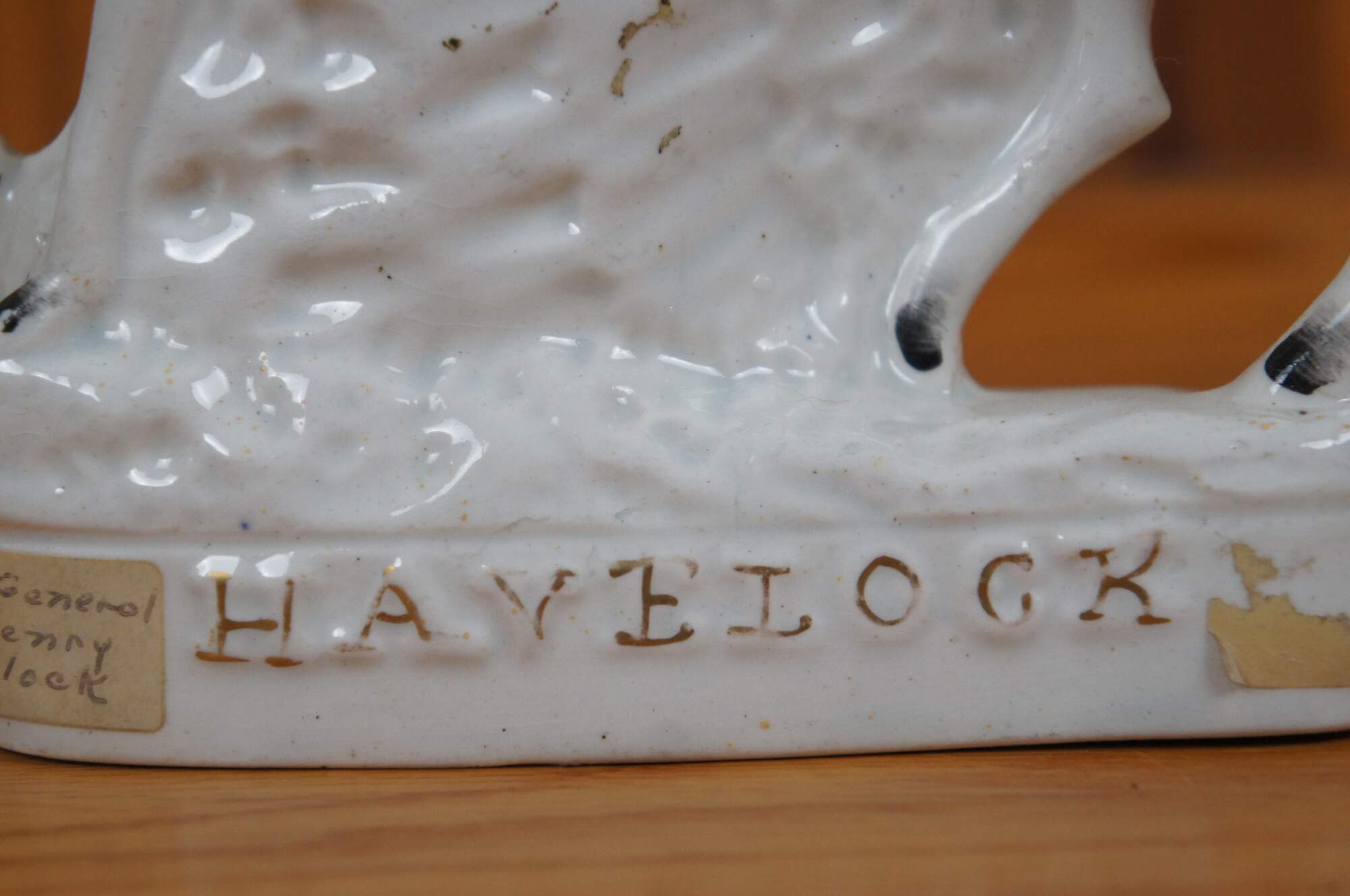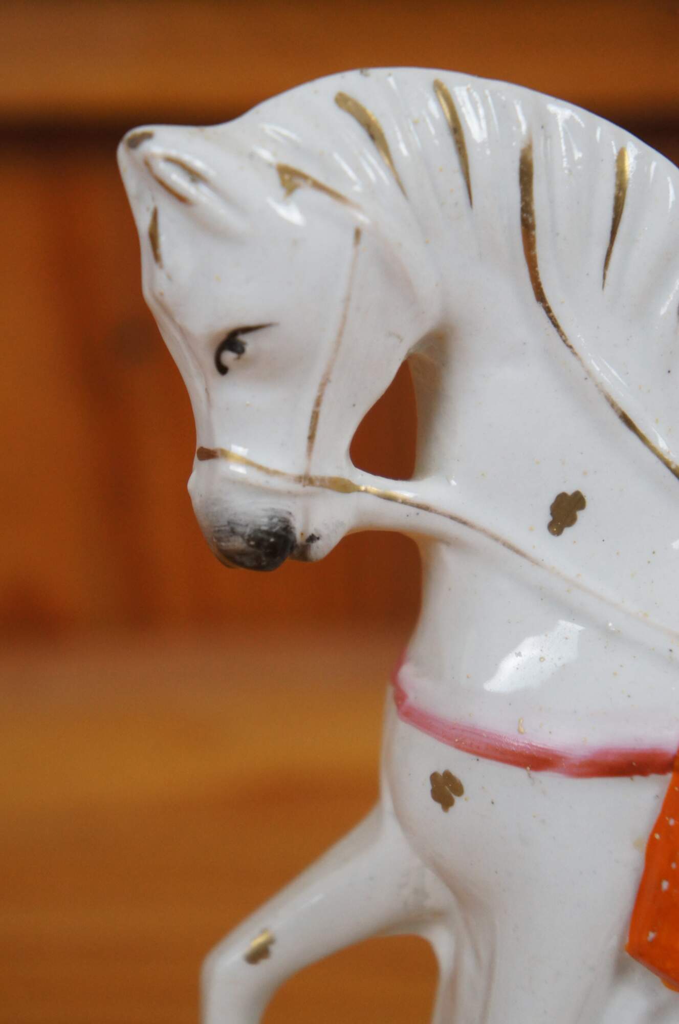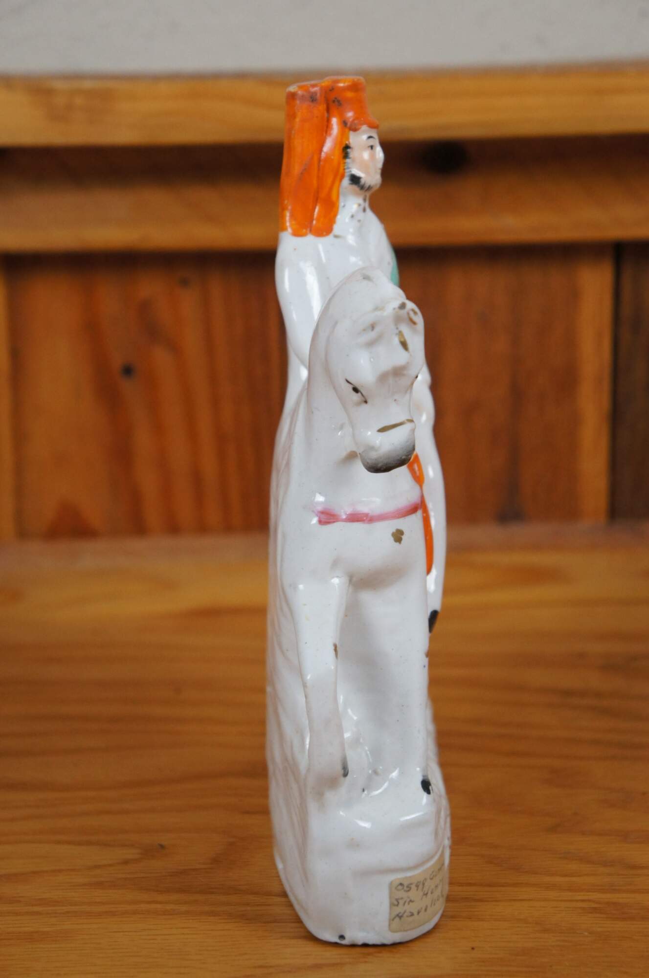Antique 19th century English Staffordshire porcelain flatback figurine depicting General Henry Havelock on horseback circa 1860 with a bright orange hat and saddle blanket. General Havelock (1795- 1857) served his military career largely in India where he died in 1857. He is entombed at Lucknow, India. He is depicted astride a powerful horse. He is in uniform with a sun curtain on his head a medal on his chest which appears to be the Order of British India. He was a revered figure in England and this figurine was cast to commemorate his death. He also has a statue in Trafalgar Square with this inscription at the base: " Your labors, your privations, your sufferings and your valour will not be forgotten by a grateful country".