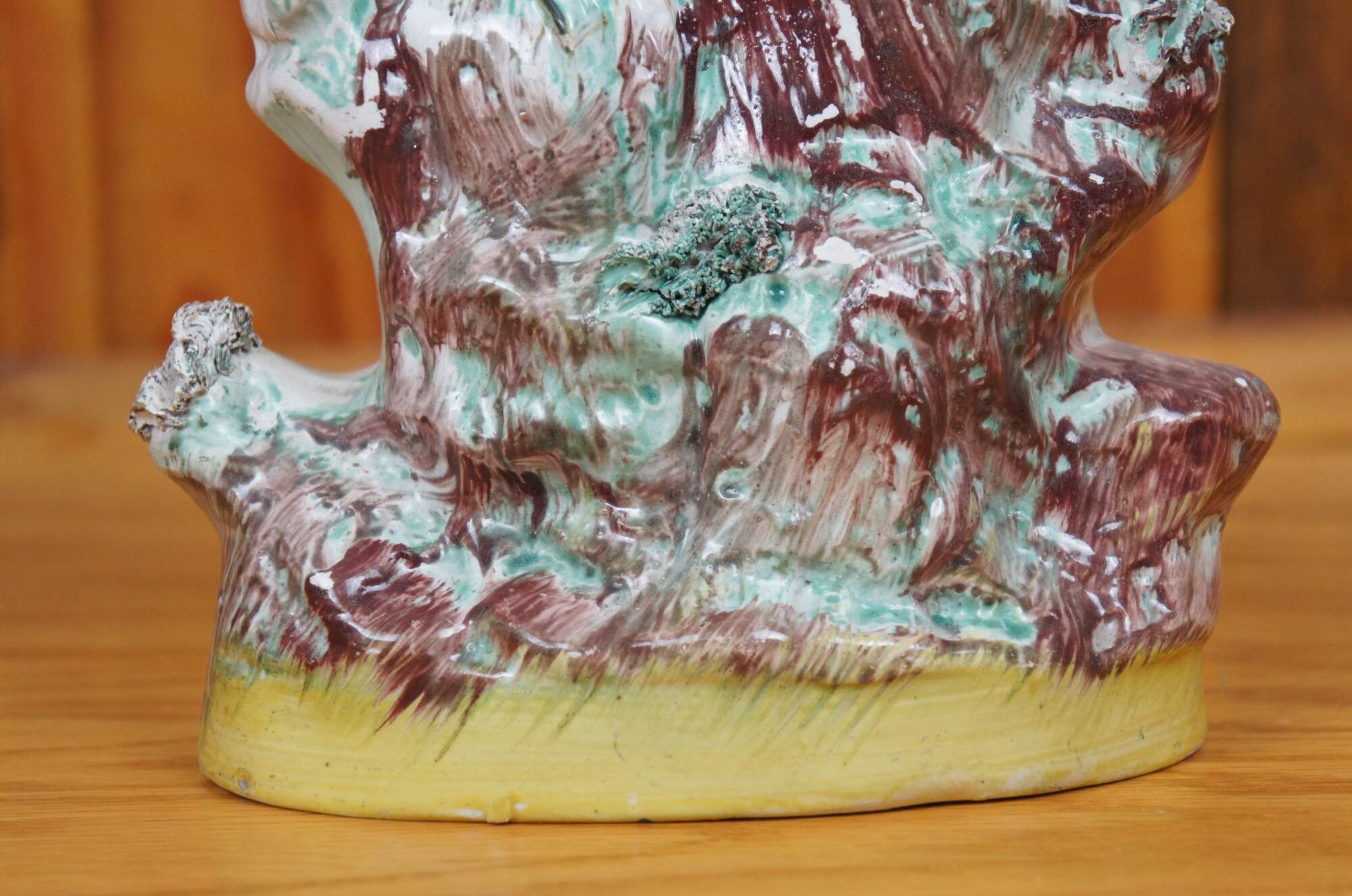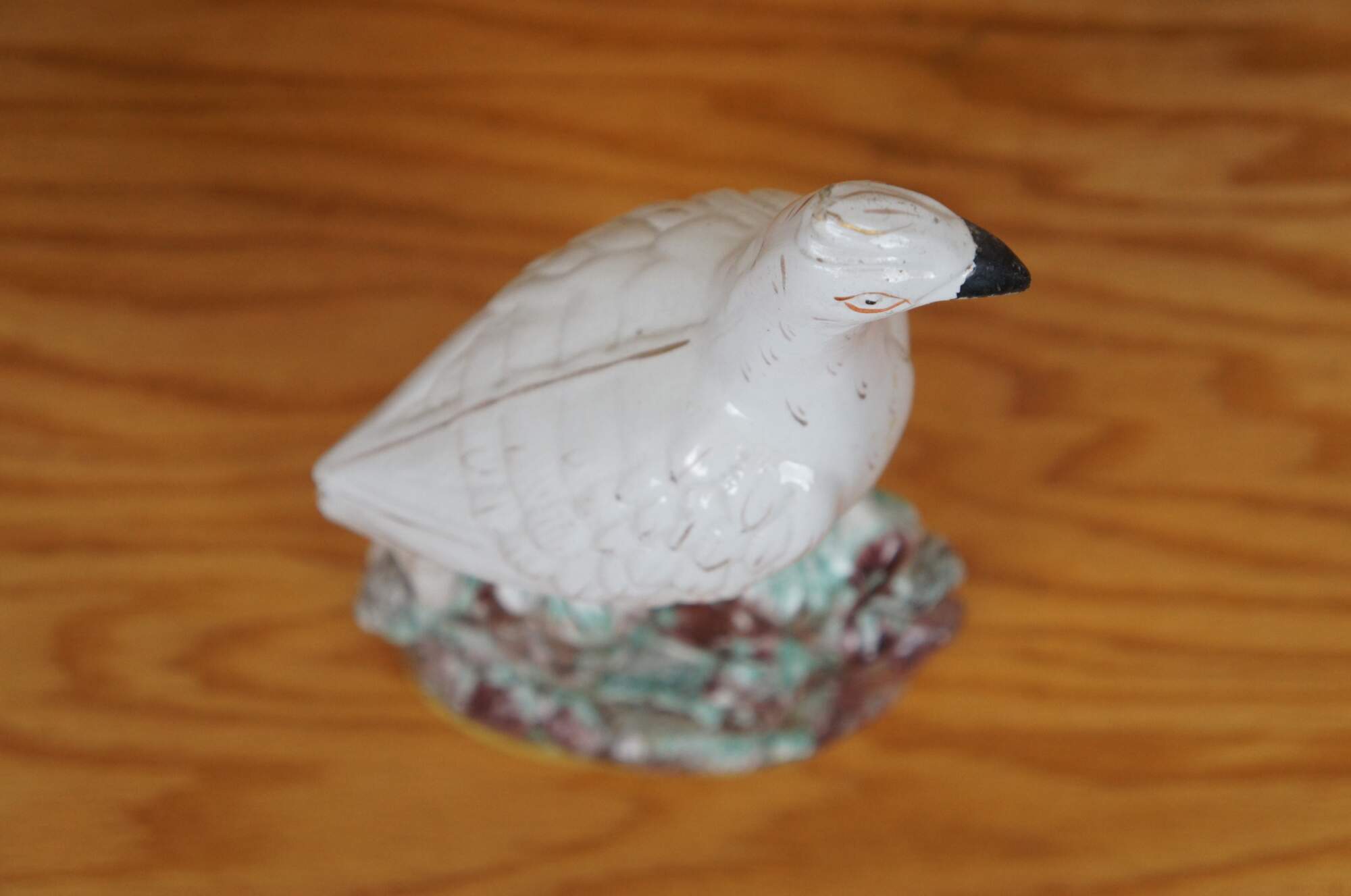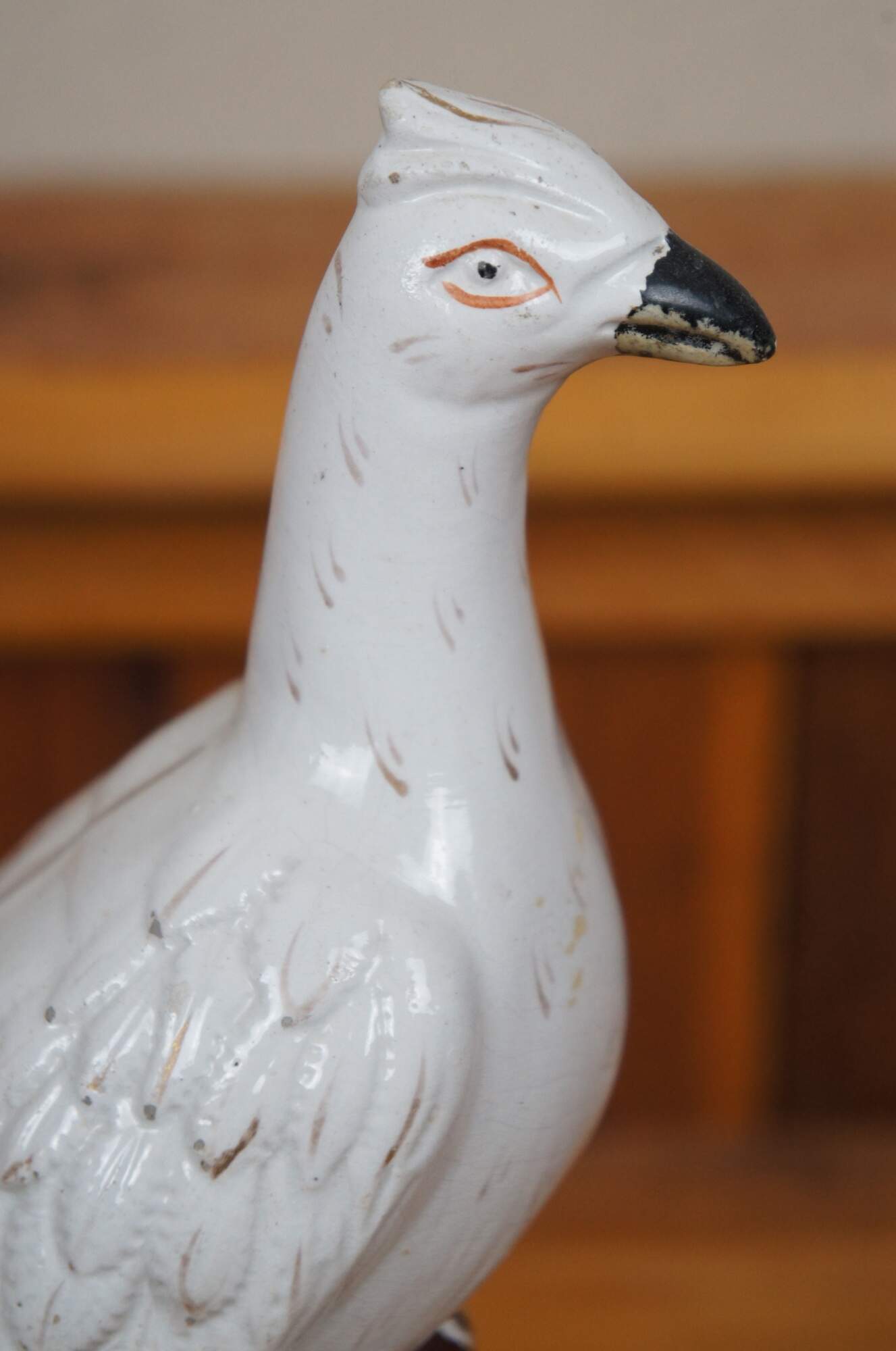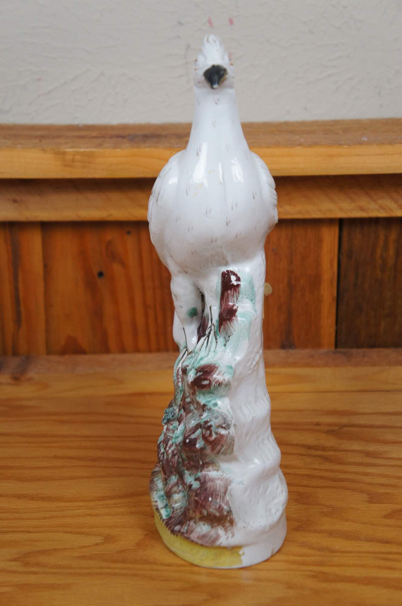 Large antique 19th century English Staffordshire porcelain figurine depicting a white roc bird / oriental pheasant perched on a stack of mossy rocks.