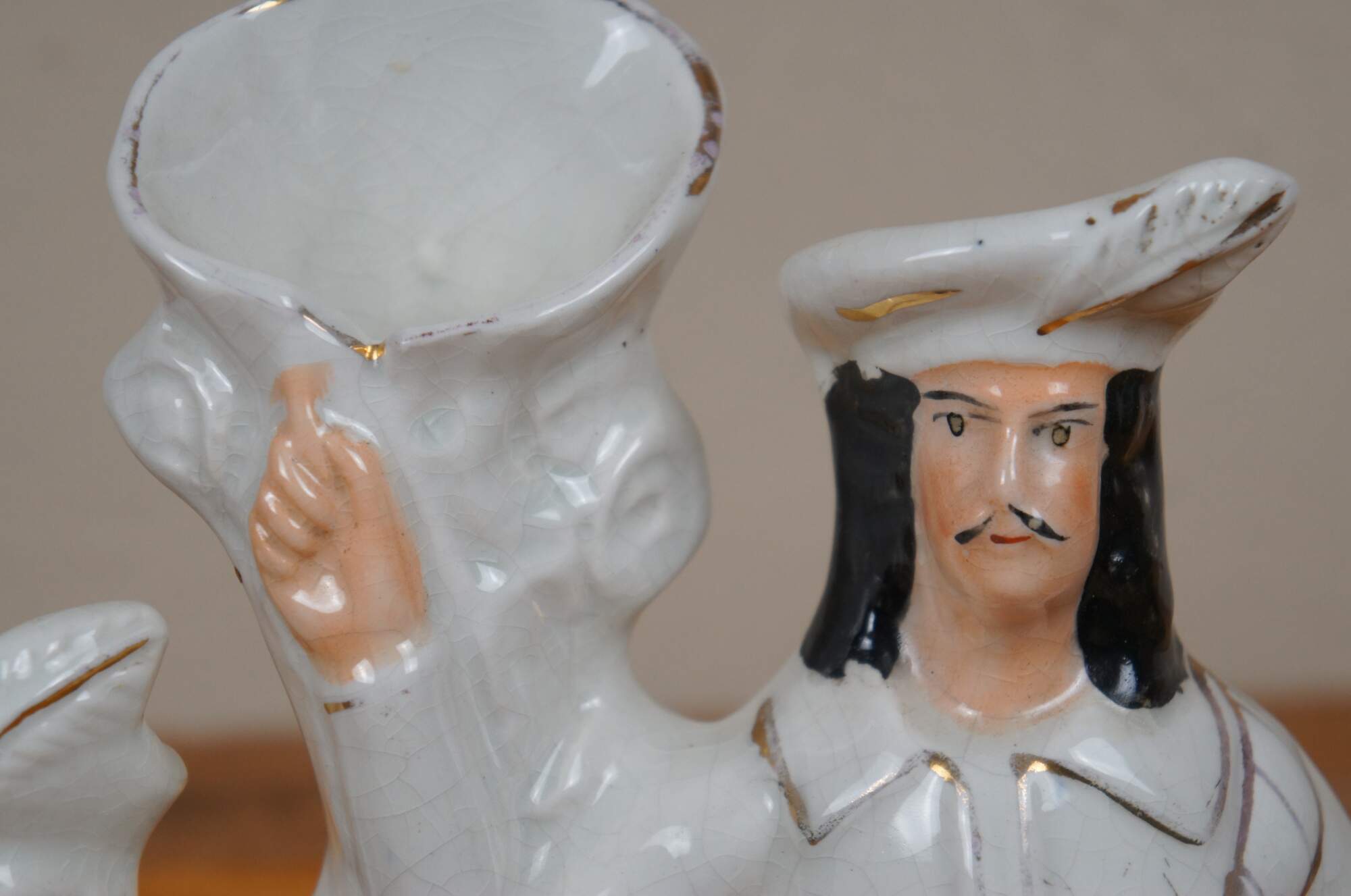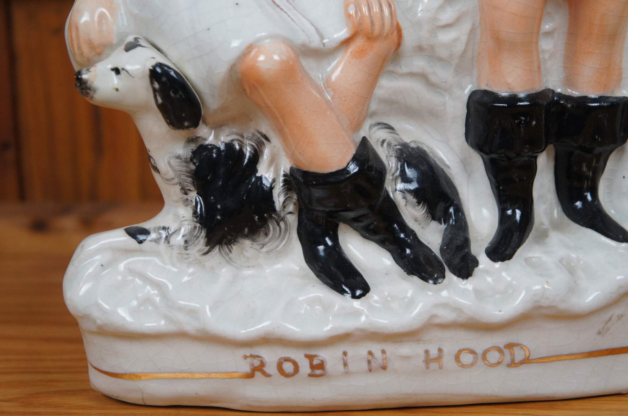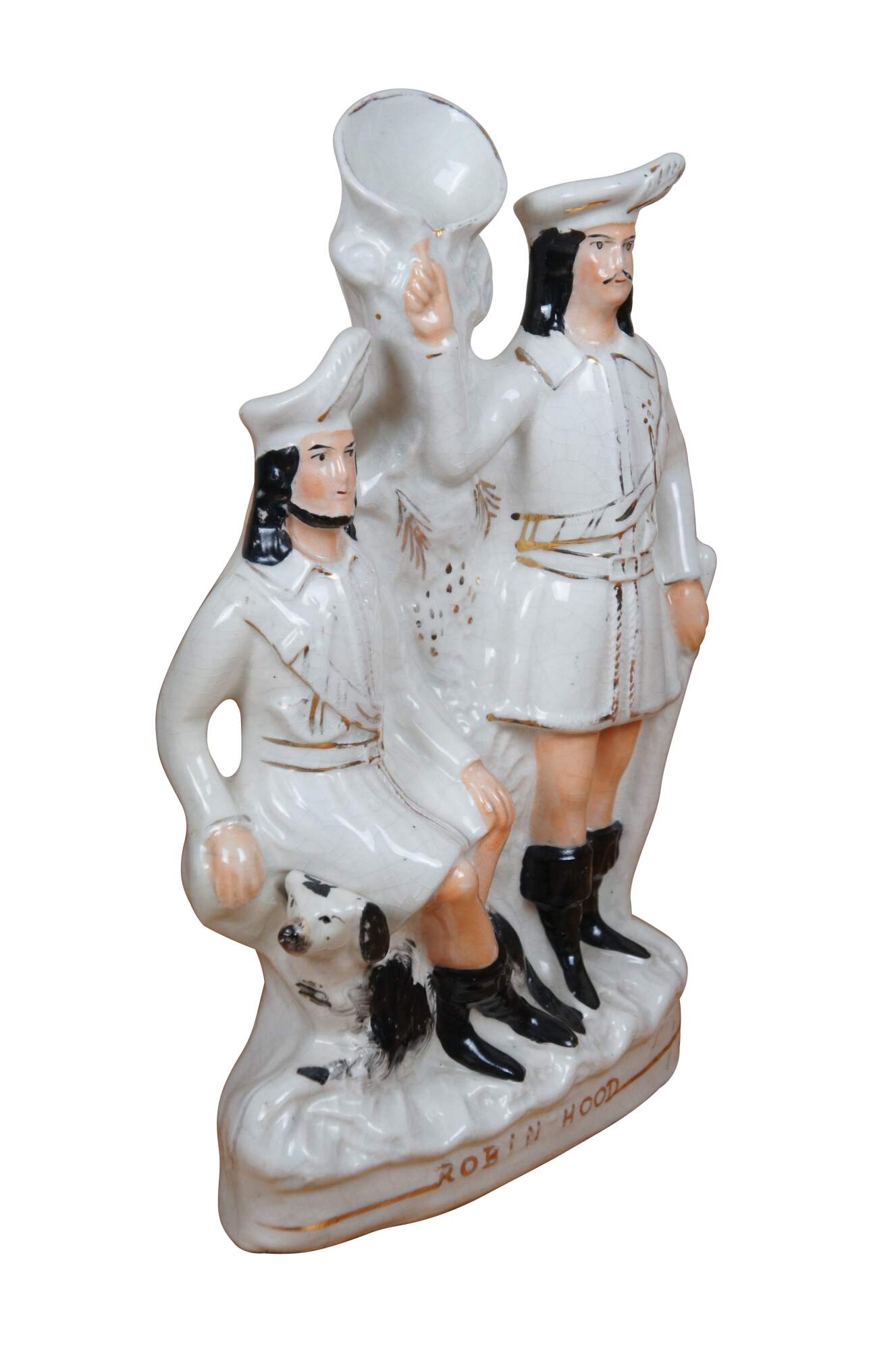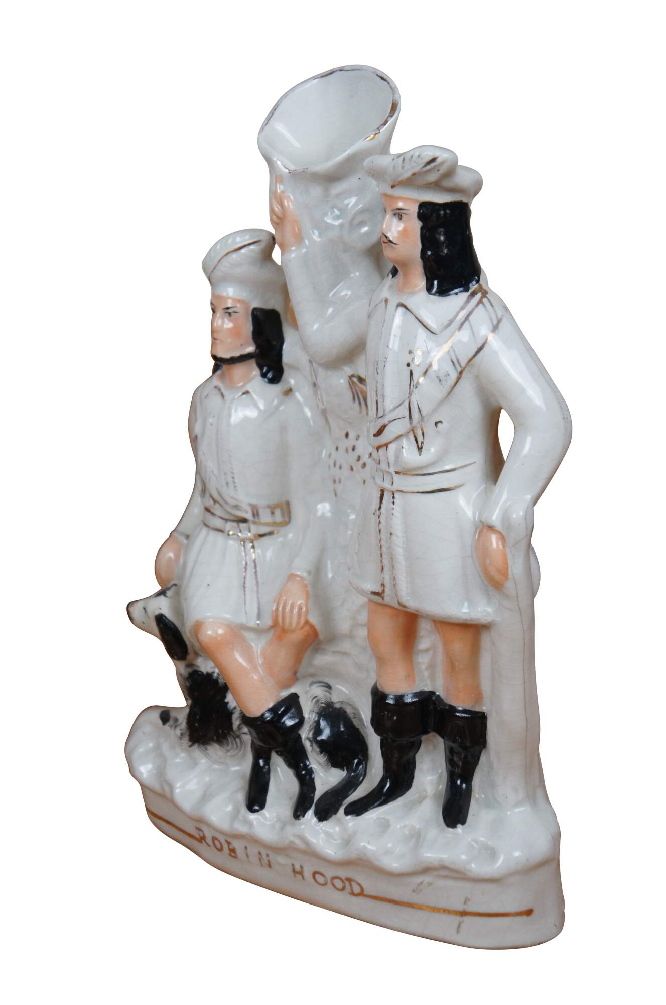 Antique 19th century English Staffordshire flatback porcelain flatback figural spill vase depicting robin Hood and Little John with a spaniel dog, posed by a tree stump decorated with pine cones.