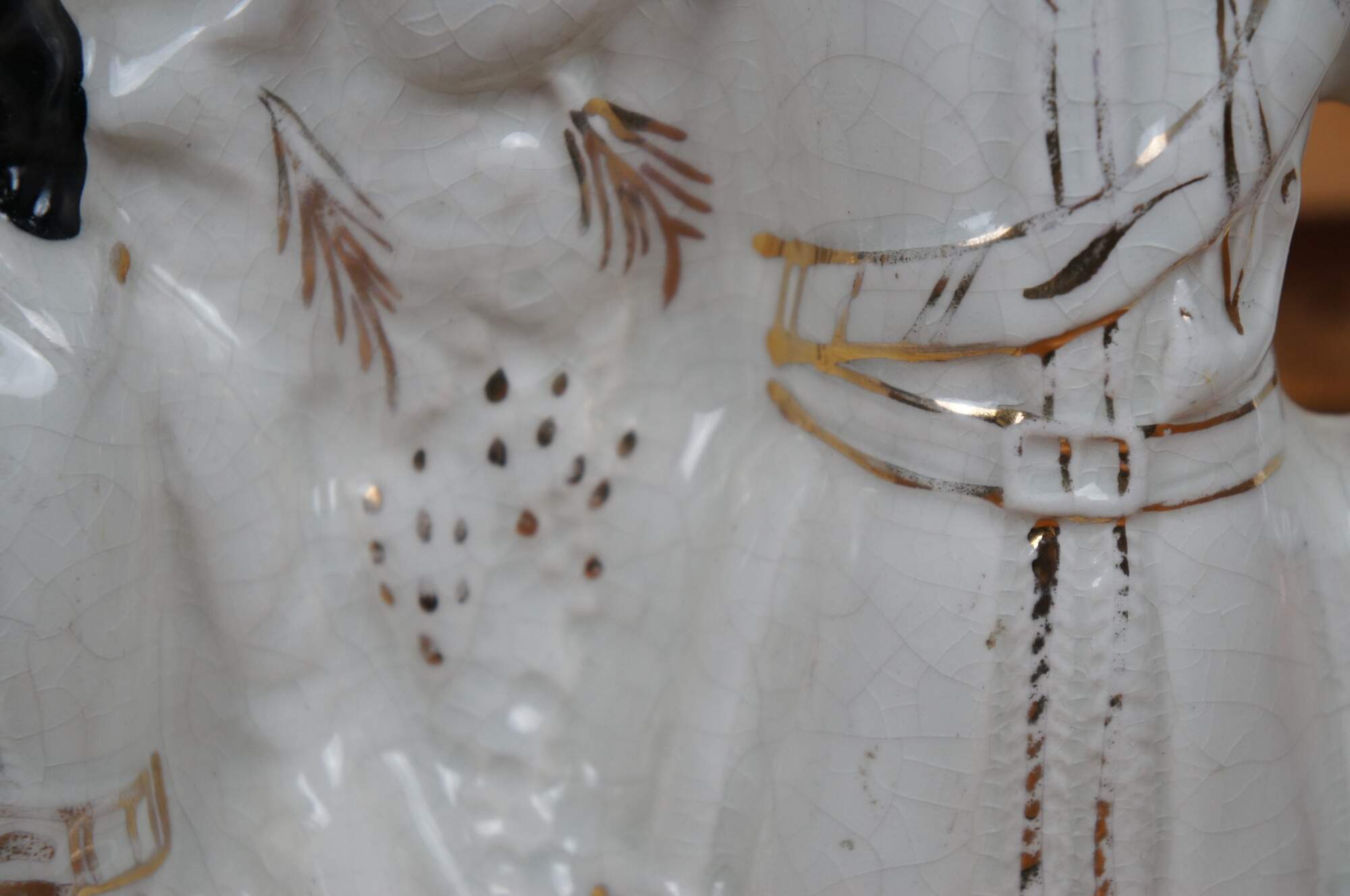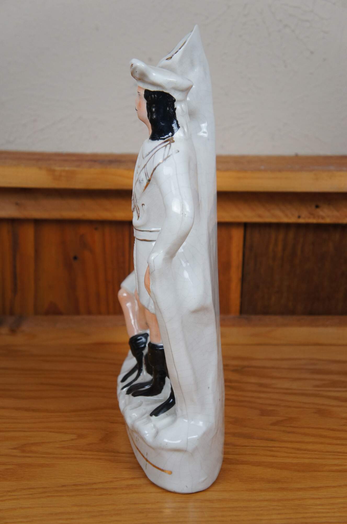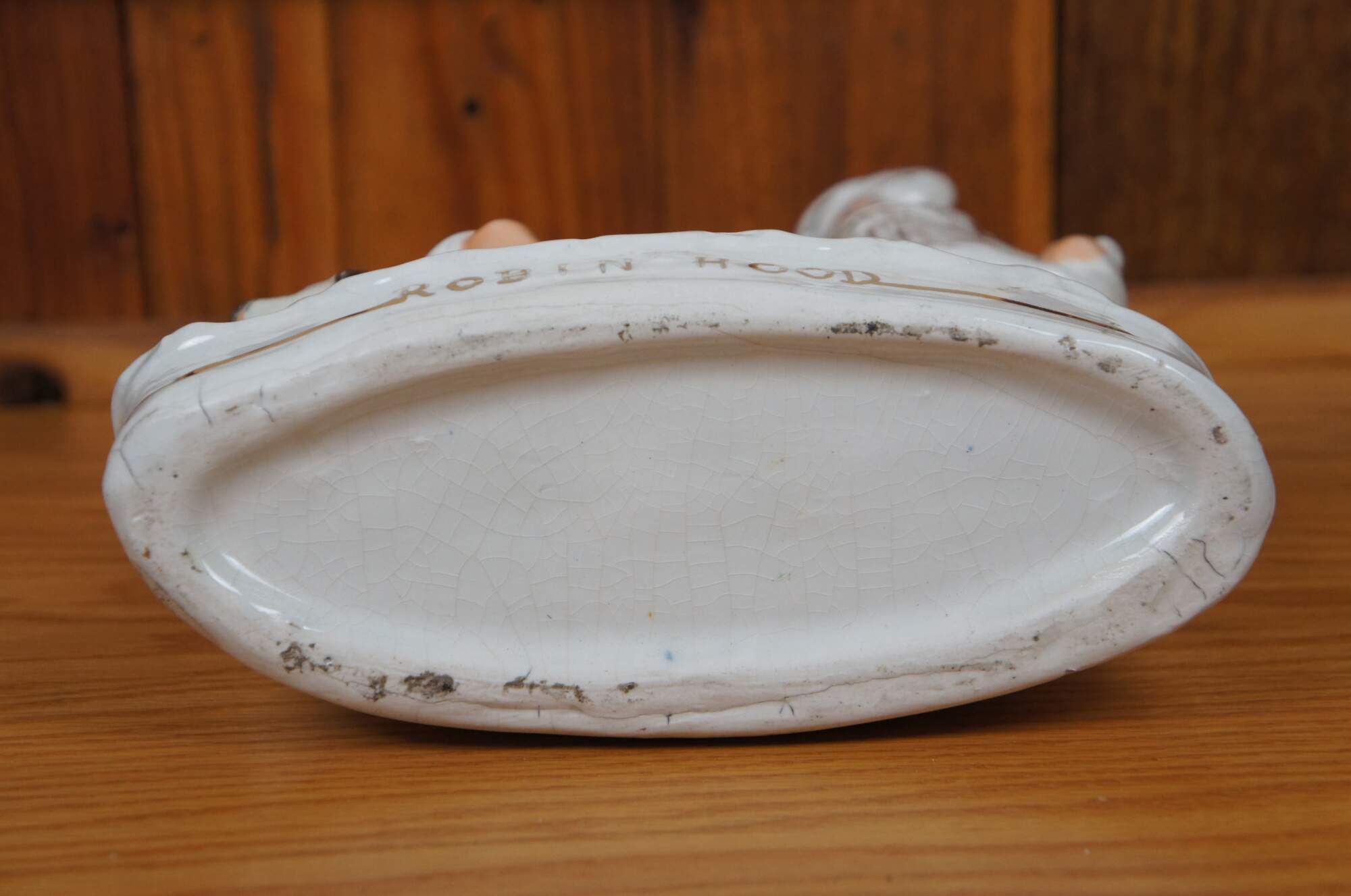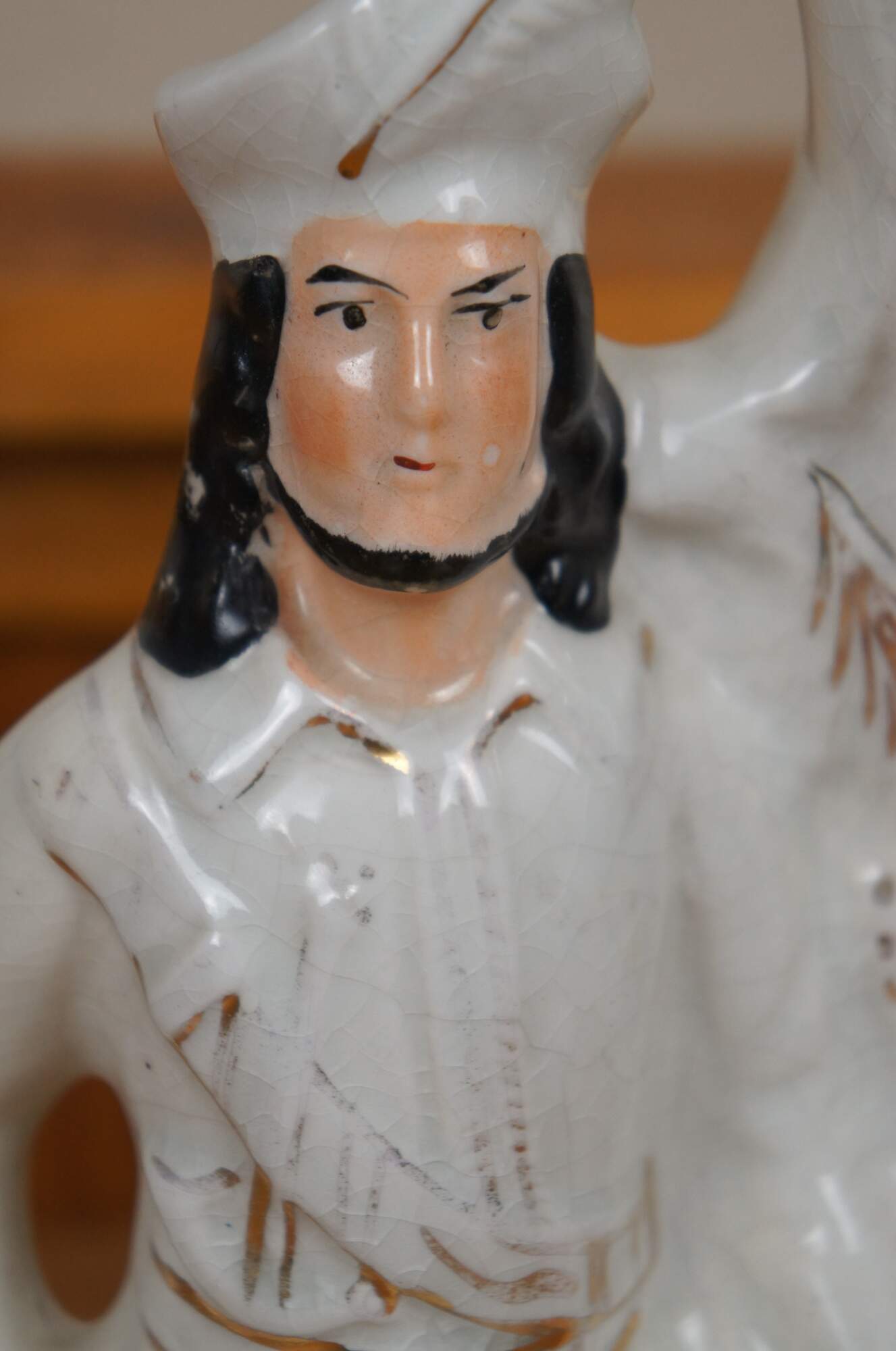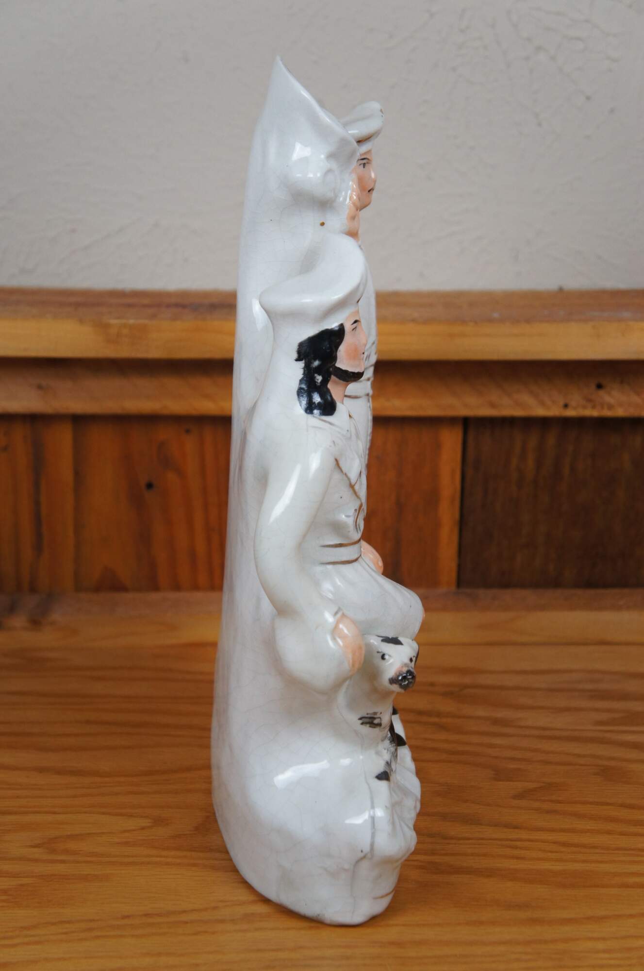 Antique 19th century English Staffordshire flatback porcelain flatback figural spill vase depicting robin Hood and Little John with a spaniel dog, posed by a tree stump decorated with pine cones.