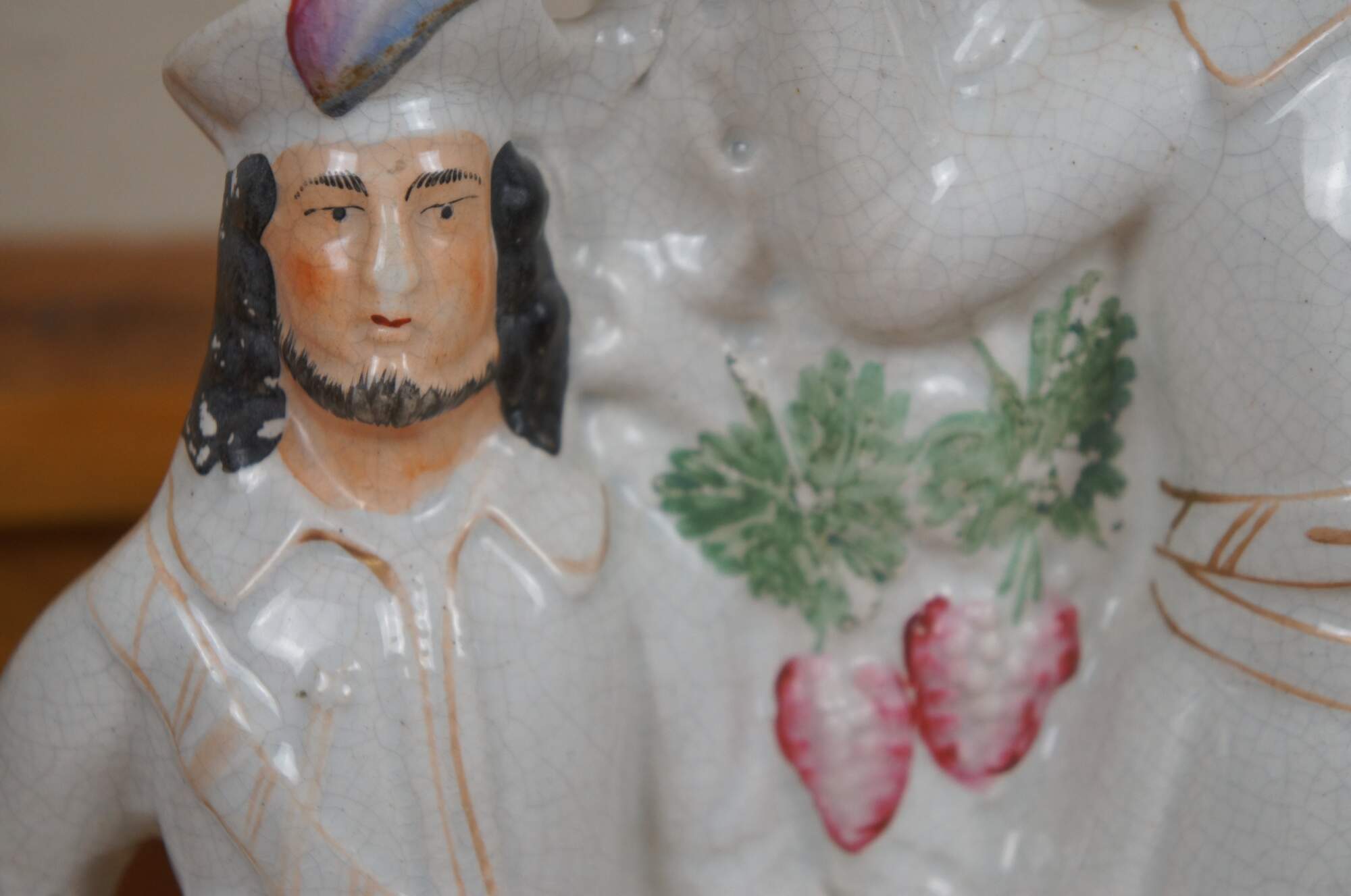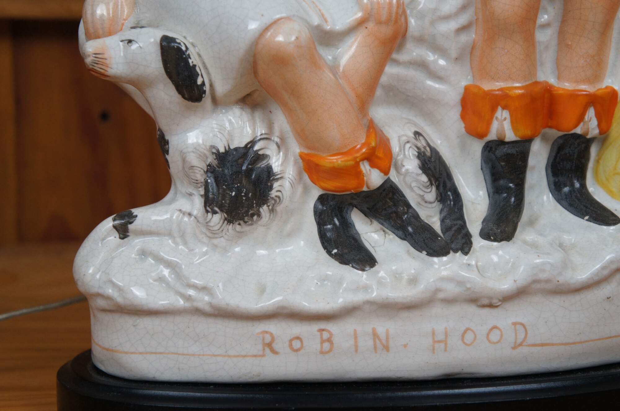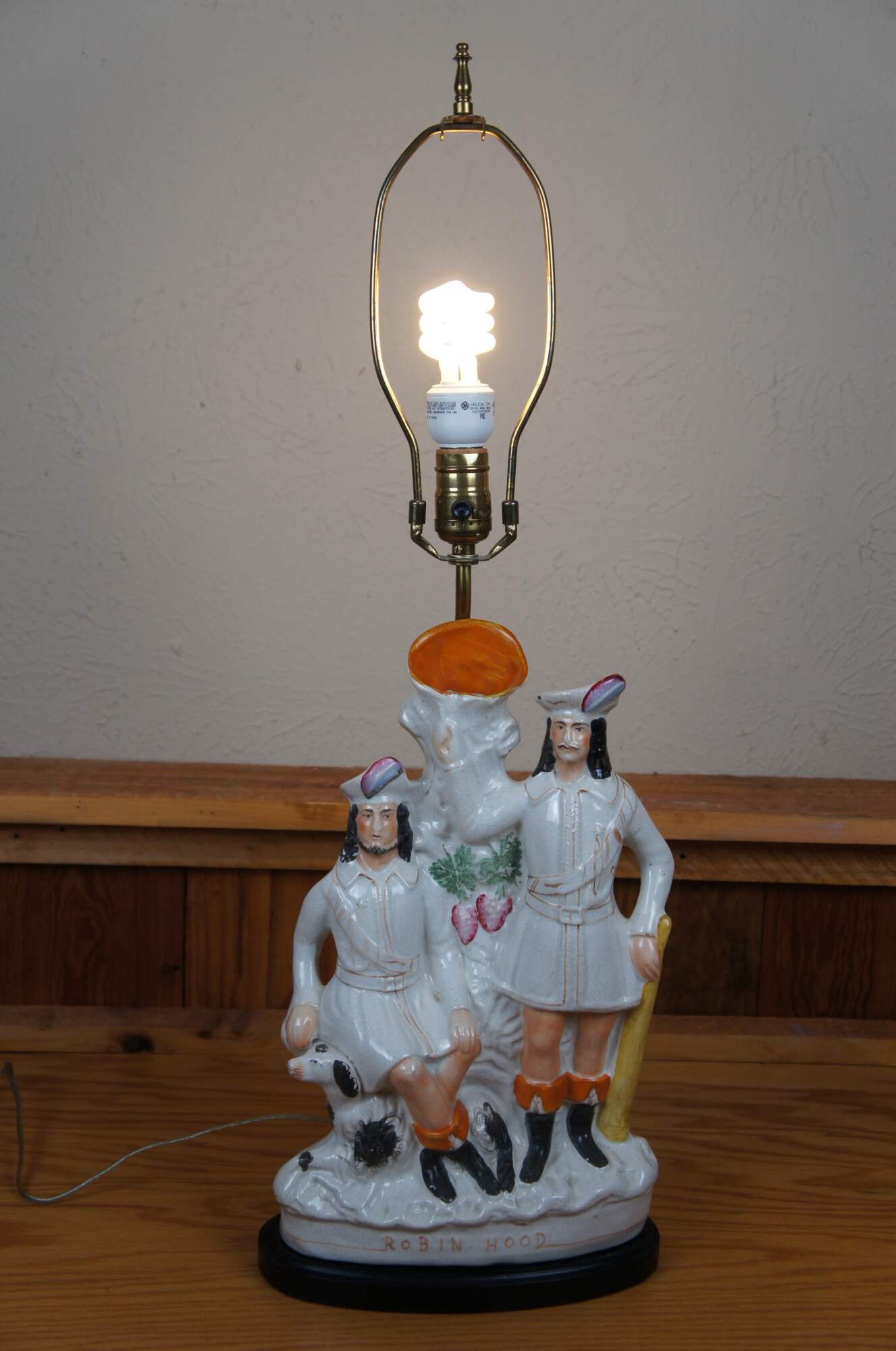 Antique 19th century English Staffordshire flatback porcelain figural spill vase converted into a table lamp. Depicts Robin Hood and Little John with a dog, posed beside a tree stump decorated with strawberries. Black wood base; includes harp and brass finial.