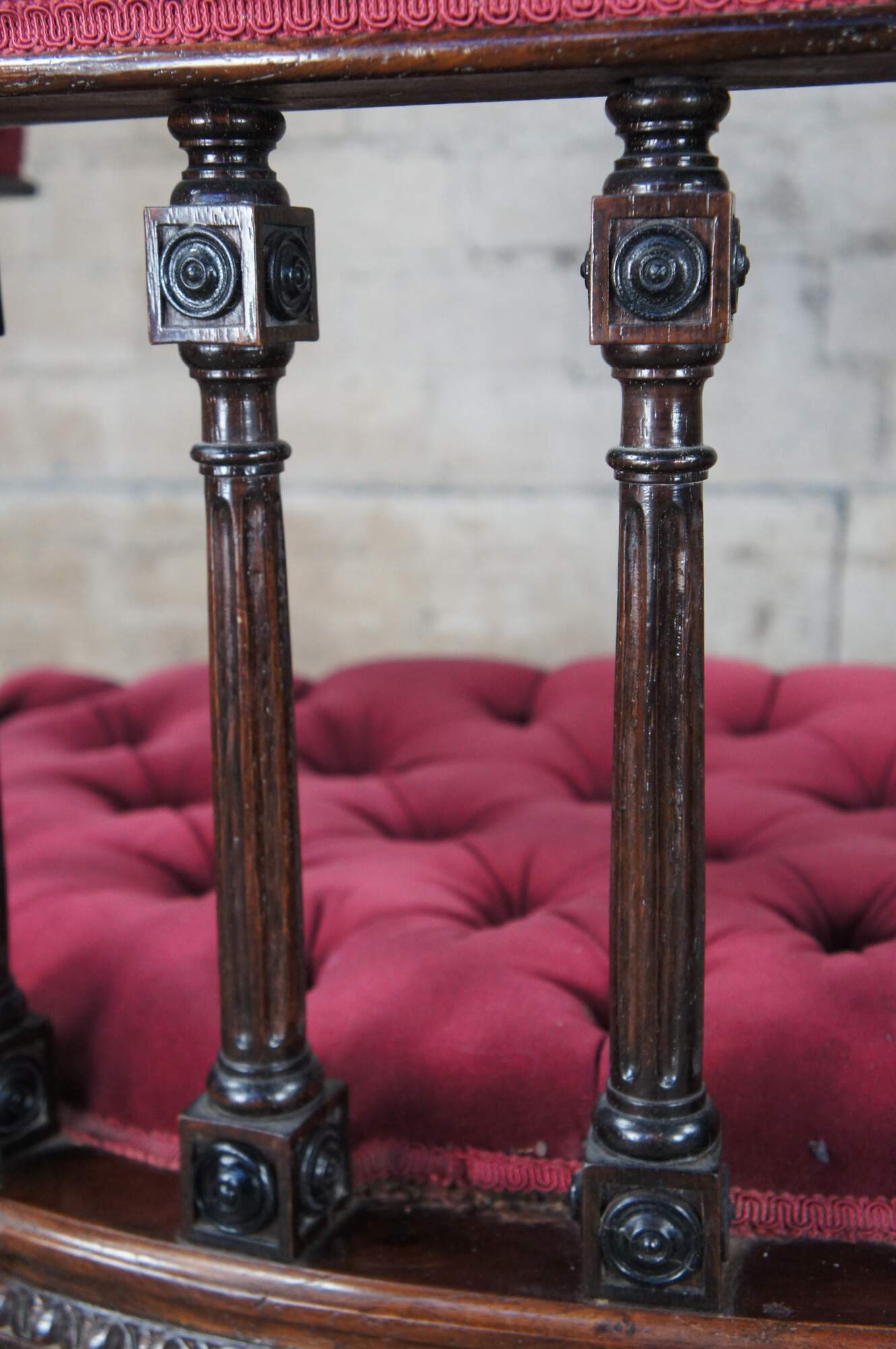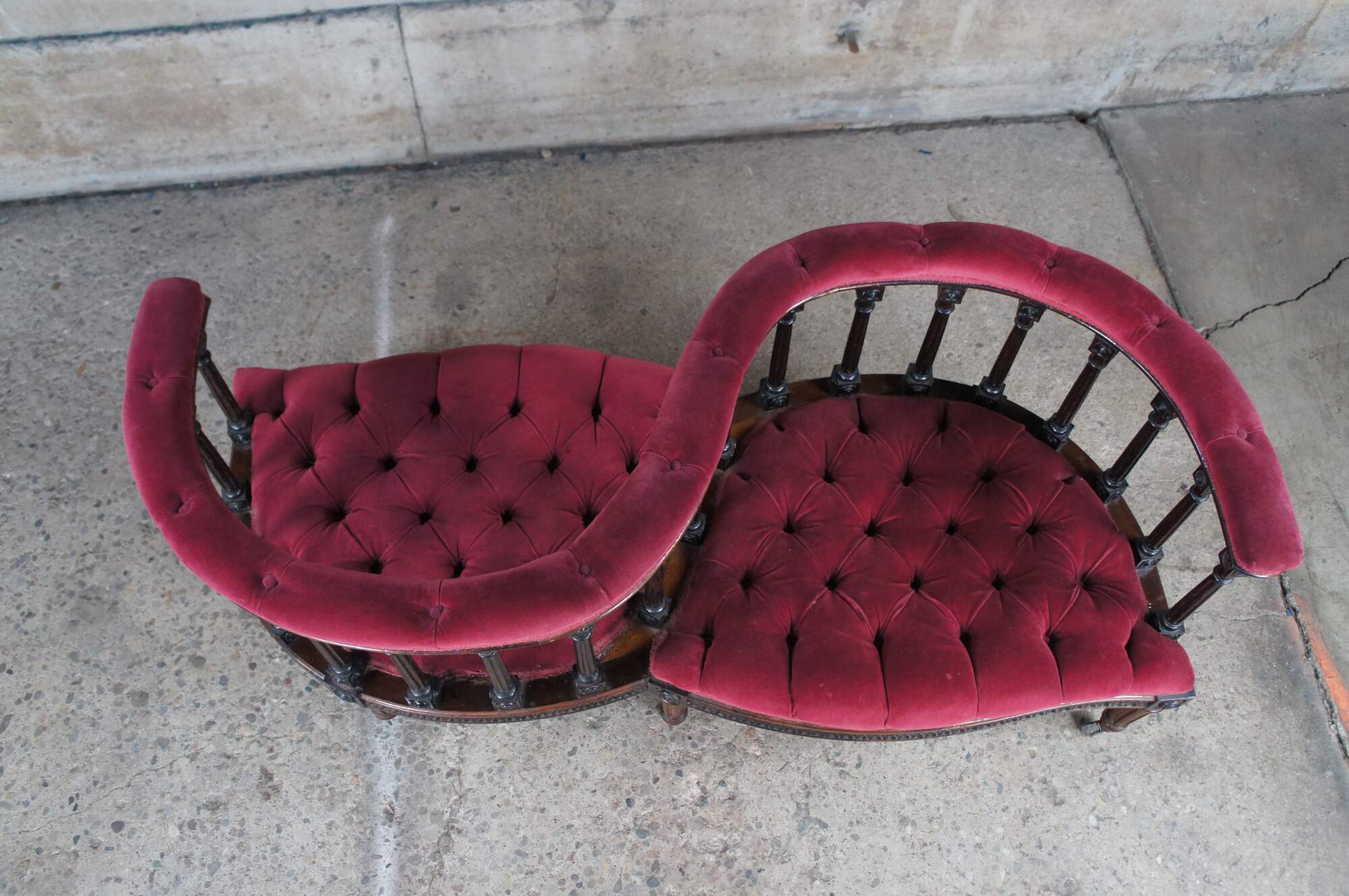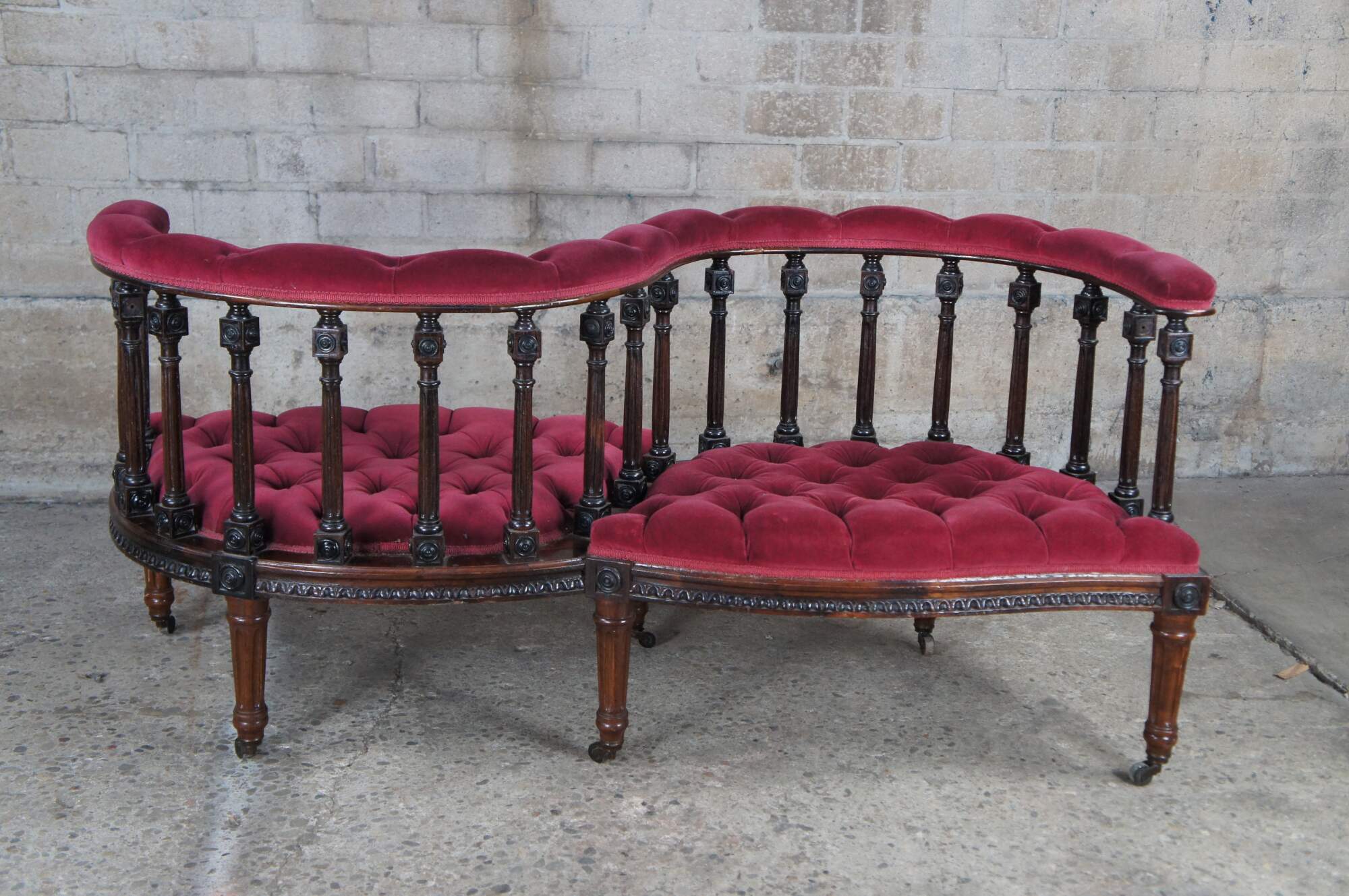An Antique 19th Century French Louis XVI Style Tete A Tete Conversation Chair / Courting Bench. Made from Rosewood with an elaborate "S" form supported by turned and fluted columns terminating into block posts with round medallions on all four sides. The bench is upholstered in a red velvet upholstery with tufting. The aprons of the settee are carved with an elegant tulip pattern and supported by turned, tapered, fluted legs with arrow feet and casters.