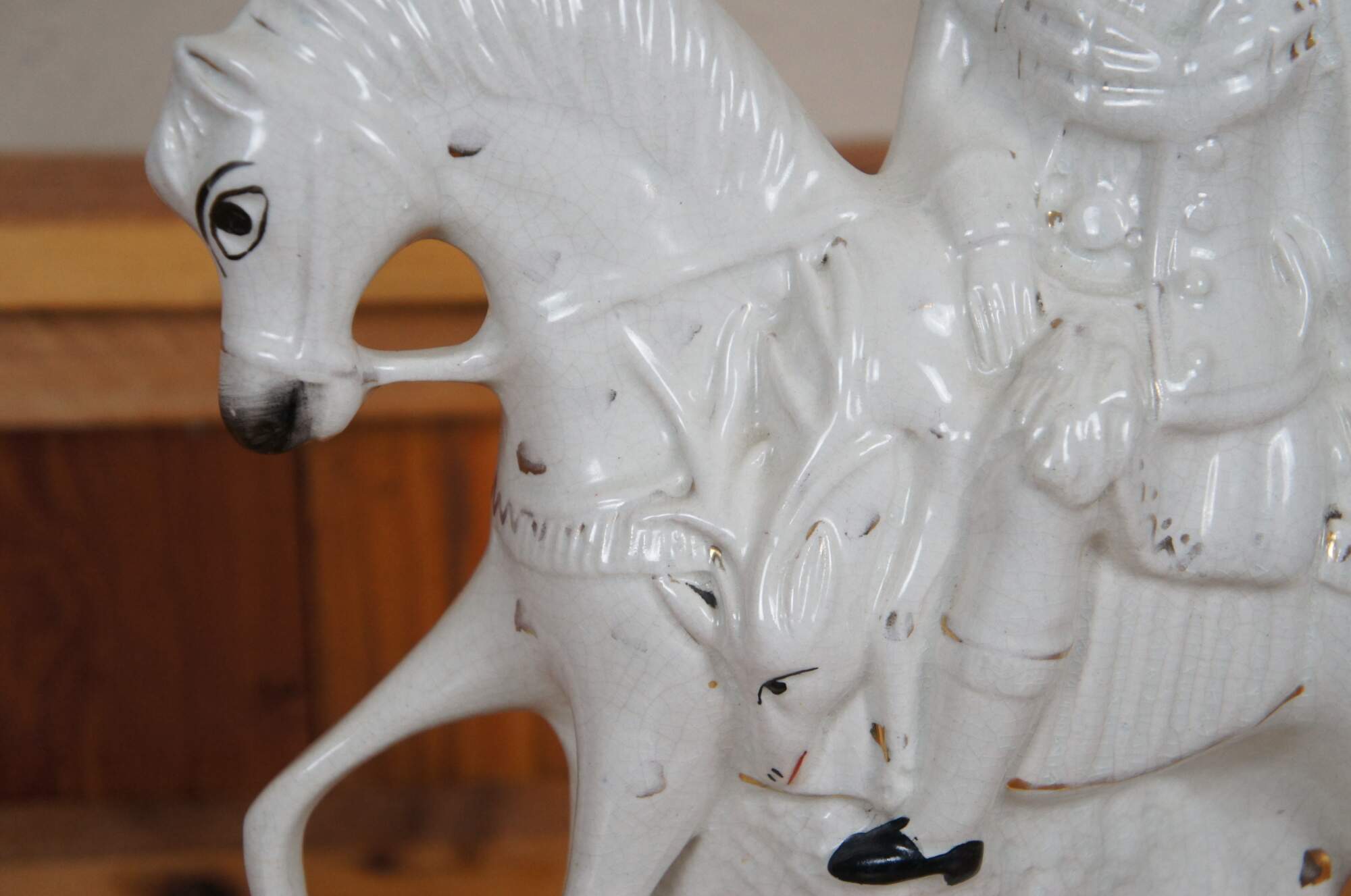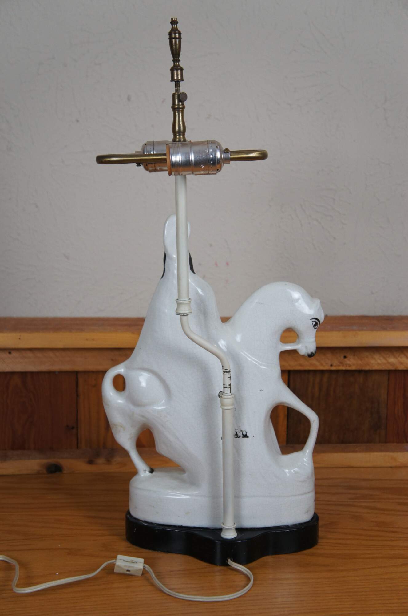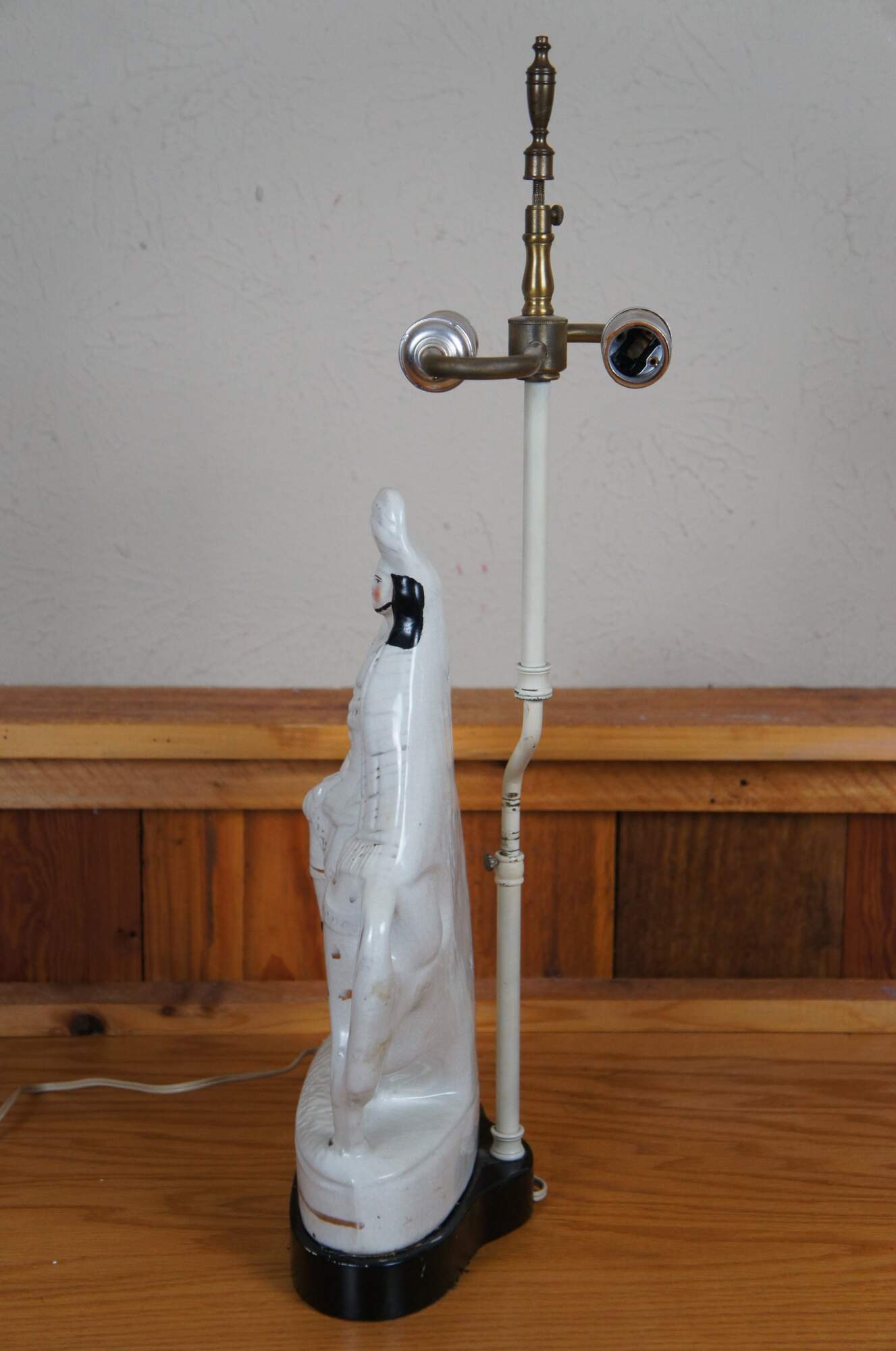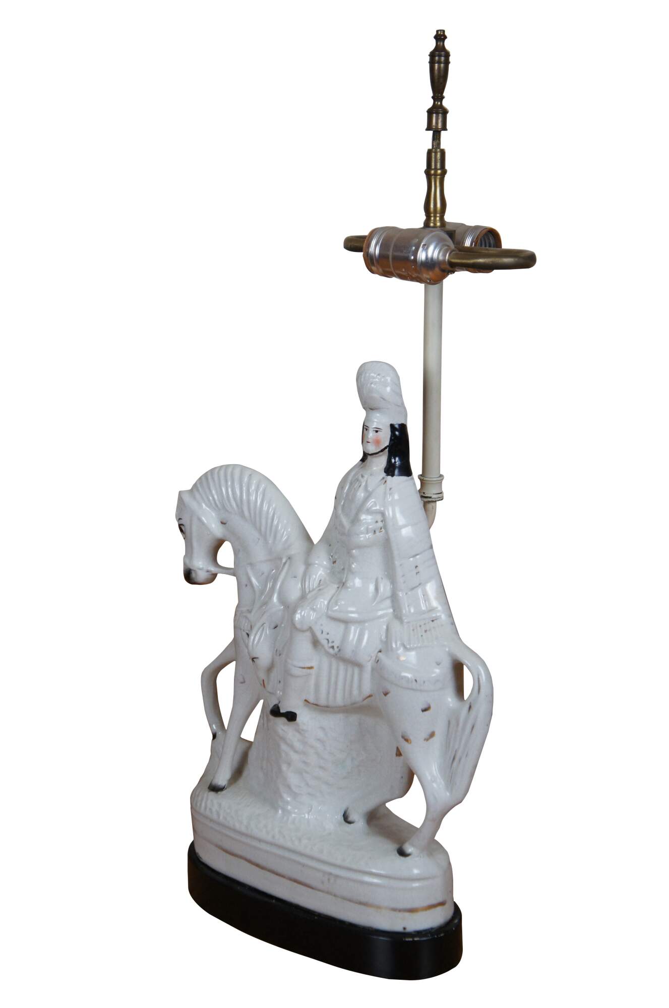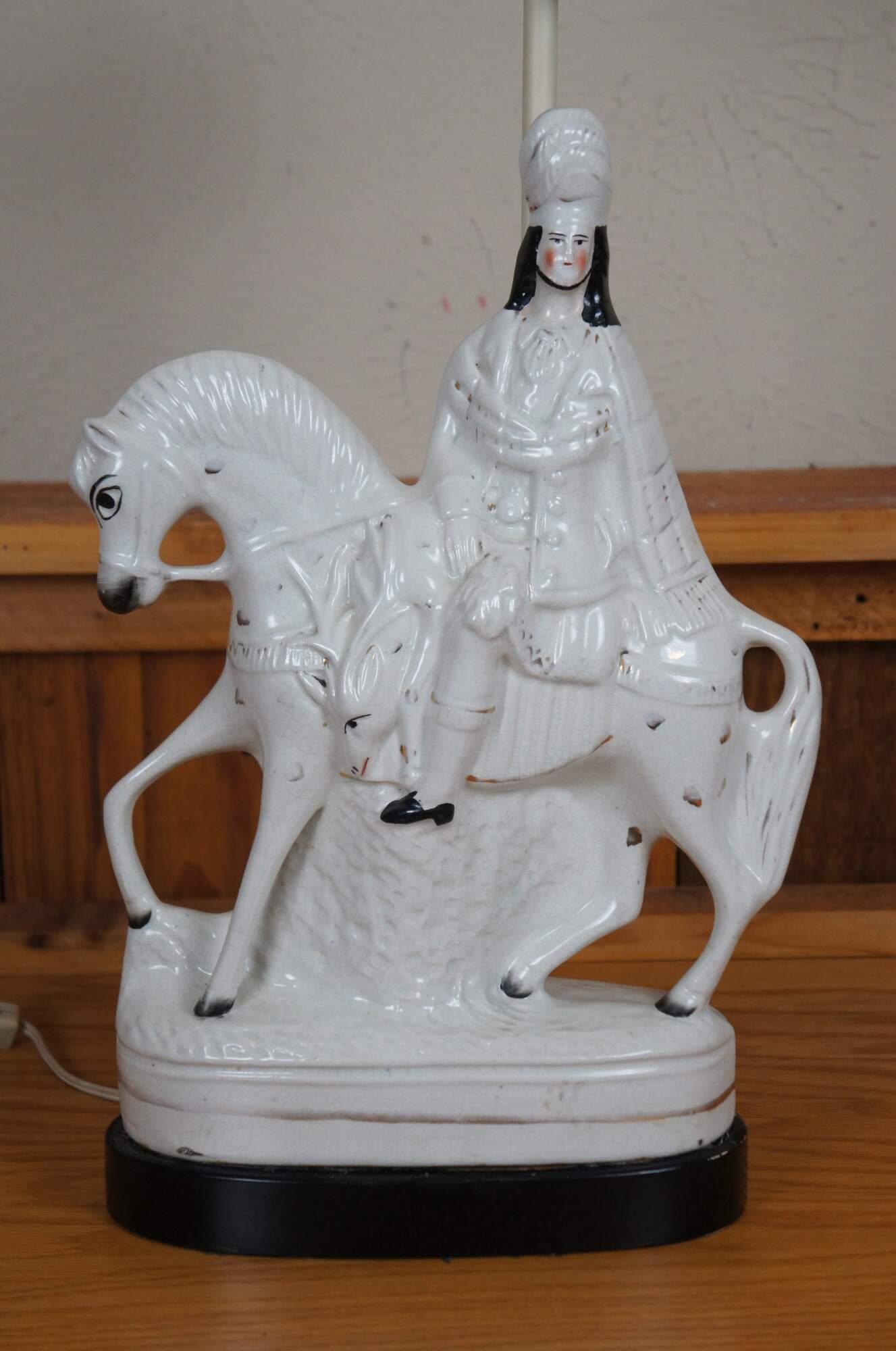 Antique 19th century Staffordshire porcelain flatback equestrian hunt figurine, converted into a two light table lamp, depicting a Scottish Highlander / hunter on horseback with a deer / stag draped over the saddle. Black wood base; painted wire cover; brass finial. Circa mid 19th century.