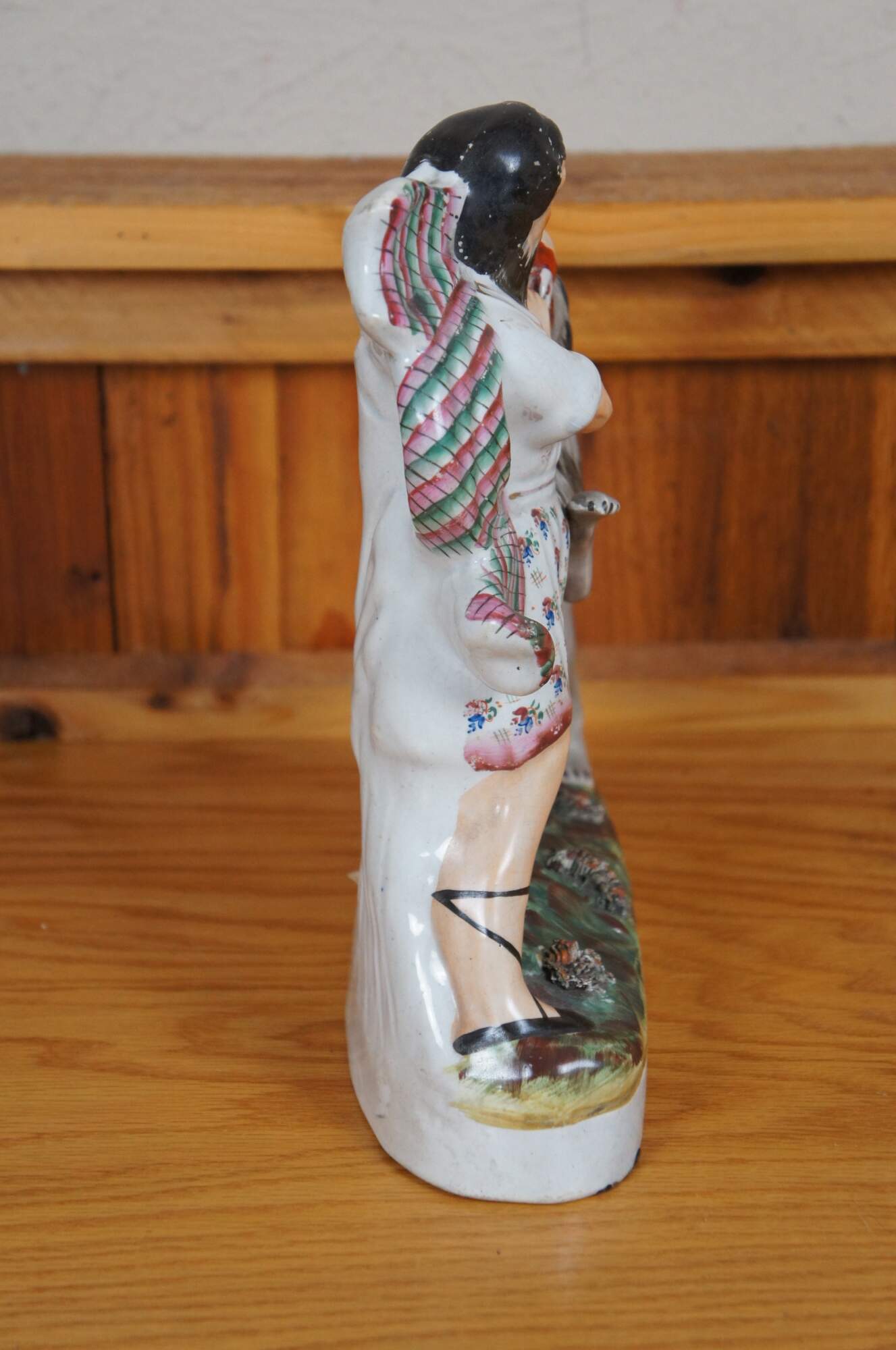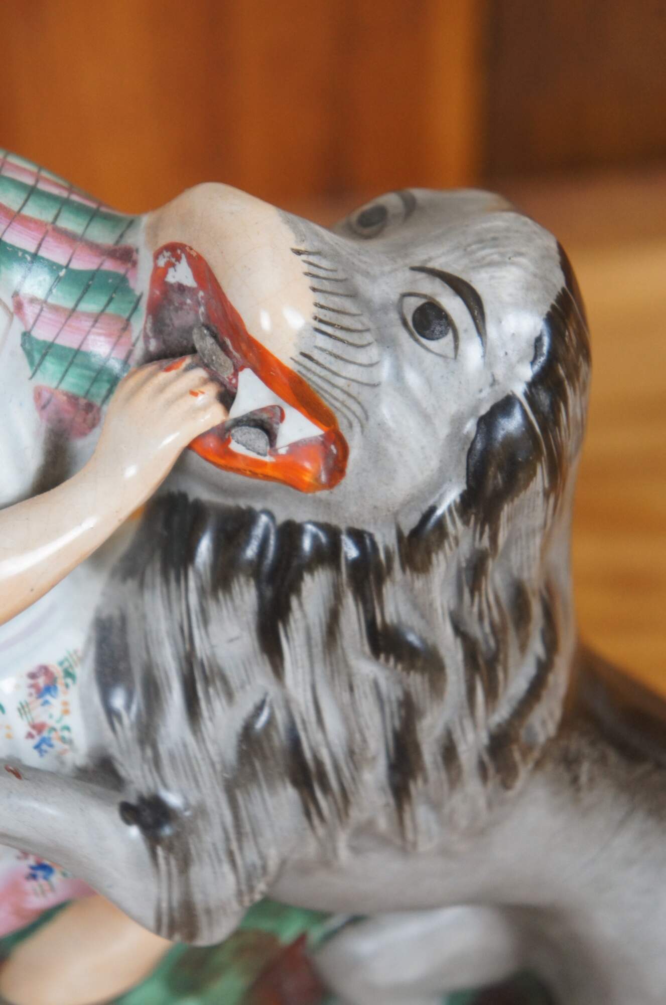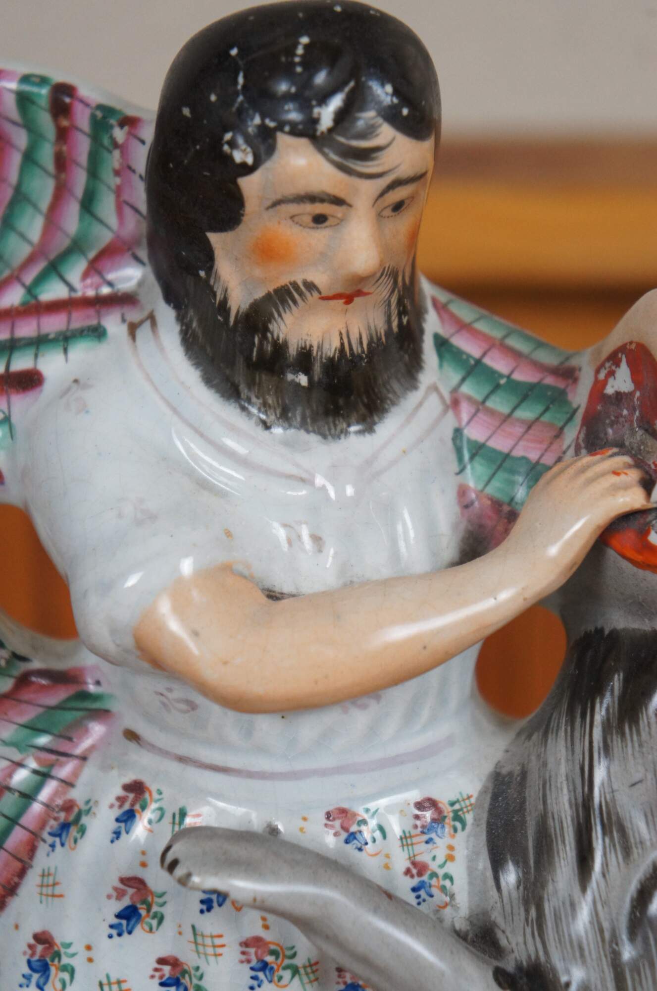 Antique 19th century Staffordshire porcelain flatback figurine depicting the Biblical figure Samson prying open the jaws of a lion. Dressed in a floral Scotsmans kilt and striped arisaid or cloak. One of the finest examples of th is figurine. Circa mid 19th century.