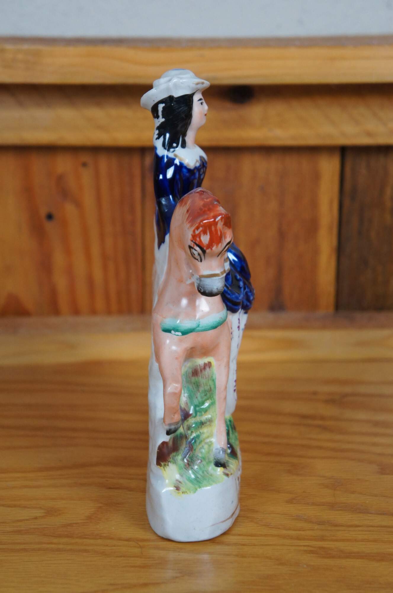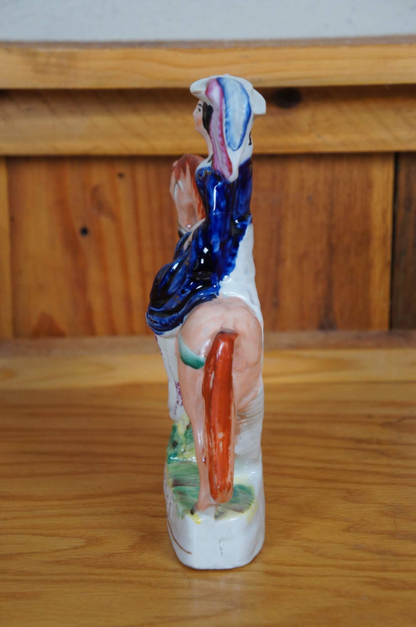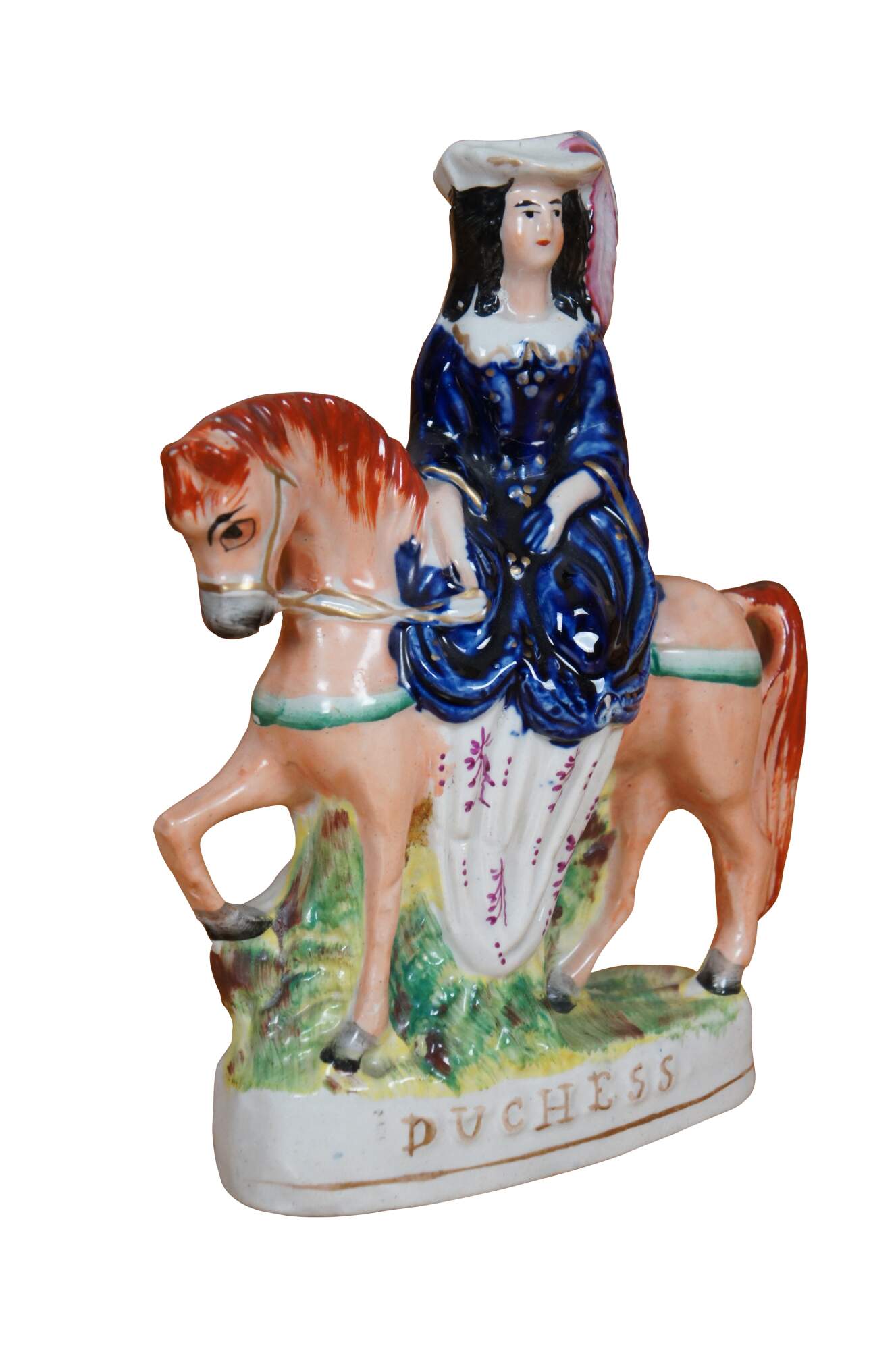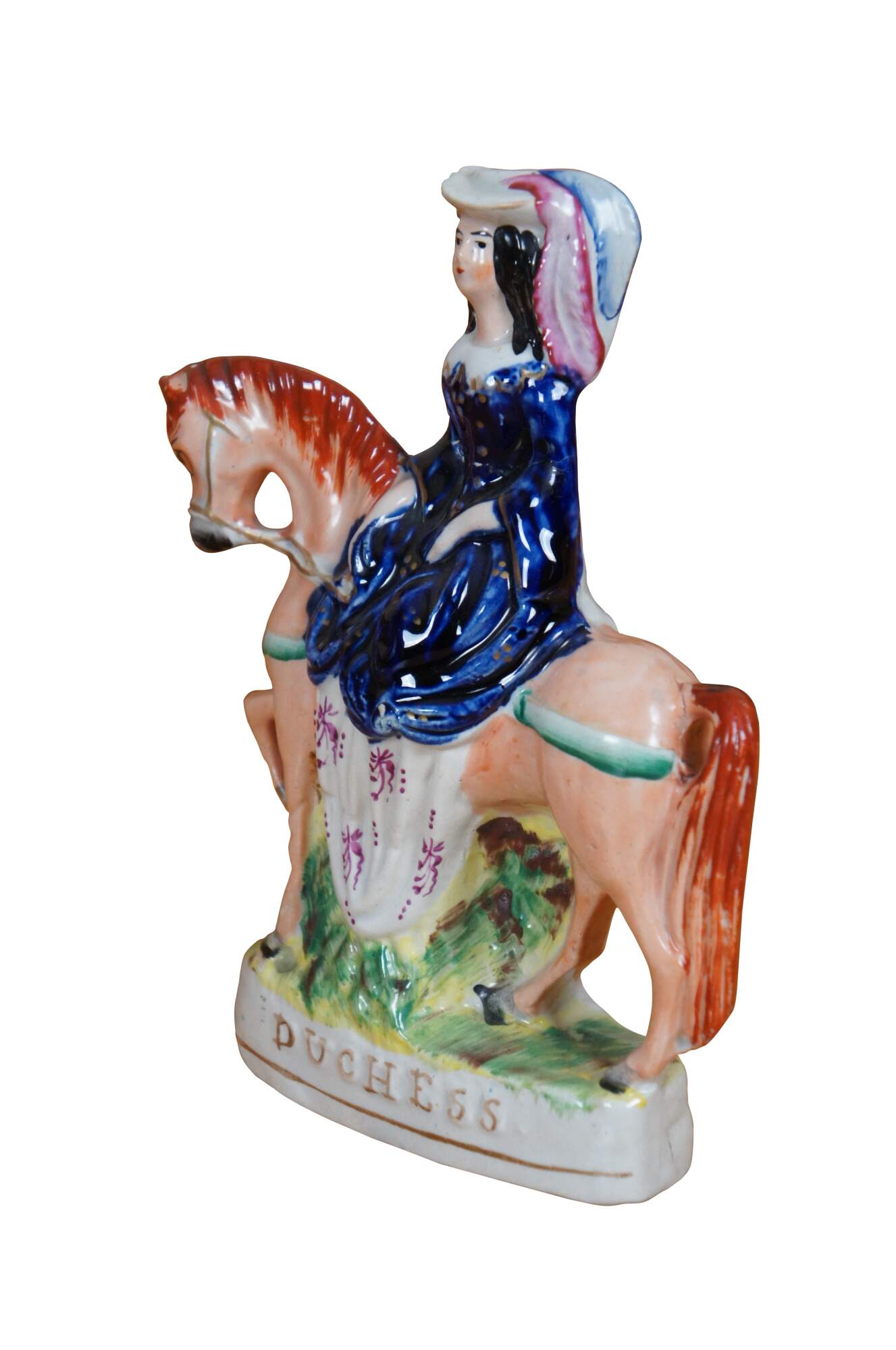 Antique 19th century Staffordshire porcelain equestrian flatback figurine titled on the base "Duchess," likely depicting Sarah Fairbrother / Mrs. FitzGeorge in a cobalt blue dress with floral petticoat, seated on a horse. Circa 1854.