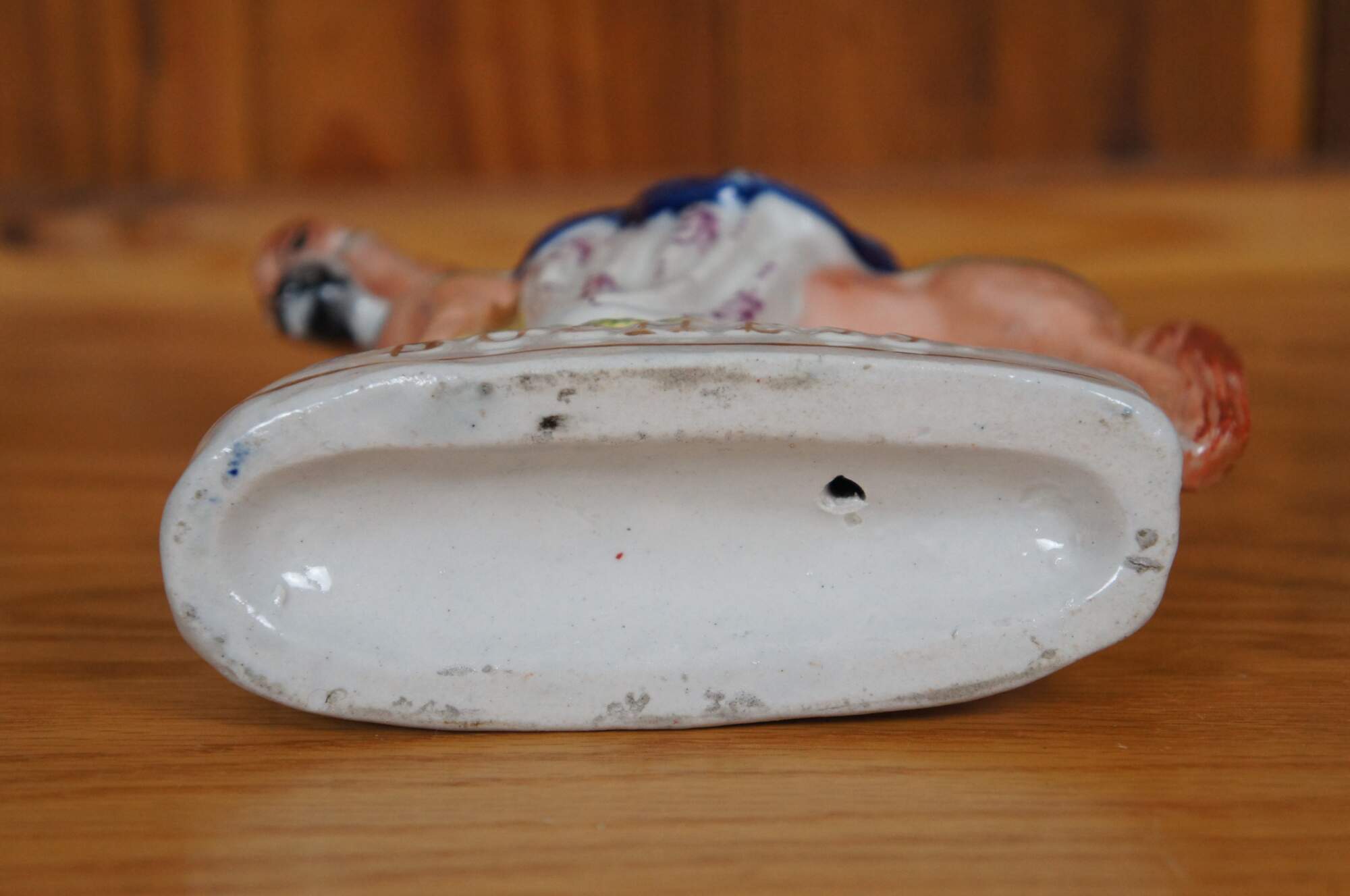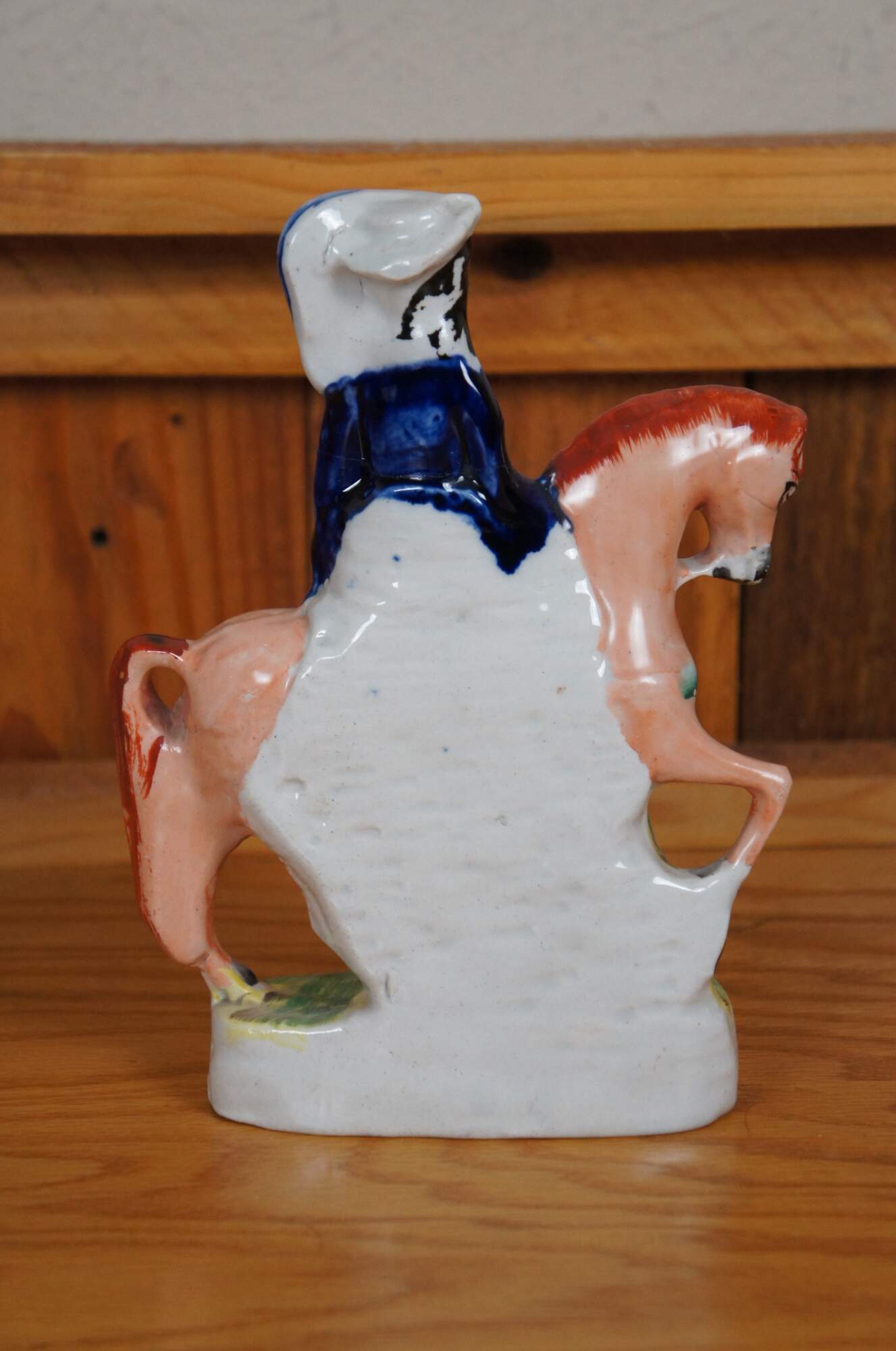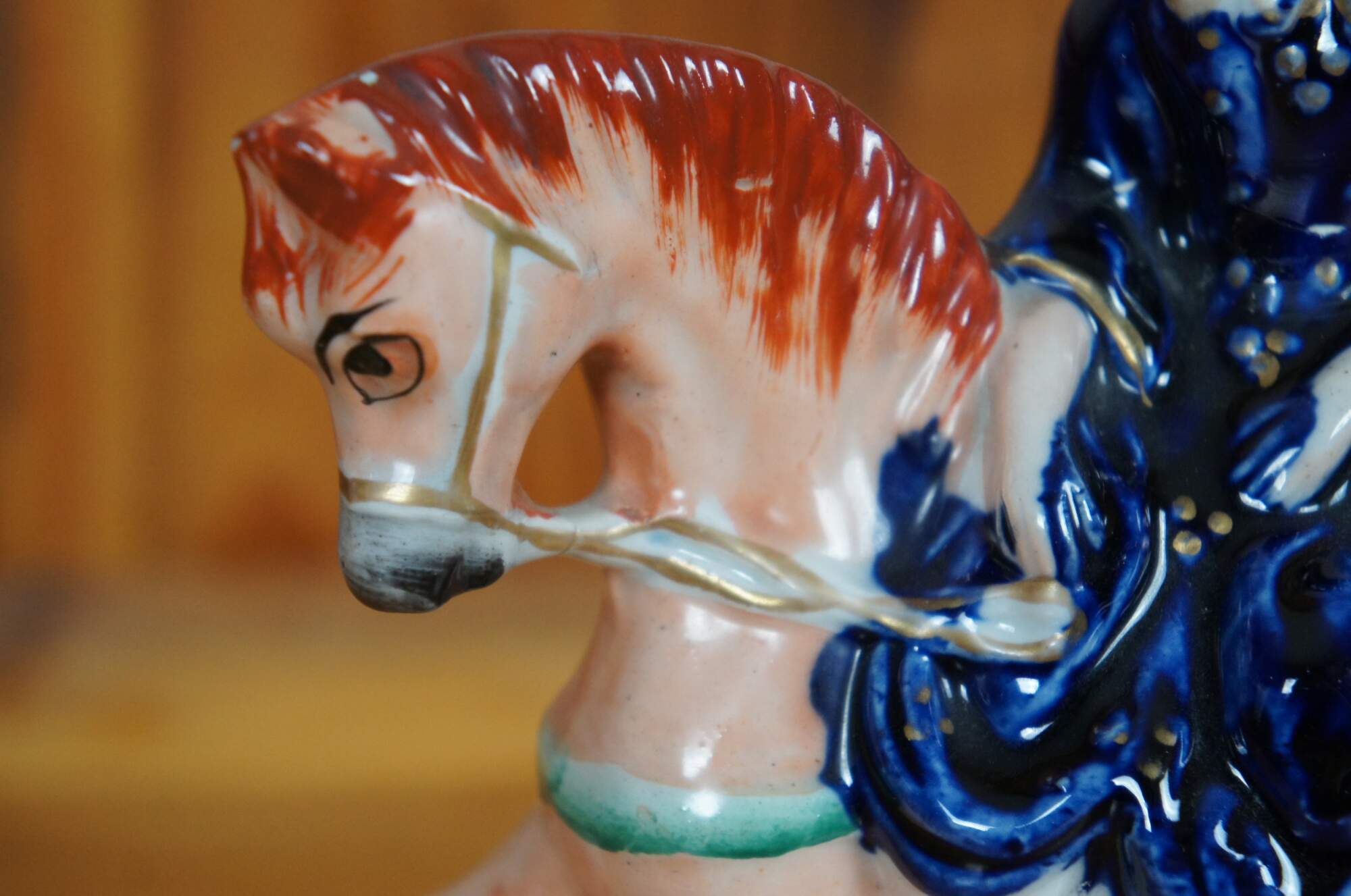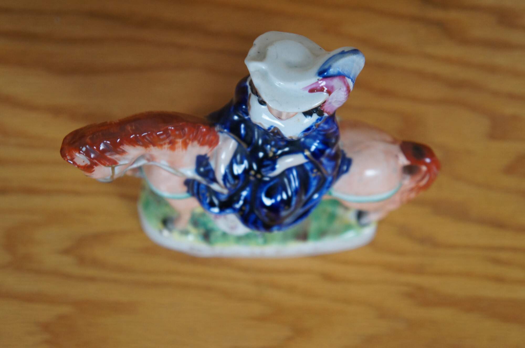 Antique 19th century Staffordshire porcelain equestrian flatback figurine titled on the base "Duchess," likely depicting Sarah Fairbrother / Mrs. FitzGeorge in a cobalt blue dress with floral petticoat, seated on a horse. Circa 1854.