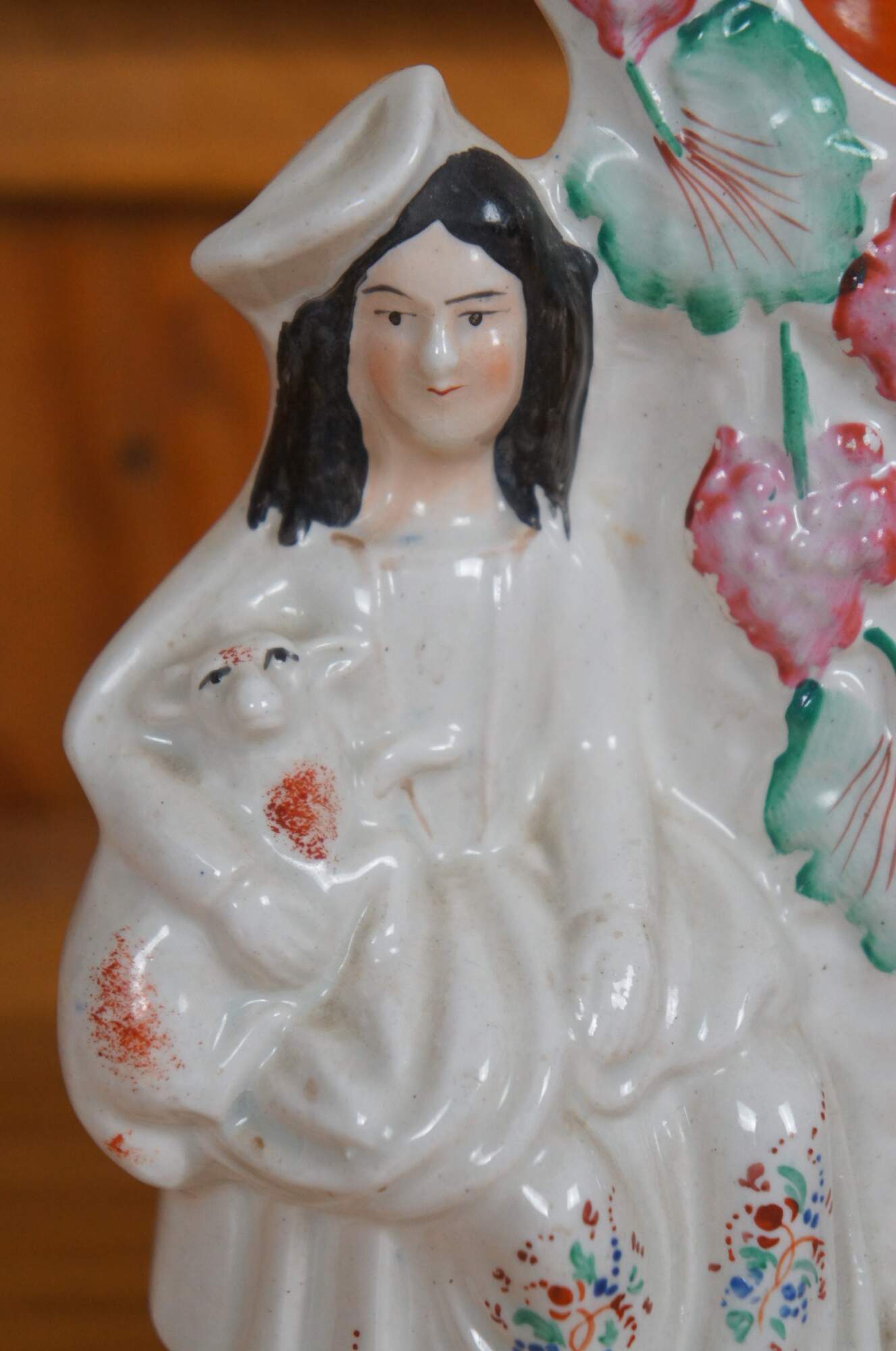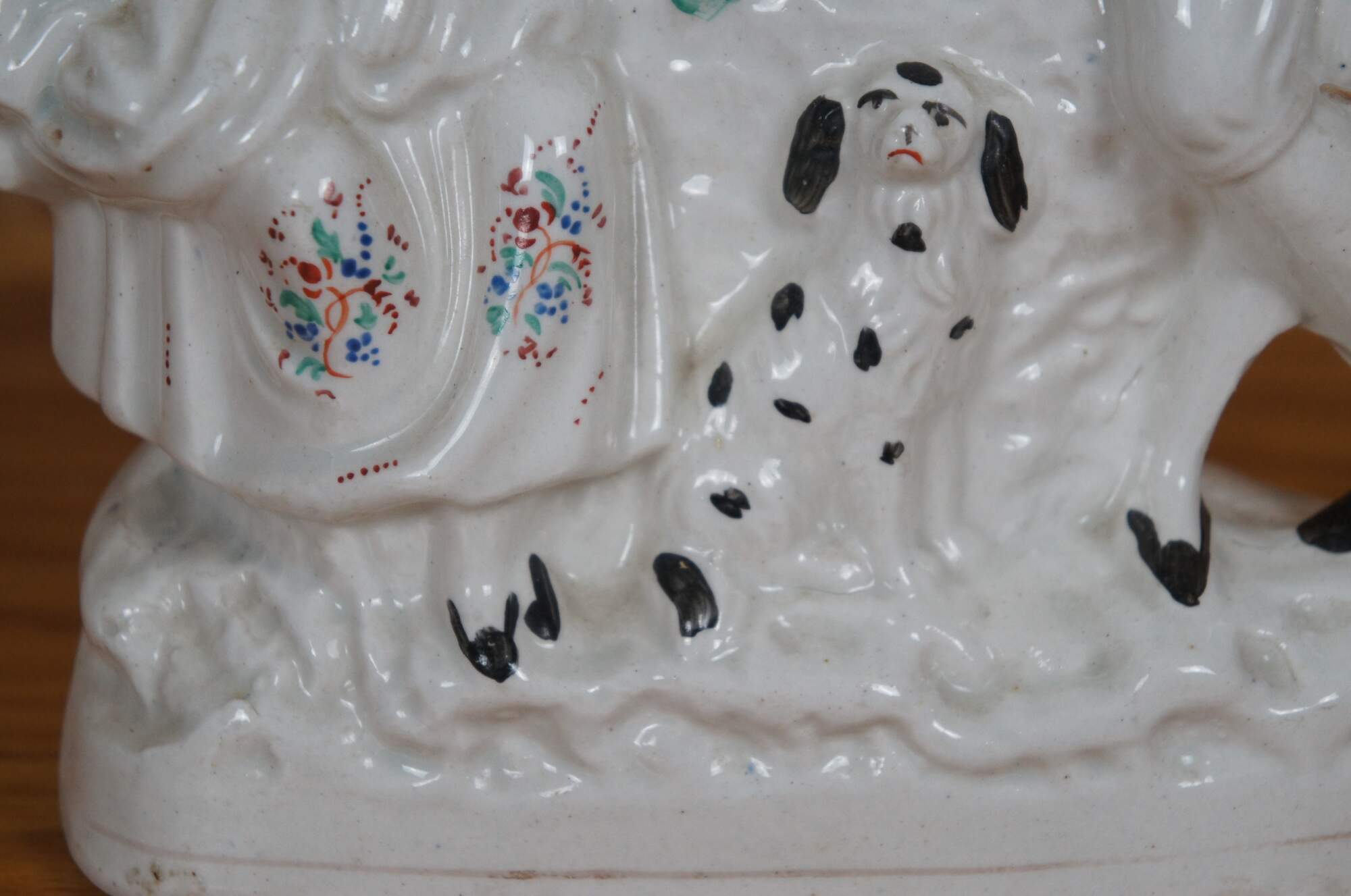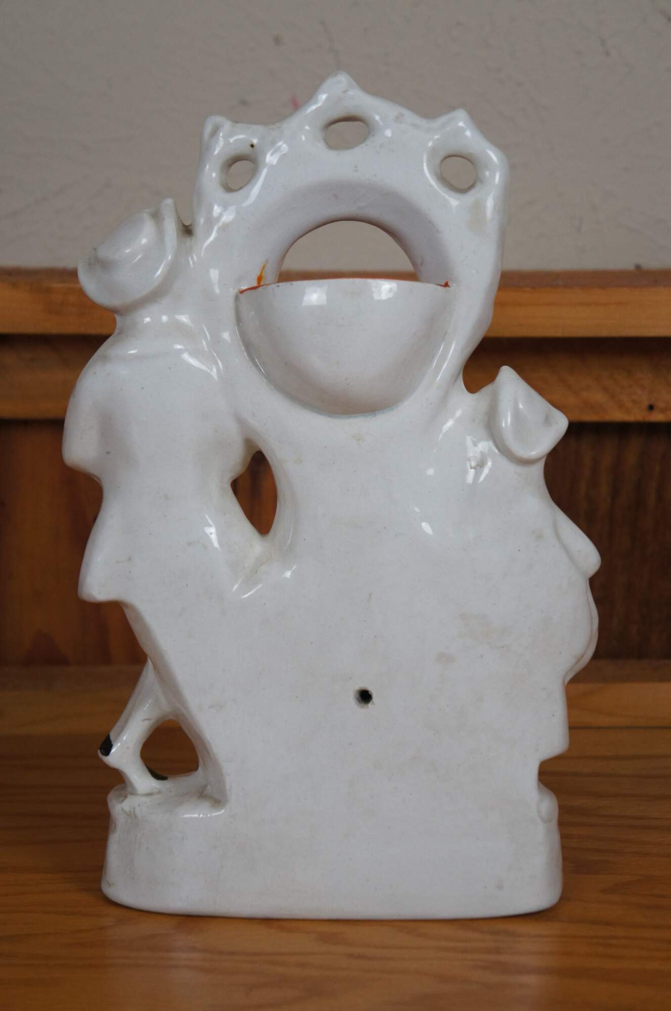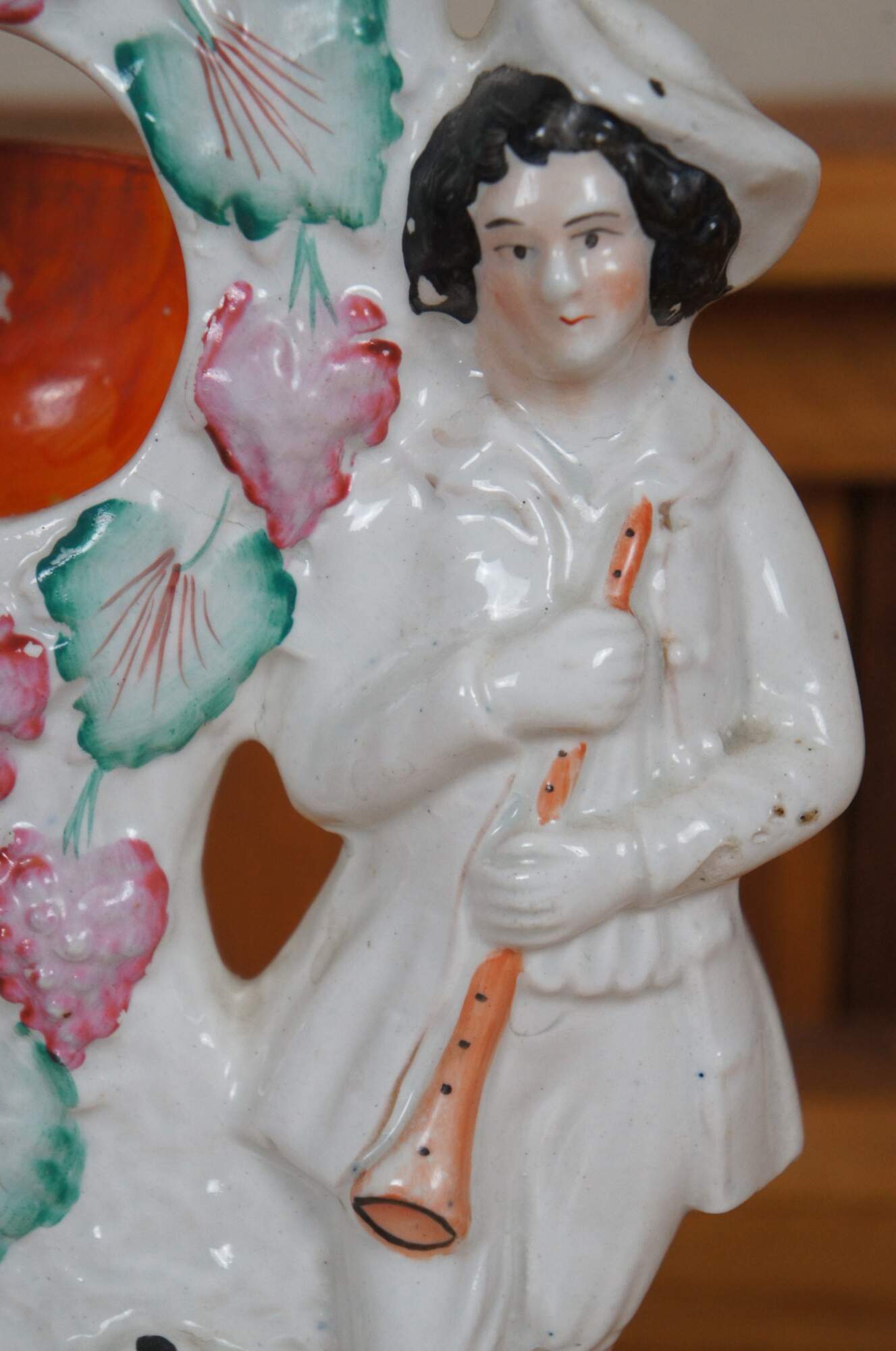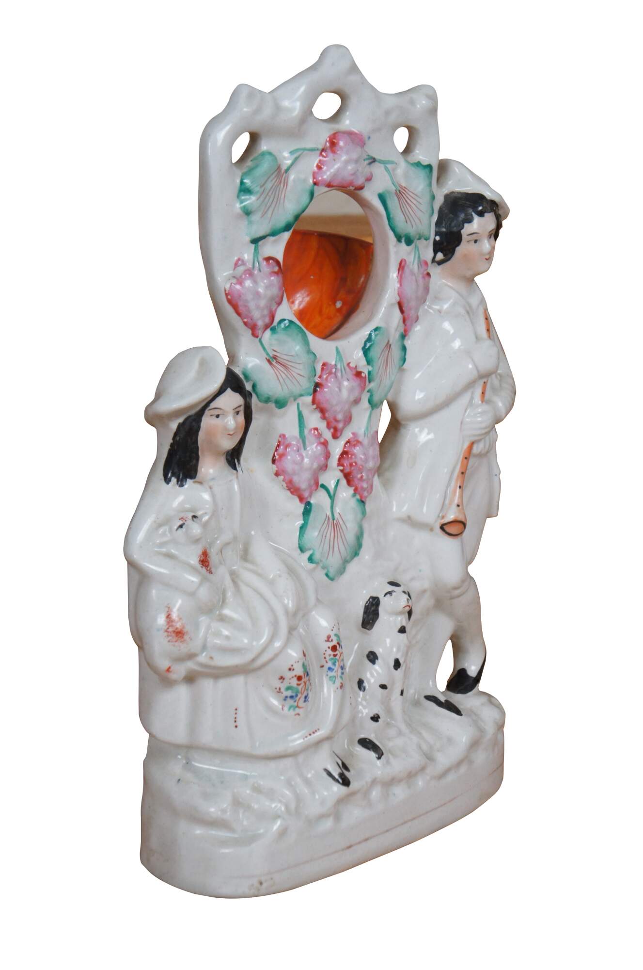 Antique 19th century Staffordshire porcelain flatback mantel figurine designed with a cup shaped section to hold a pocketwatch, allowing it to serve as a table clock. Figure depicts a shepherd with a flute and shepherdess holding a lamb on her lap, with a black and white spaniel seated at the base of a grapevine covered tree.