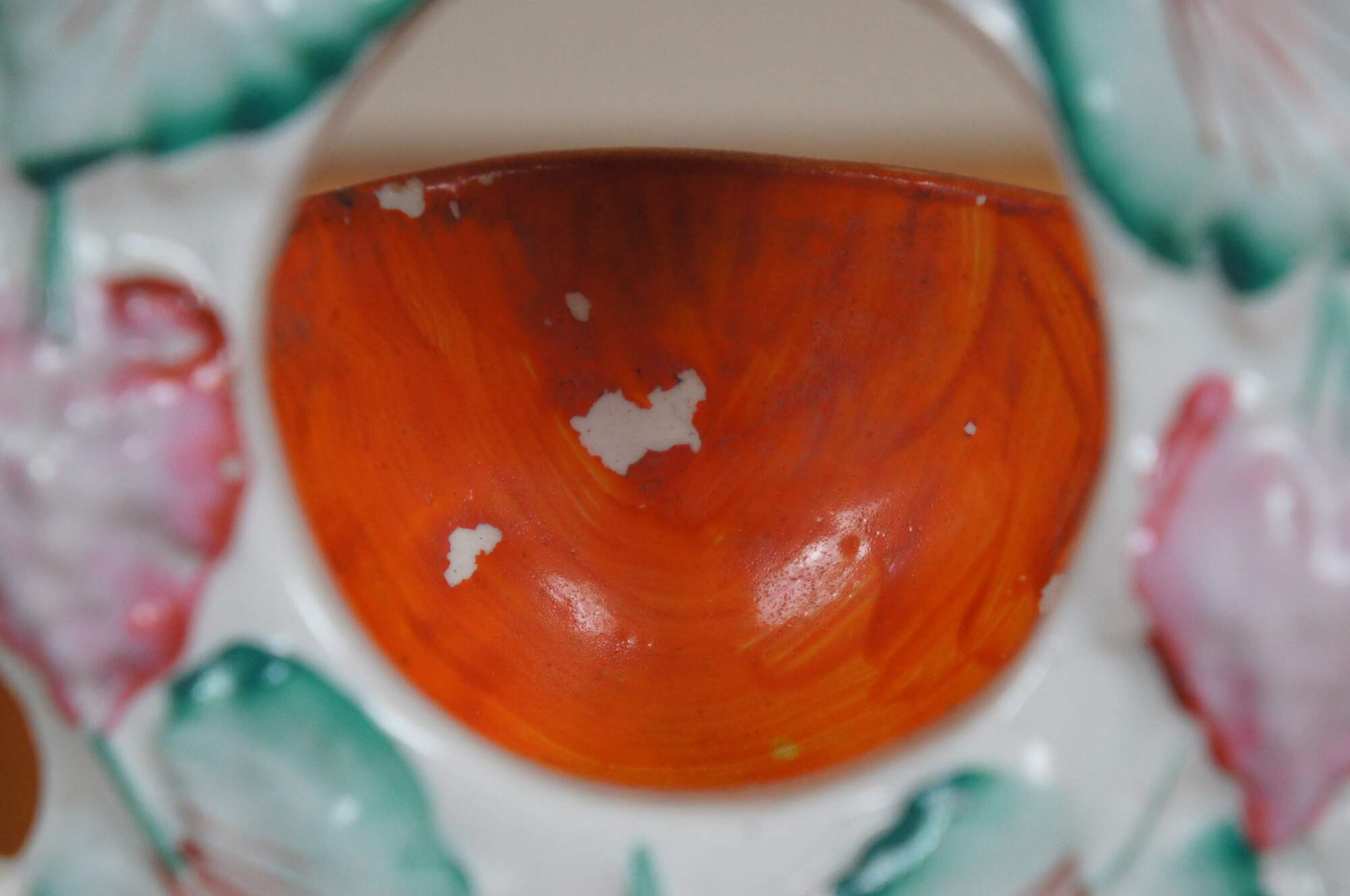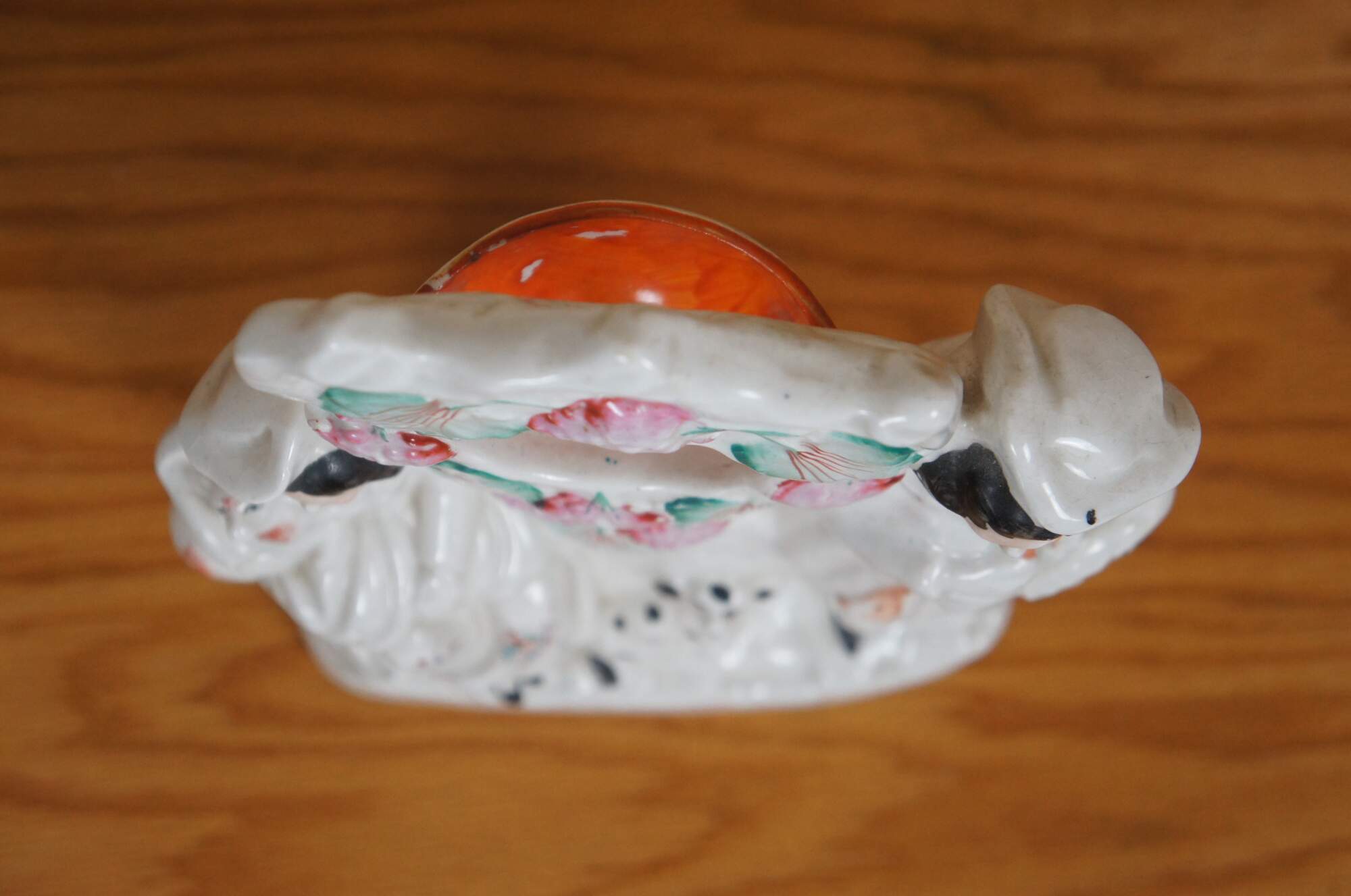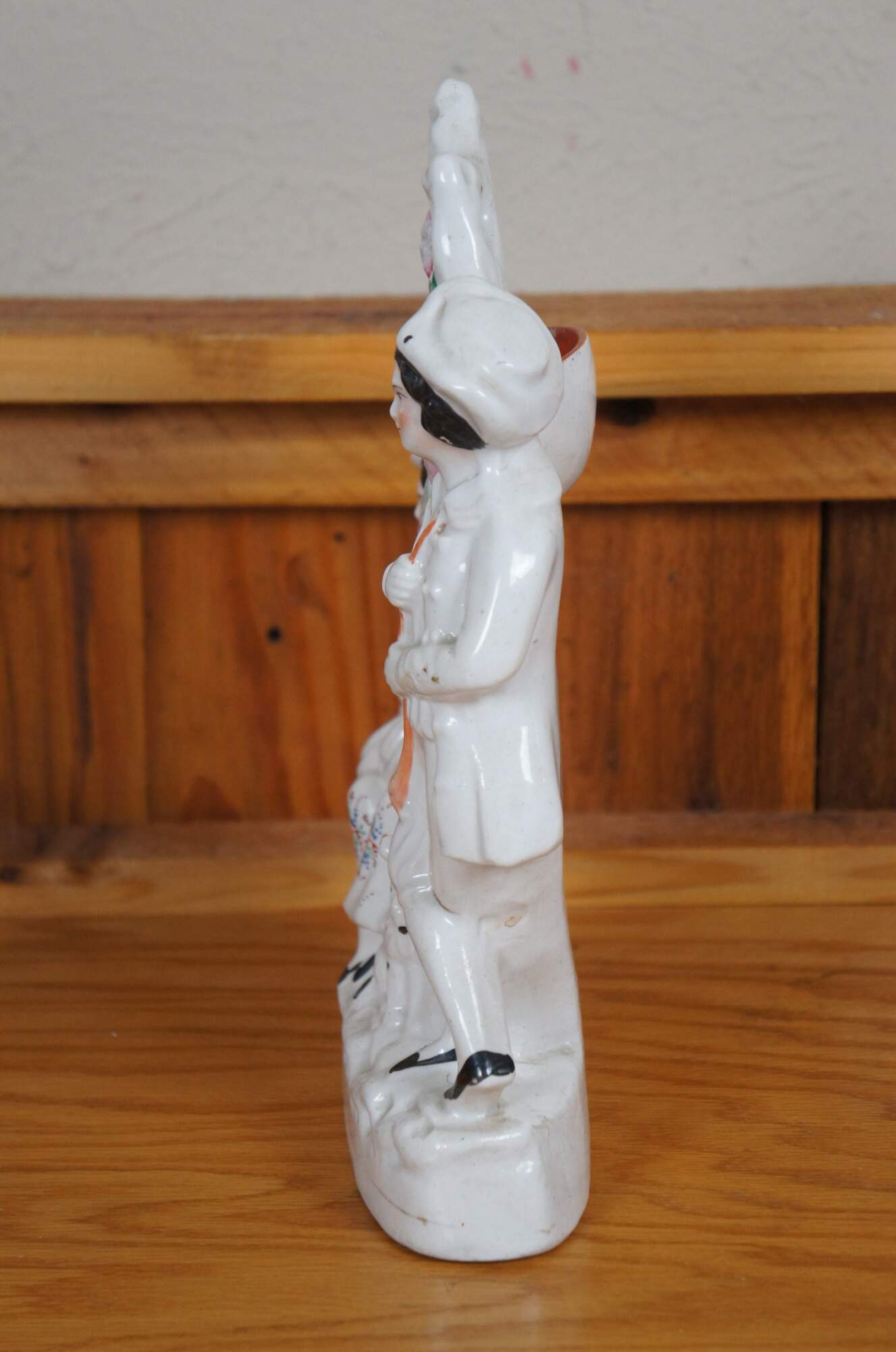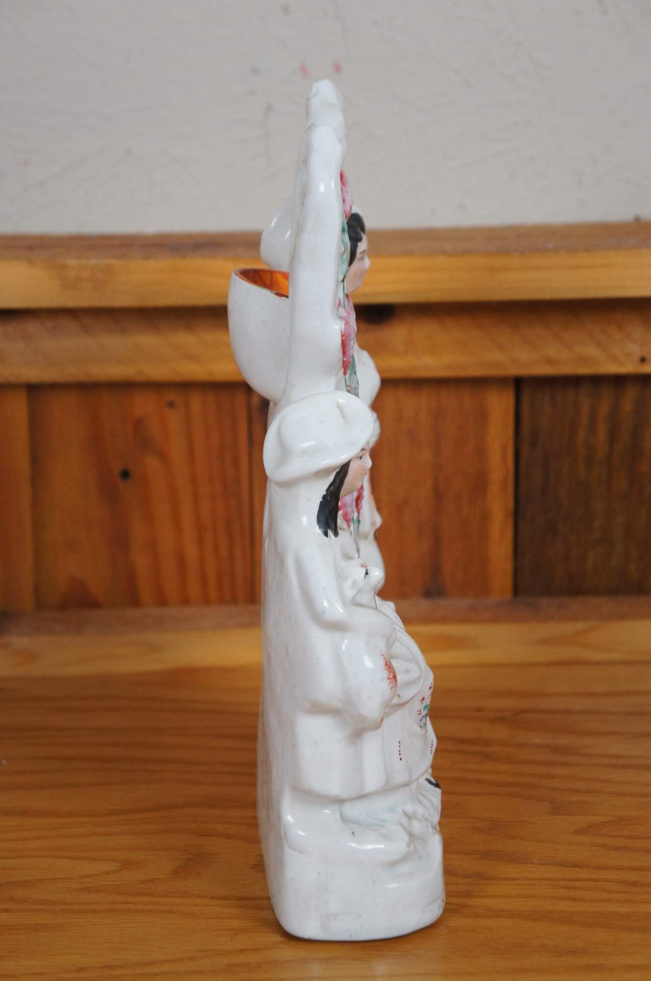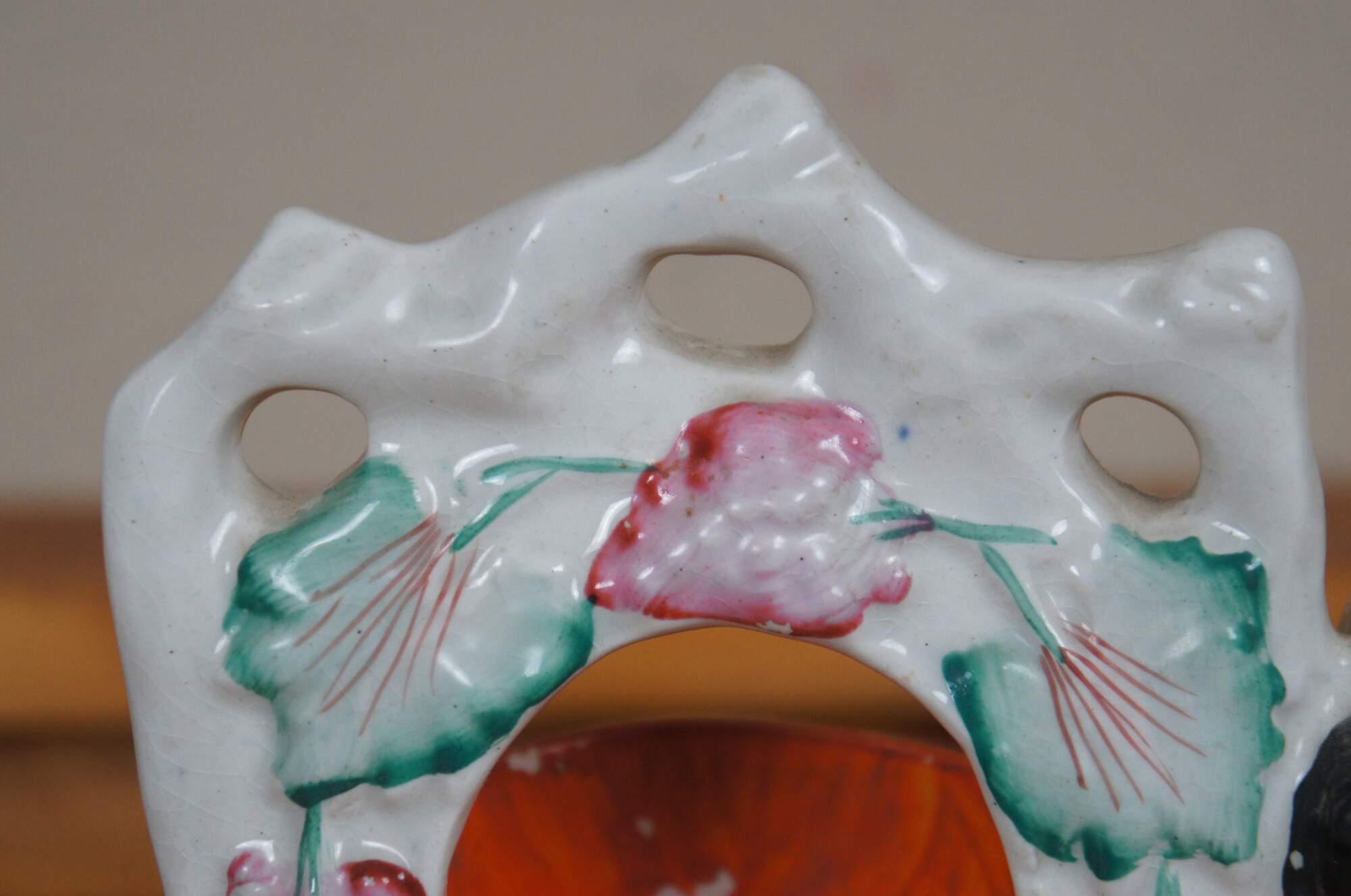 Antique 19th century Staffordshire porcelain flatback mantel figurine designed with a cup shaped section to hold a pocketwatch, allowing it to serve as a table clock. Figure depicts a shepherd with a flute and shepherdess holding a lamb on her lap, with a black and white spaniel seated at the base of a grapevine covered tree.