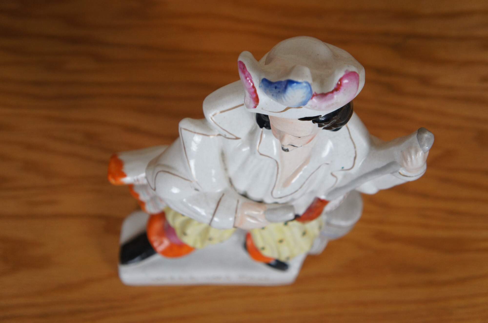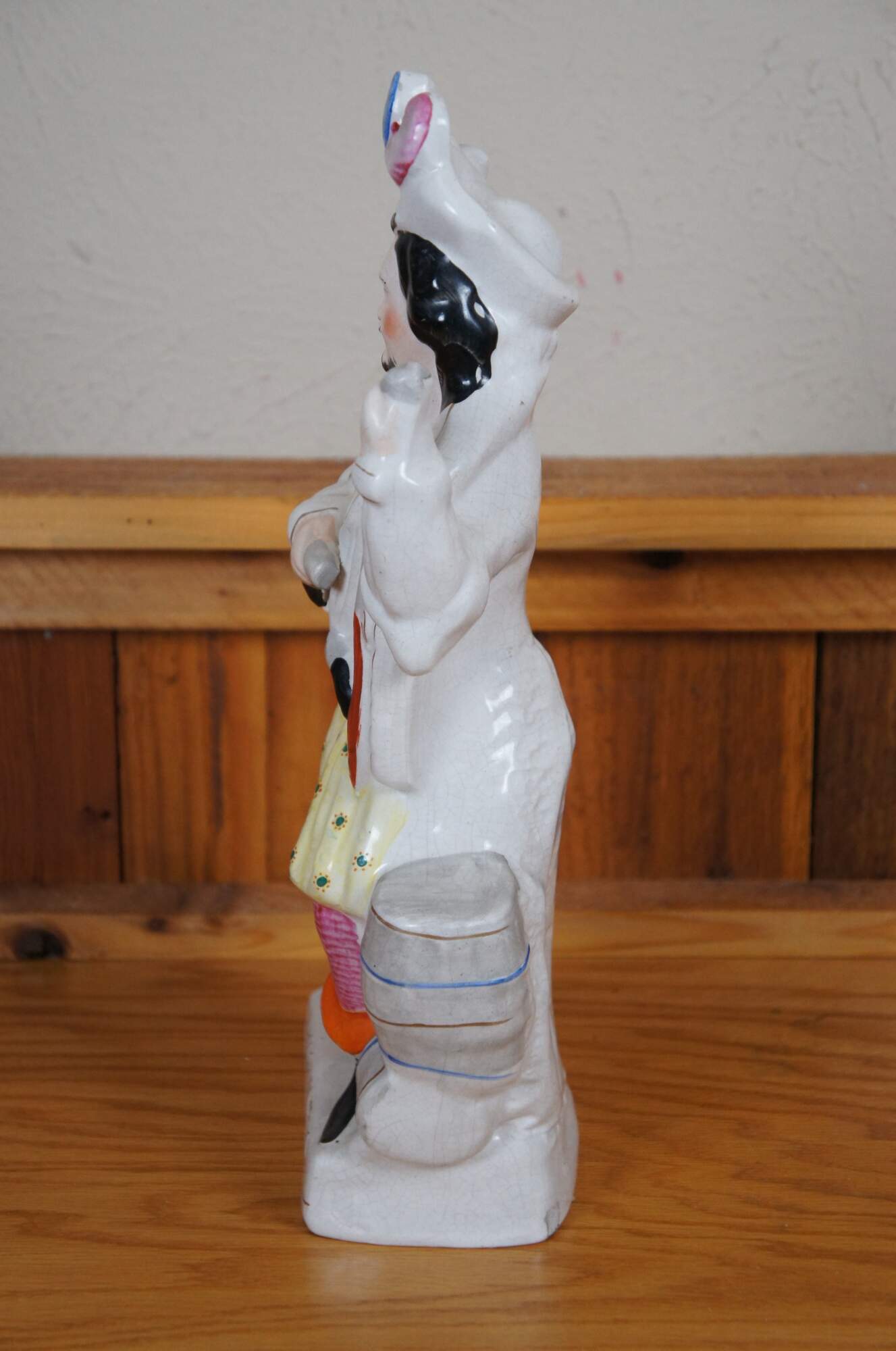 Antique 19th century Staffordshire porcelain flatback figurine depicting English smuggler/highwayman Will Watch, posed with weapons / shotgun / gun and barrels. This figure is also known as the Bold Smuggler and Pirate. Circa 1860s.