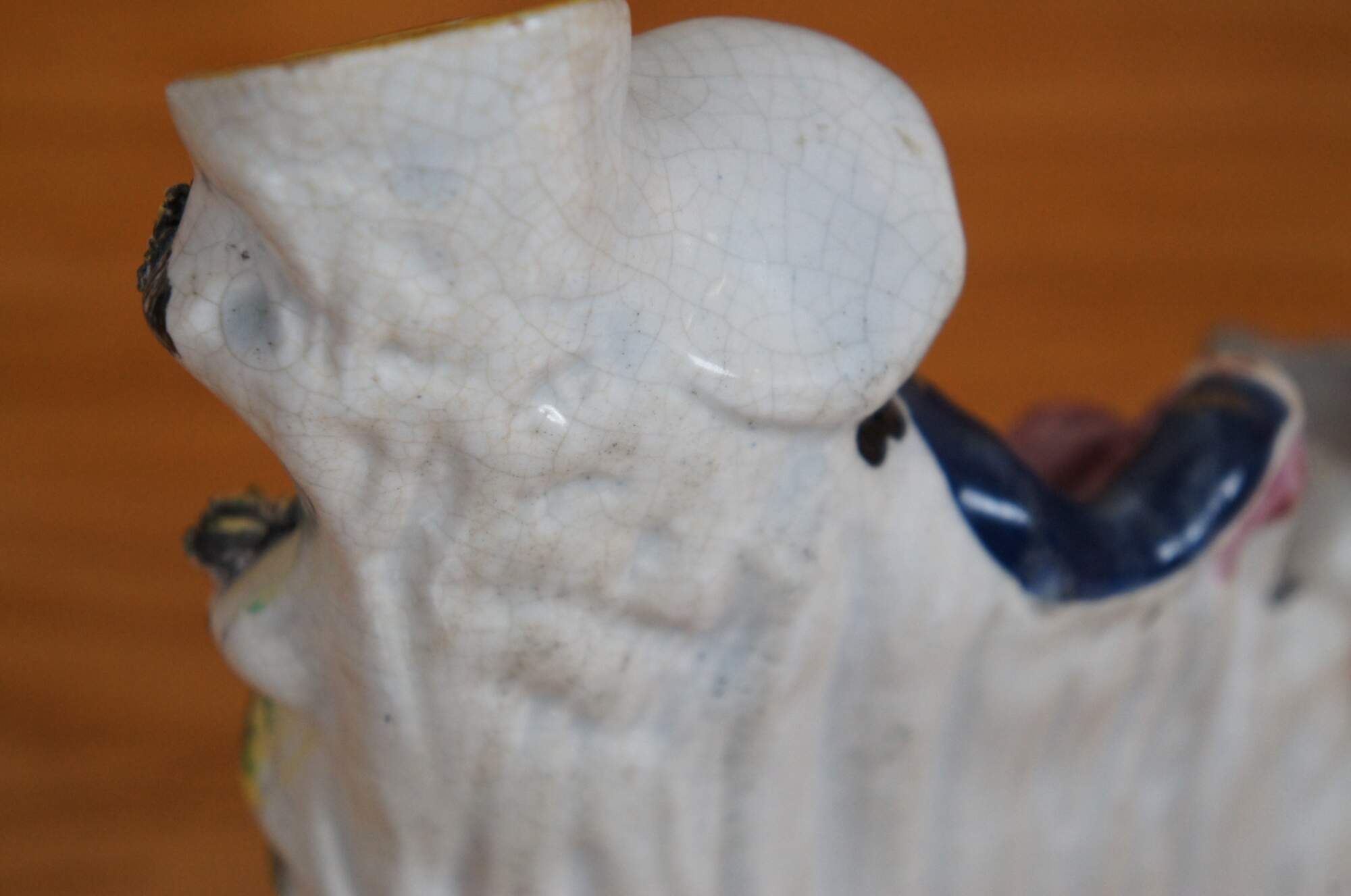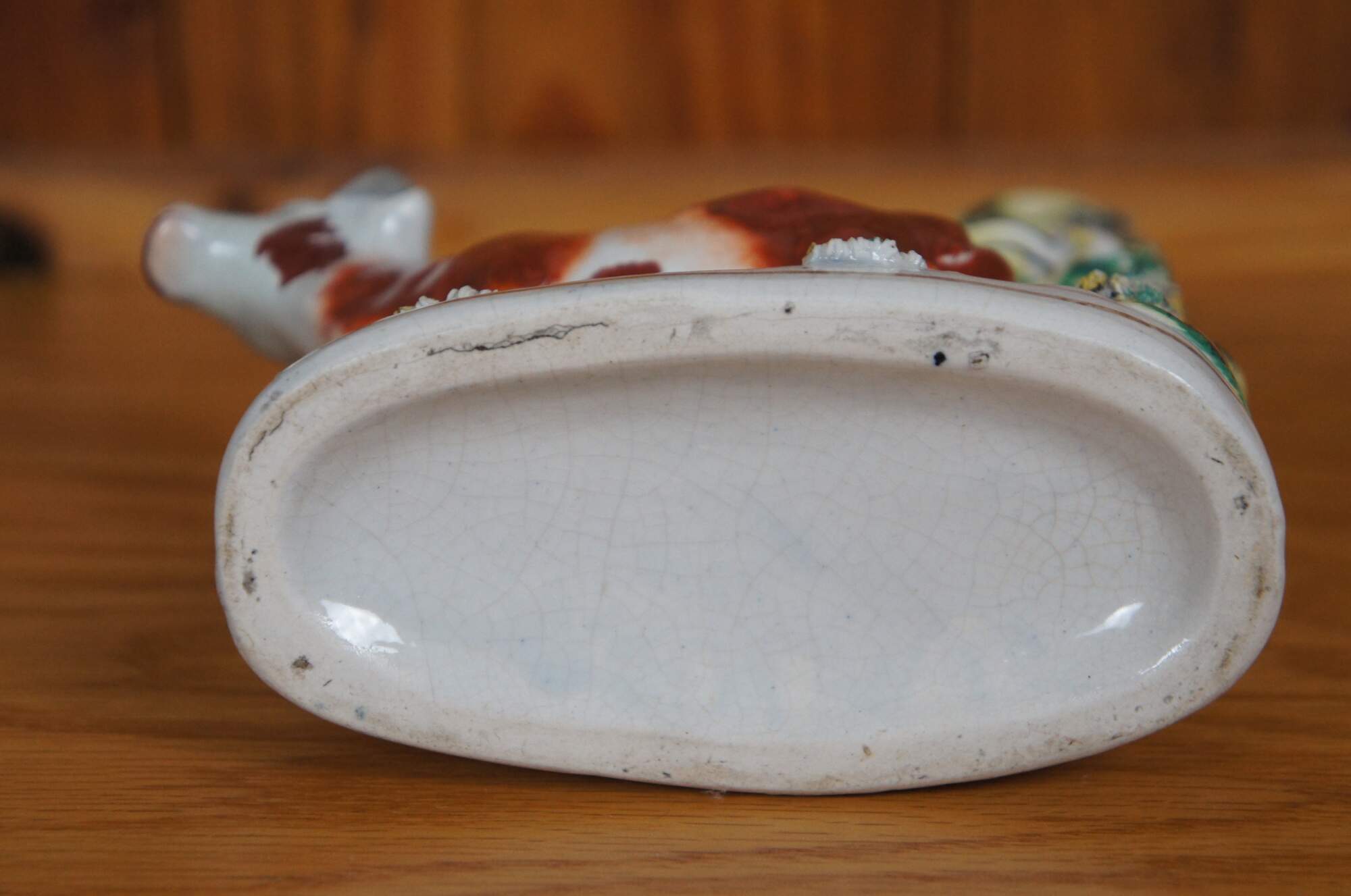 Antique 19th century Staffordshire porcelain flatback figural spill vase depicting a farmhouse scene with male figure recling against a tree with a red and white cow and milk bucket. This figurine was originally paired with a right facing milk maid.