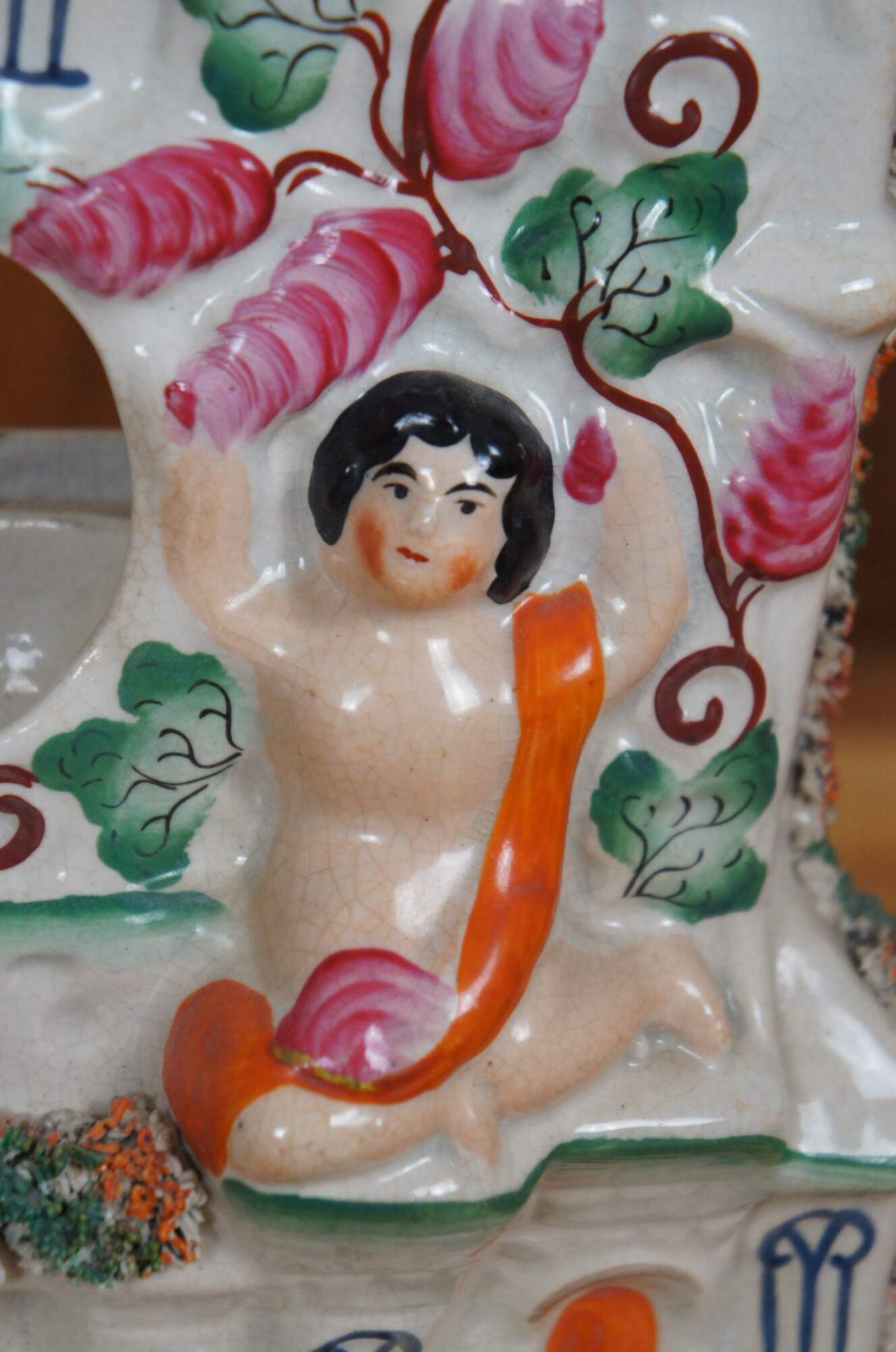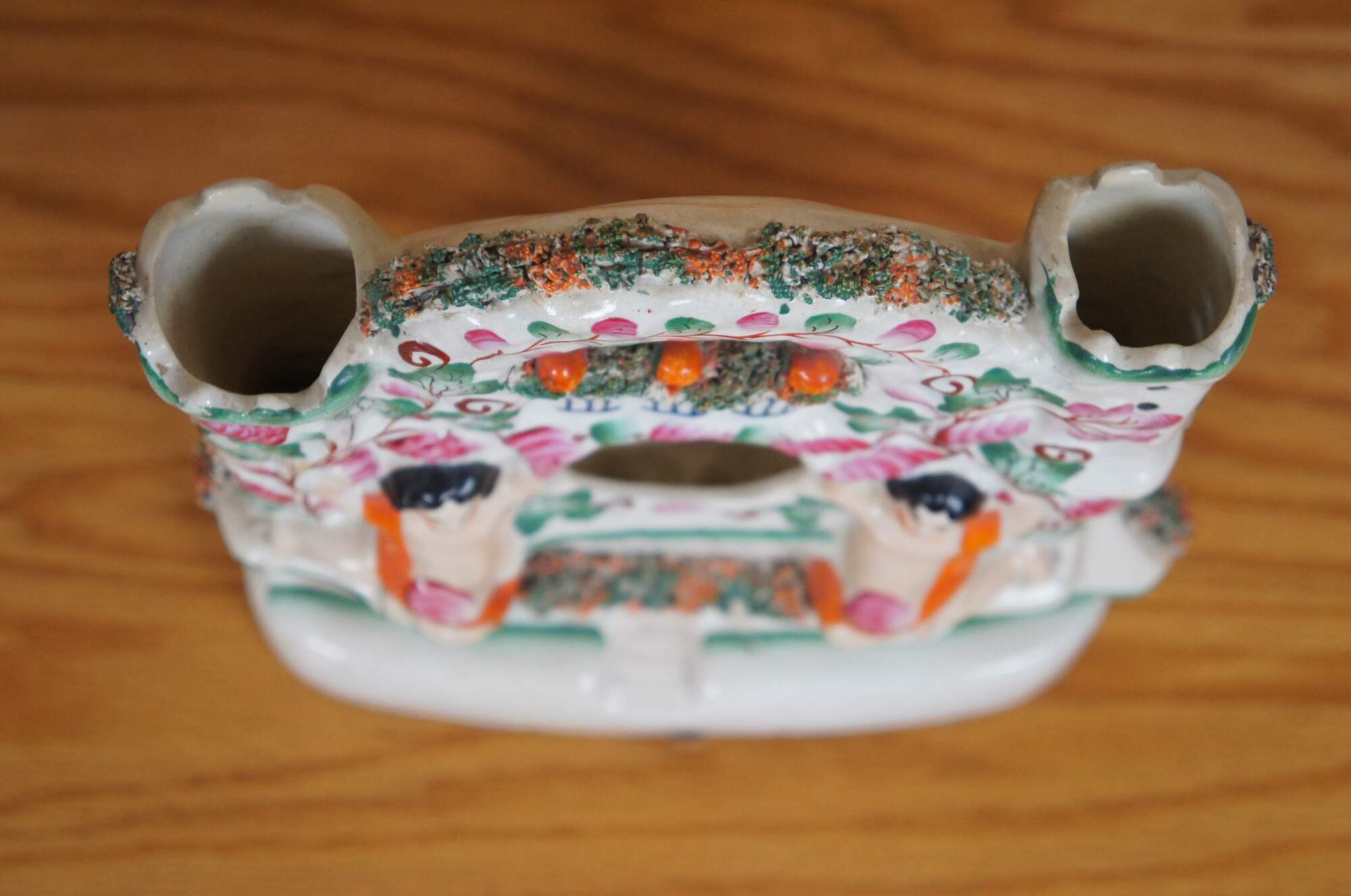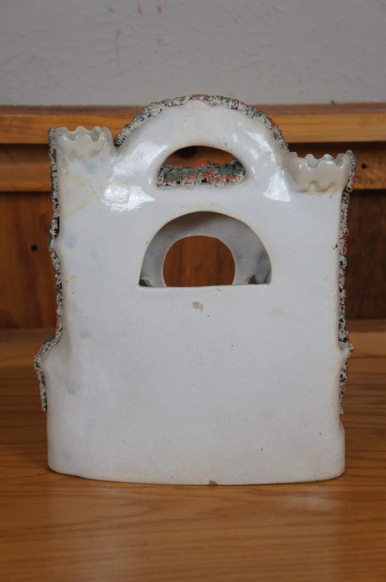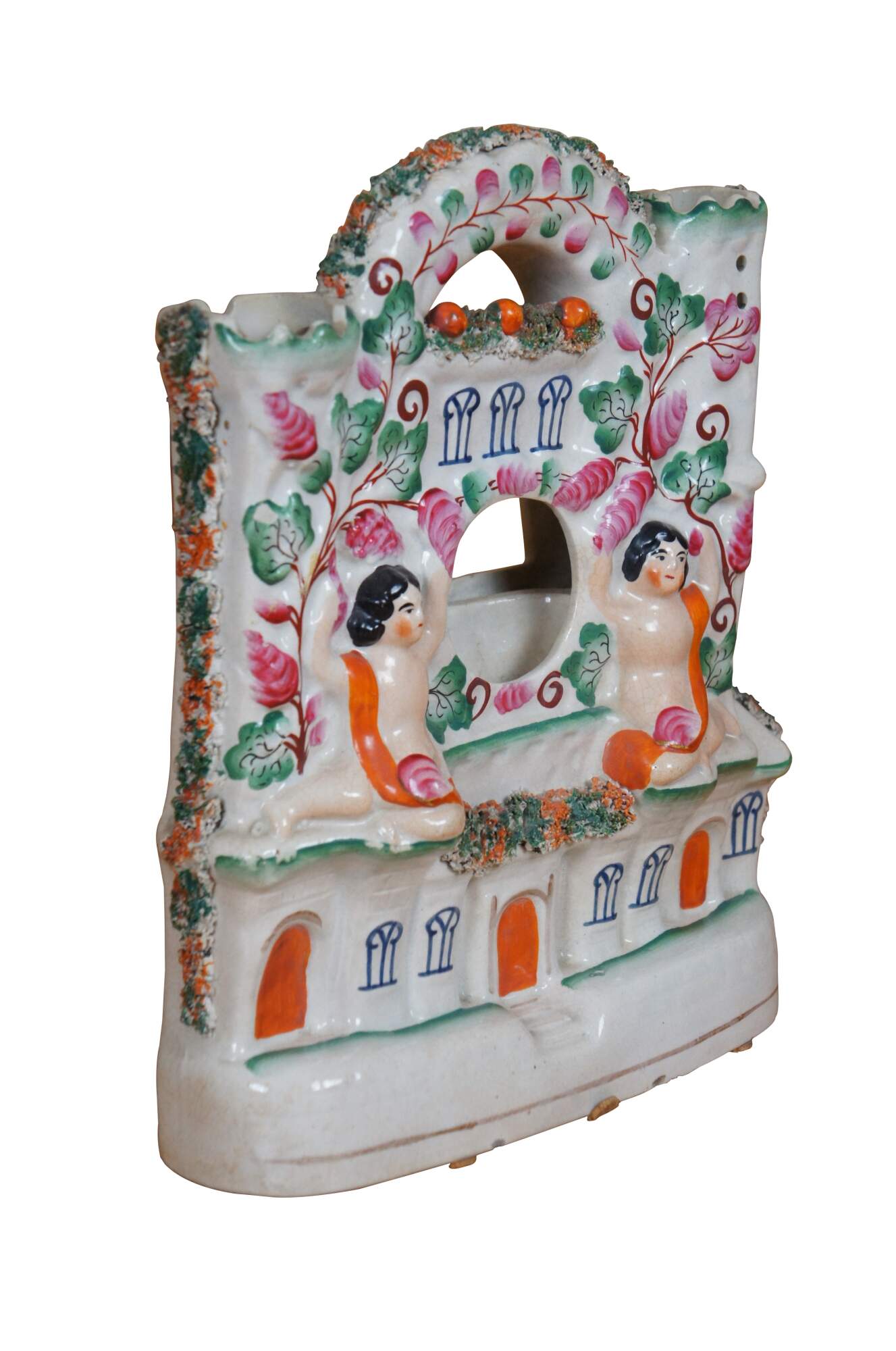 Antique 19th century English Staffordshire porcelain flatback figurine in the shape of a castle / manor house covereed in flowering vines and a pair of cherubs flanking the cup shaped section for displaying a pocketwatch for use as a table clock. The towers on either side also act as spill vases.