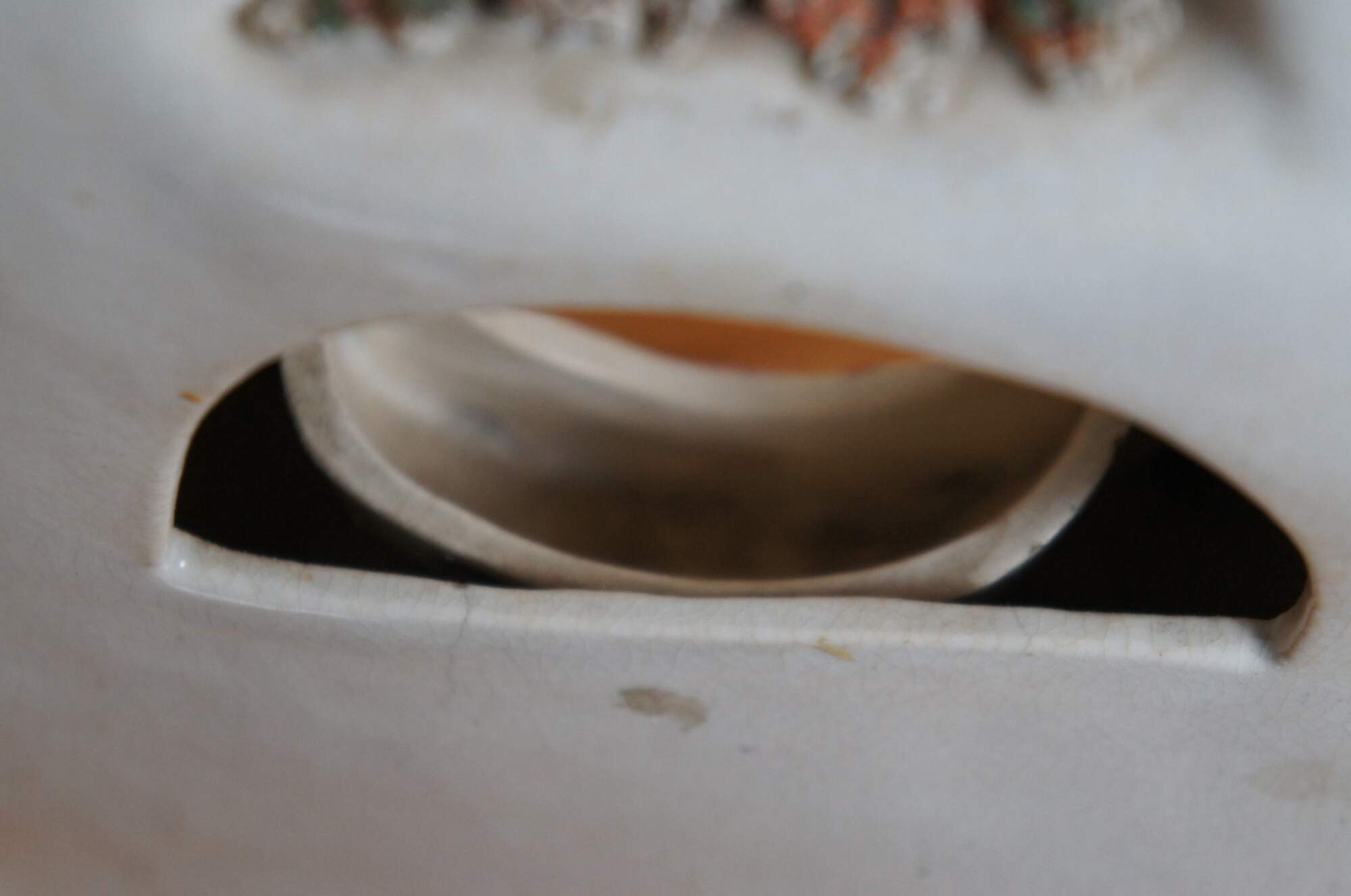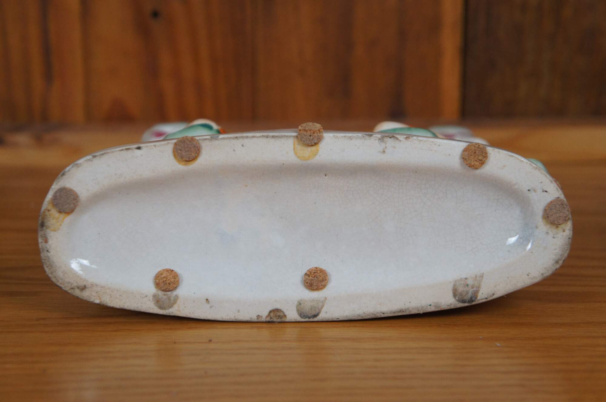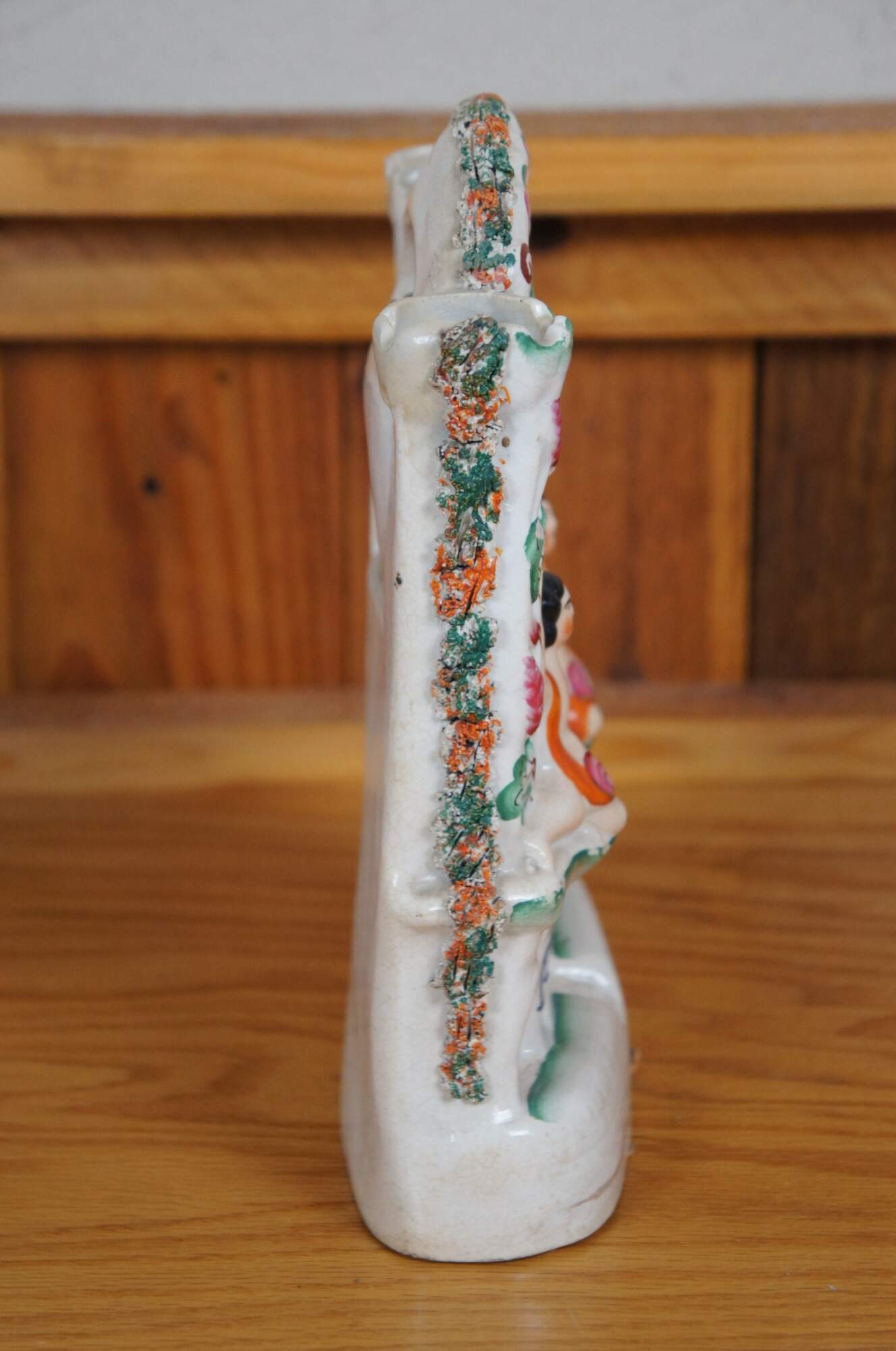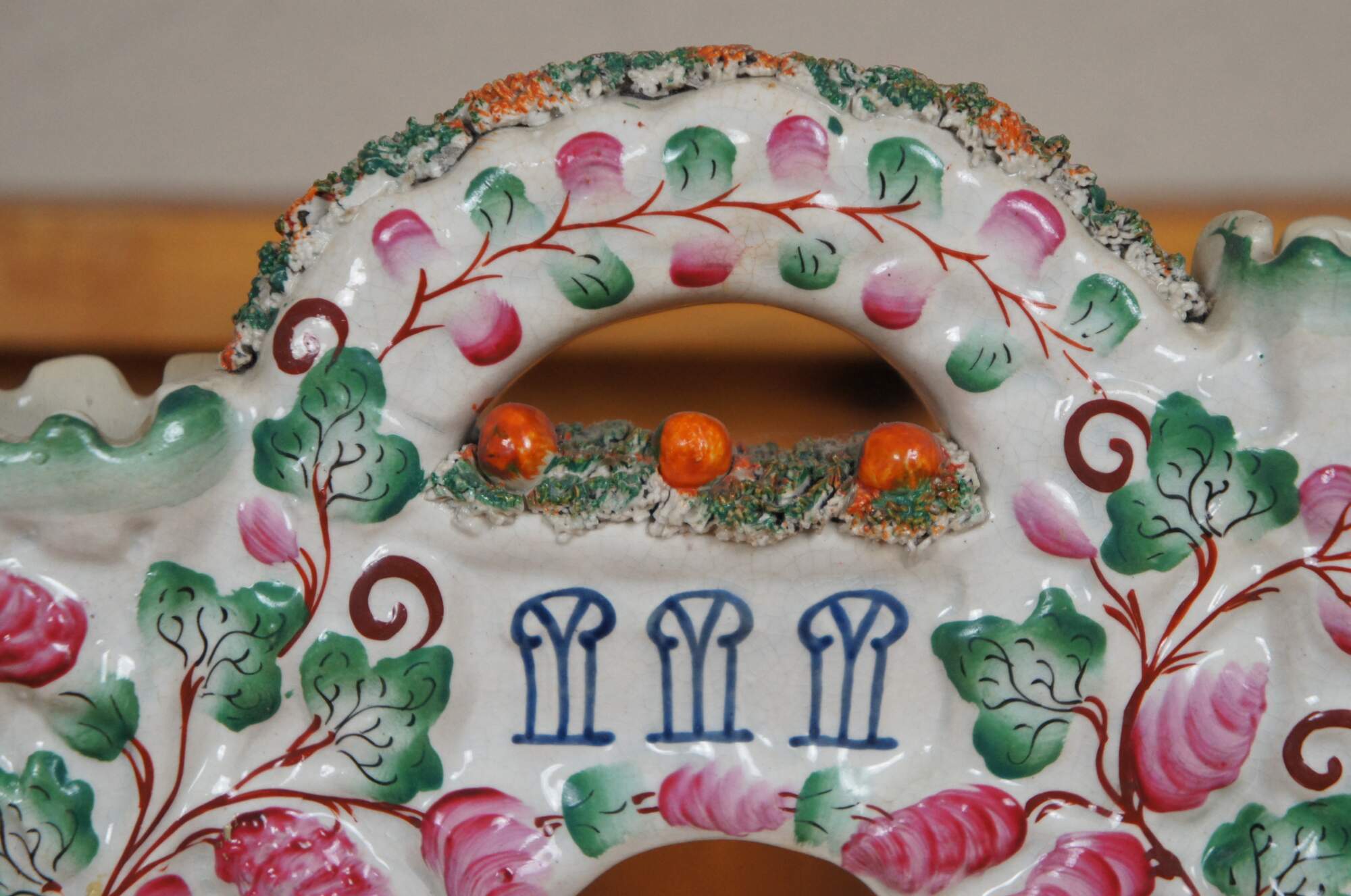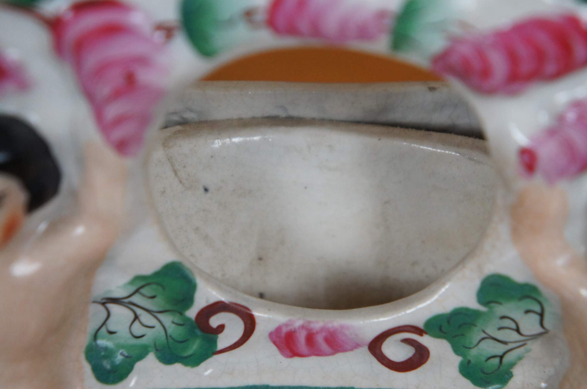Antique 19th century English Staffordshire porcelain flatback figurine in the shape of a castle / manor house covereed in flowering vines and a pair of cherubs flanking the cup shaped section for displaying a pocketwatch for use as a table clock. The towers on either side also act as spill vases.