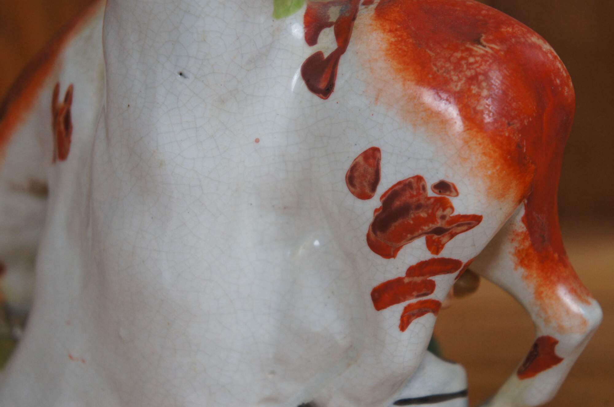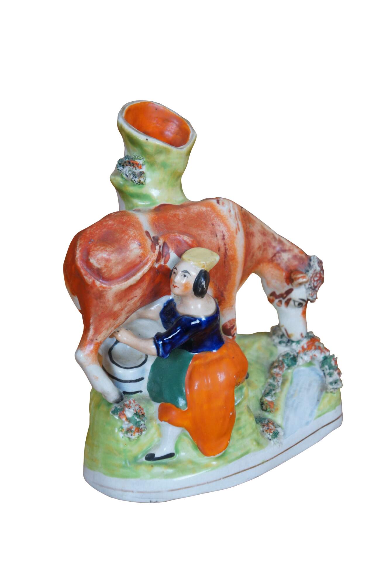 Antique 19th century porcelain flatback figural spill vase depicting a farmhouse scene with milkmaid in blue and orange, milking a red cow in a field.