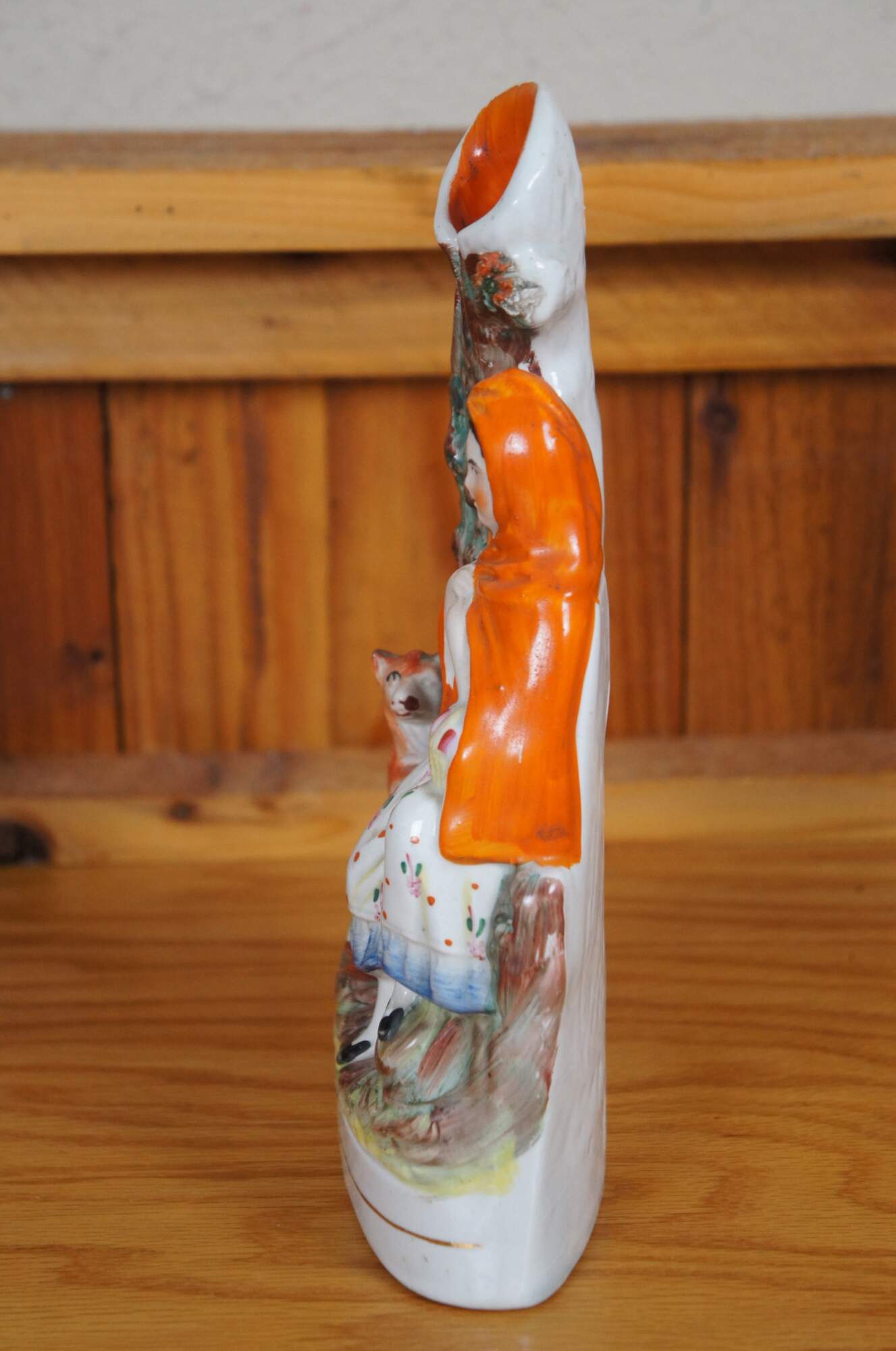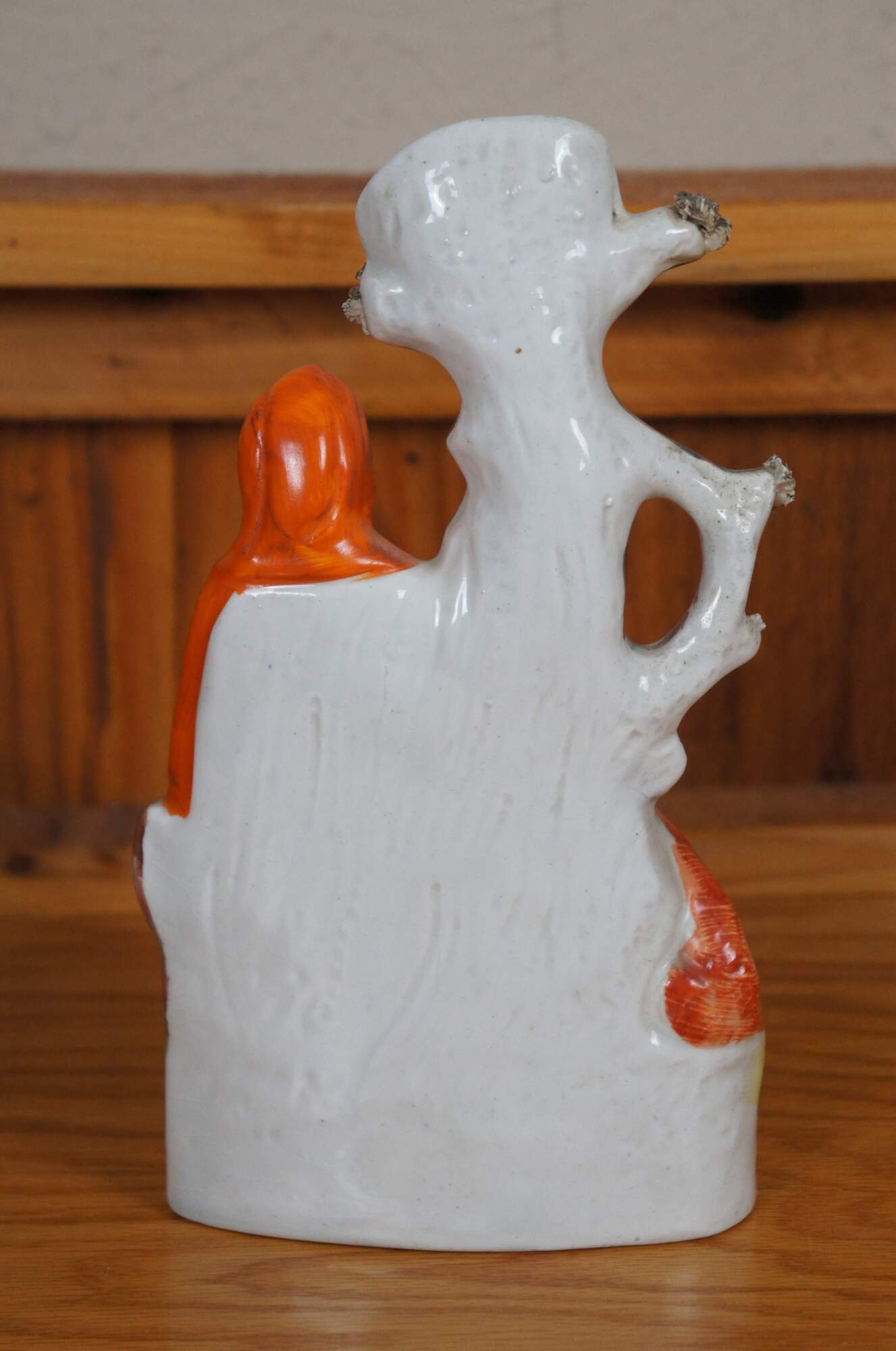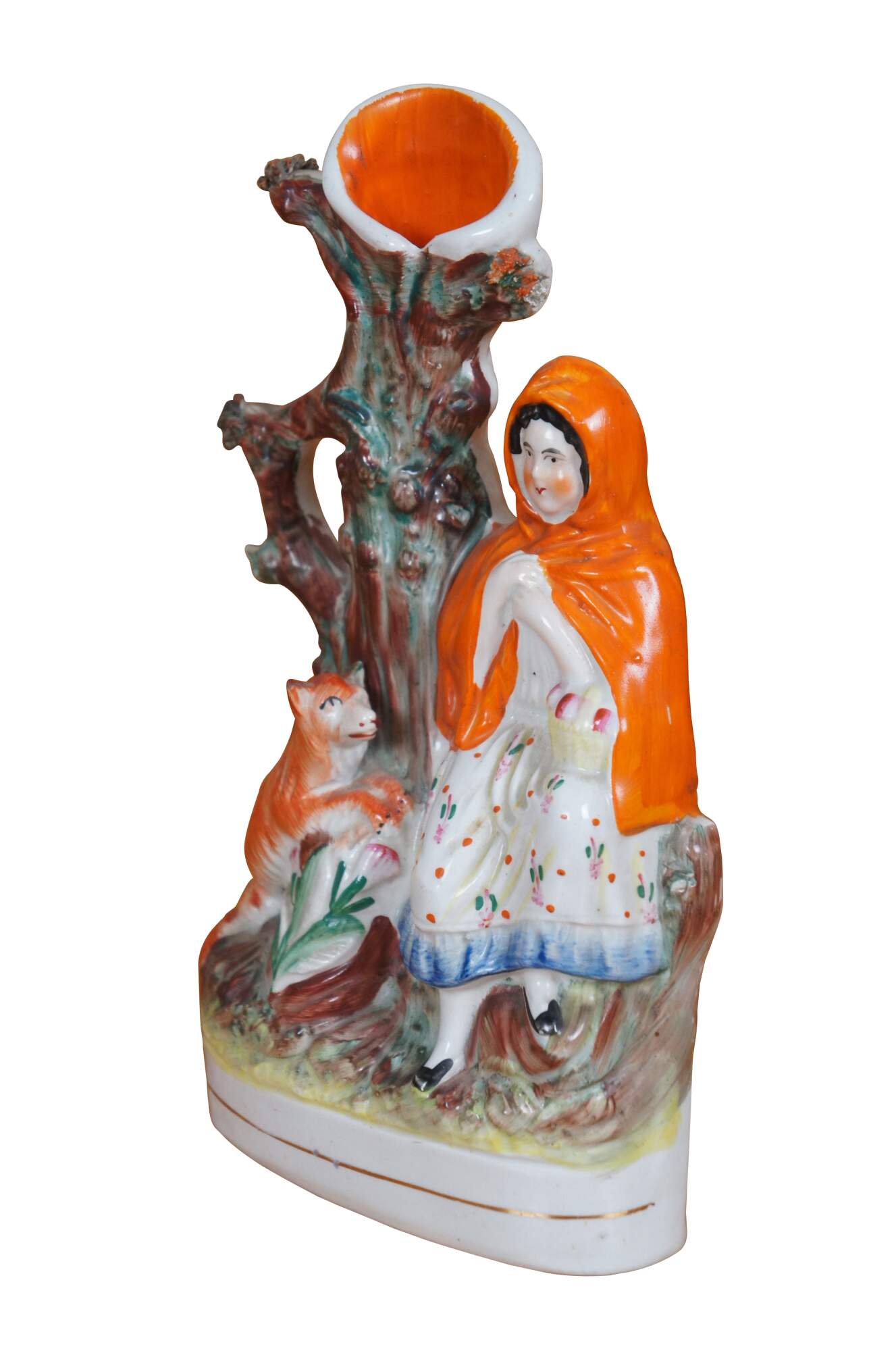 Antique 19th century Staffordshire porcelain flatback figural spill vase depicting fairy tale figure Little Red Riding Hood and the wolf standing next to a tree.