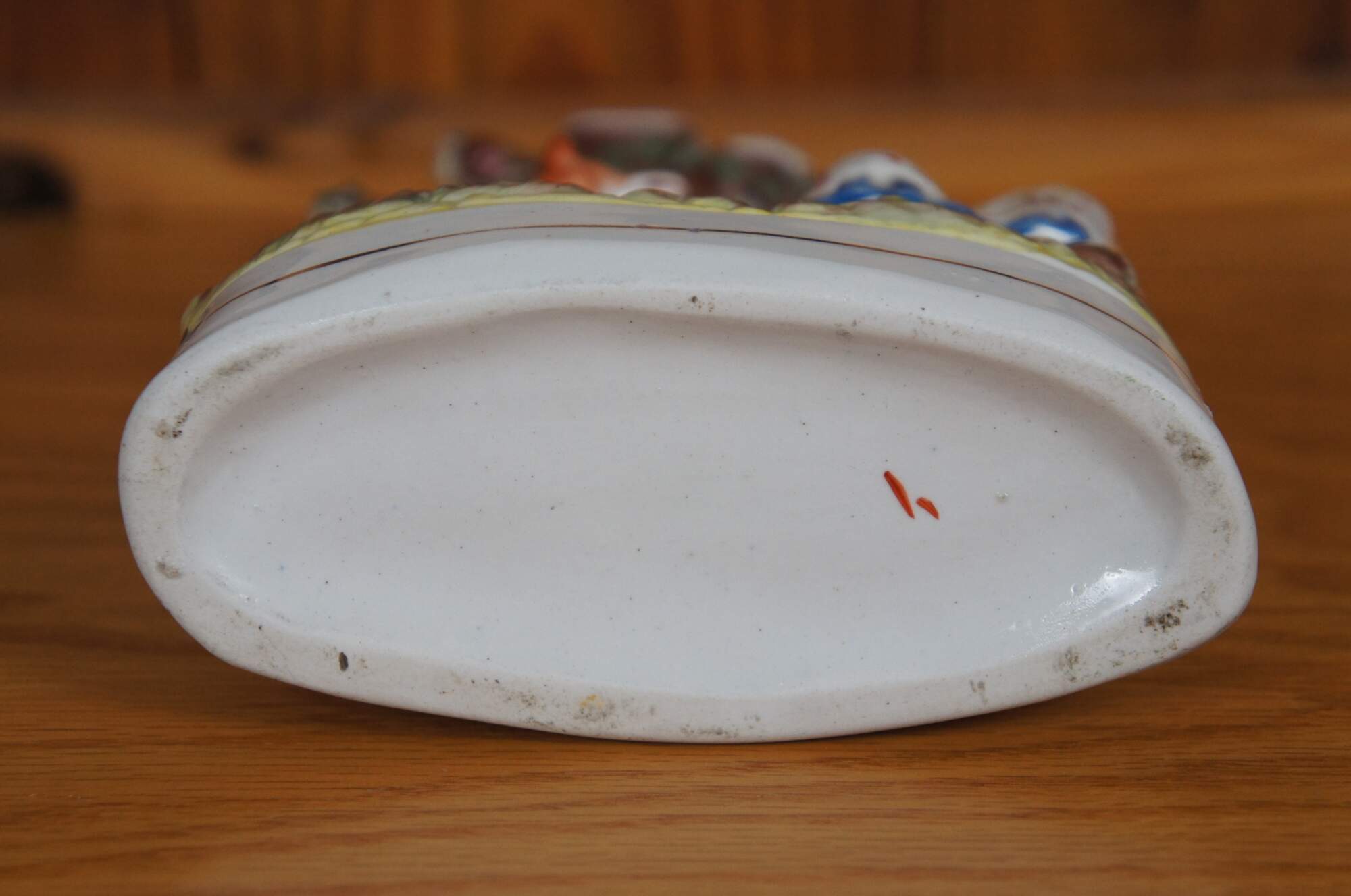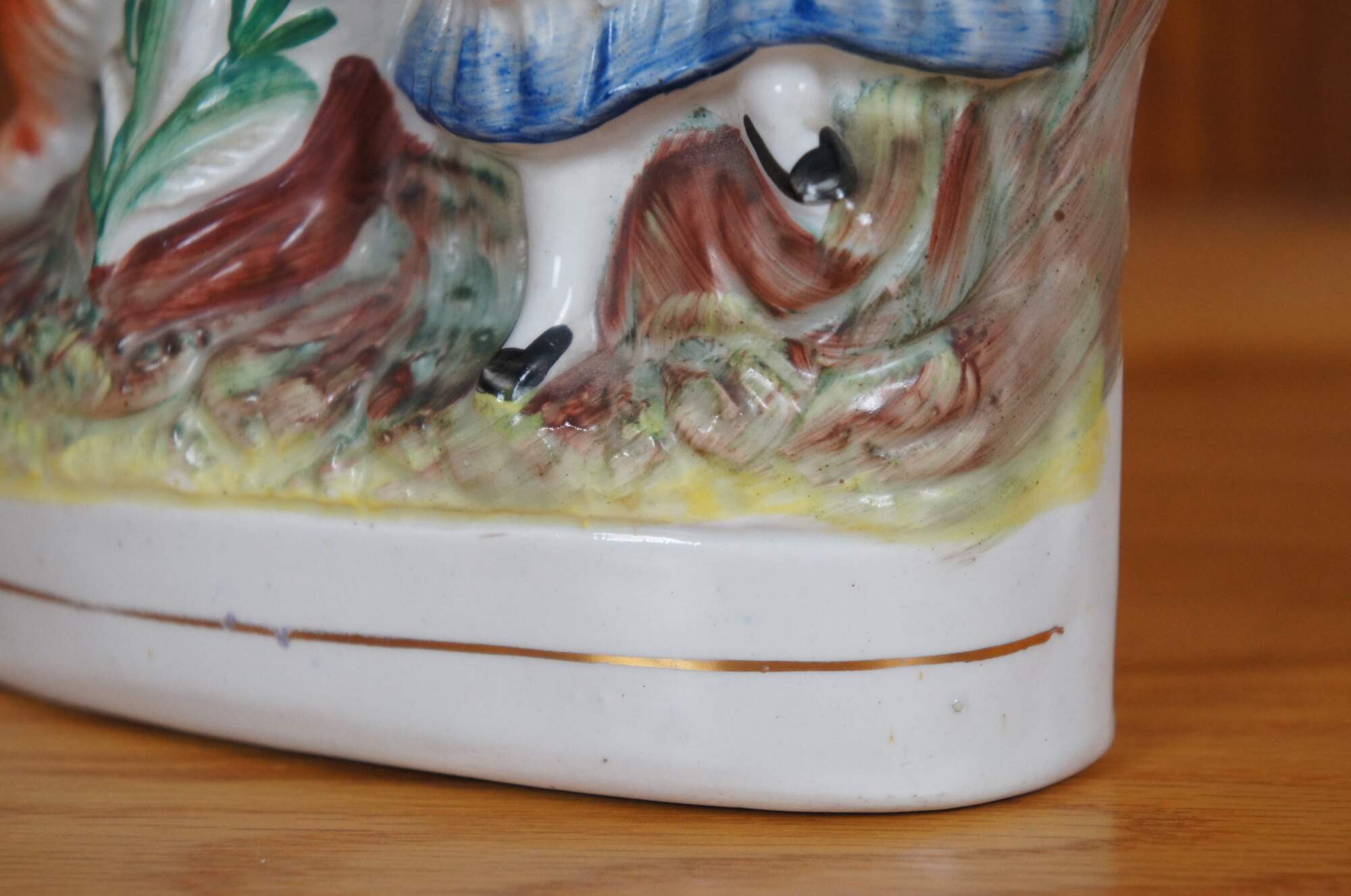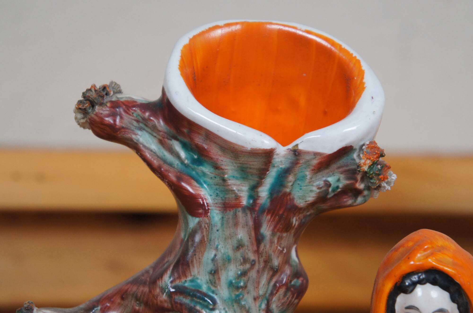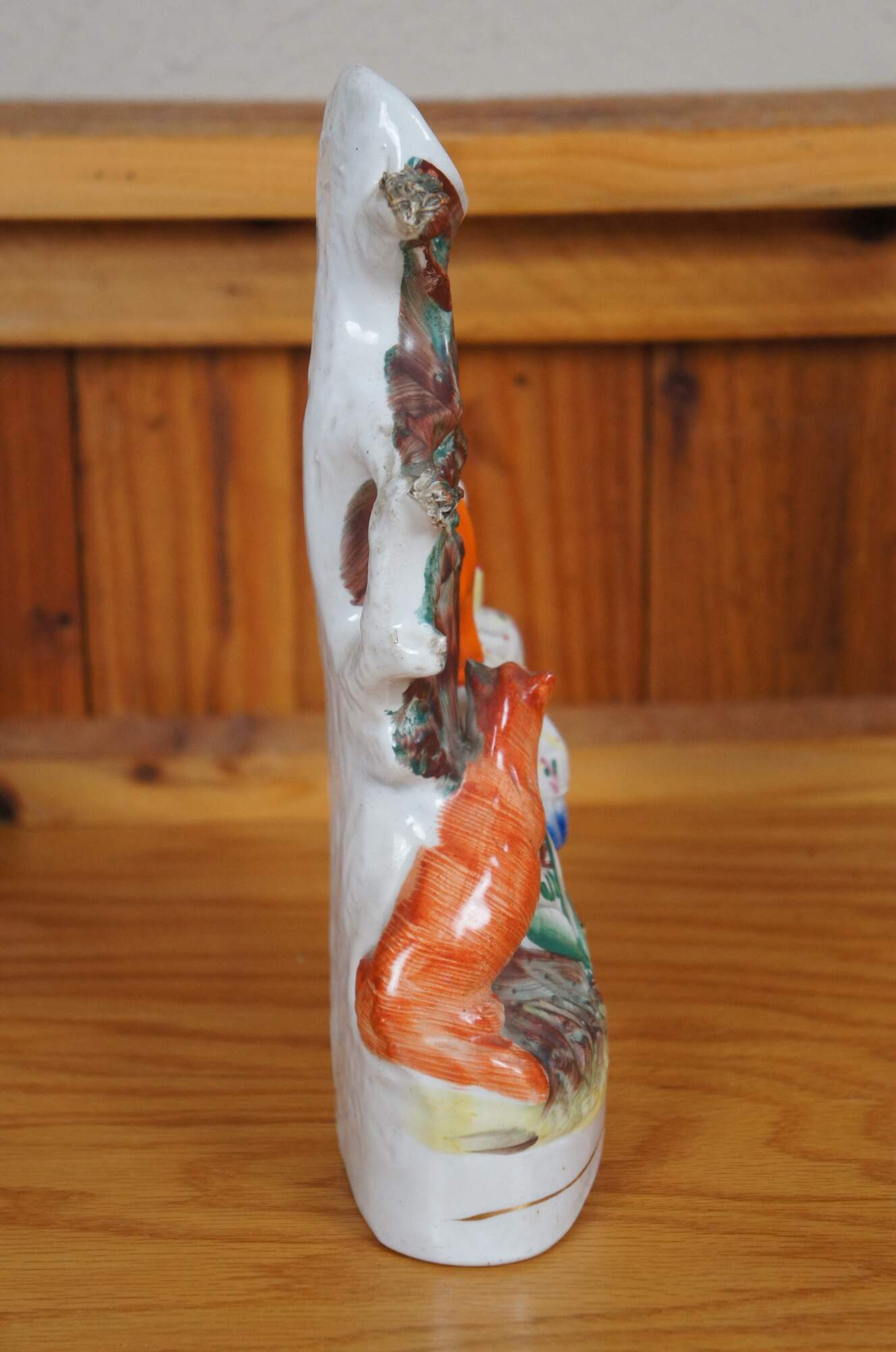 Antique 19th century Staffordshire porcelain flatback figural spill vase depicting fairy tale figure Little Red Riding Hood and the wolf standing next to a tree.