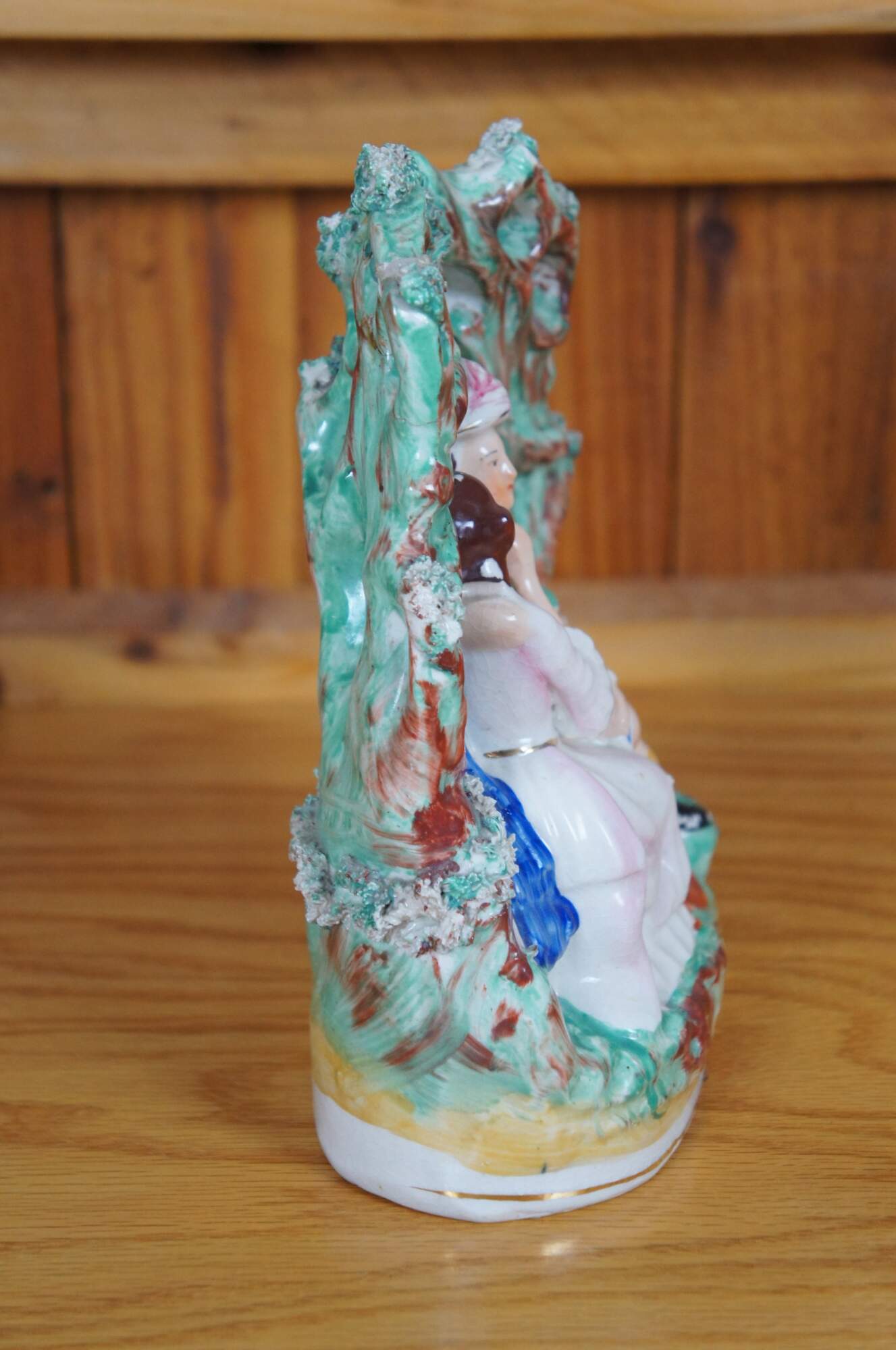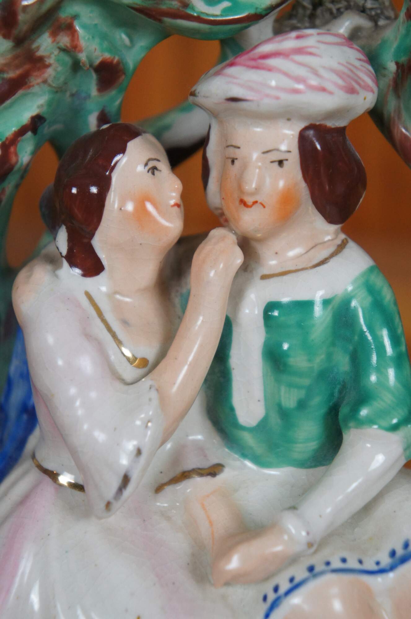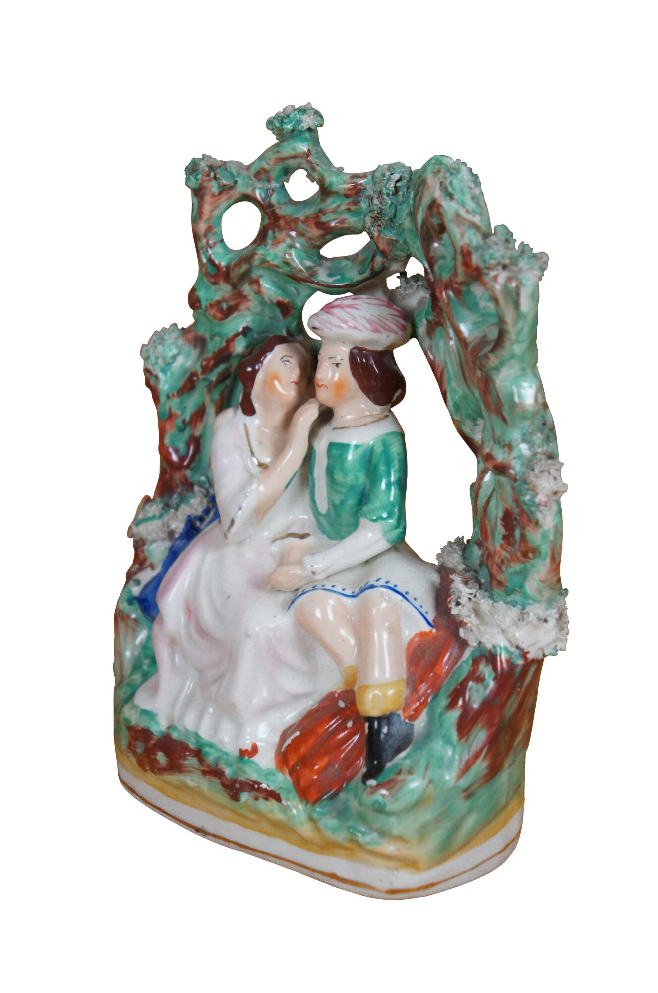 Antique 19th century Staffordshire porcelain flatback figurine depicting a pair of lovers / courting couple - Shakespeare's Romeo and Juliet - seated under a green bower / arbor / garden tree.