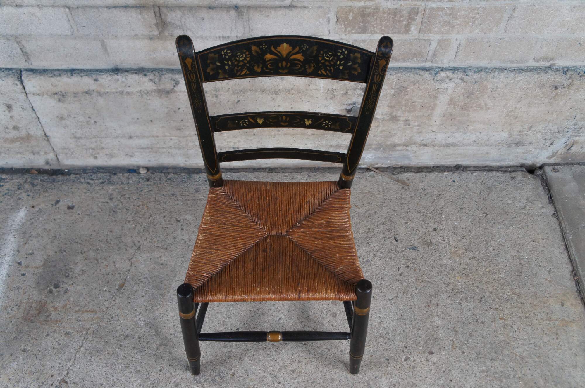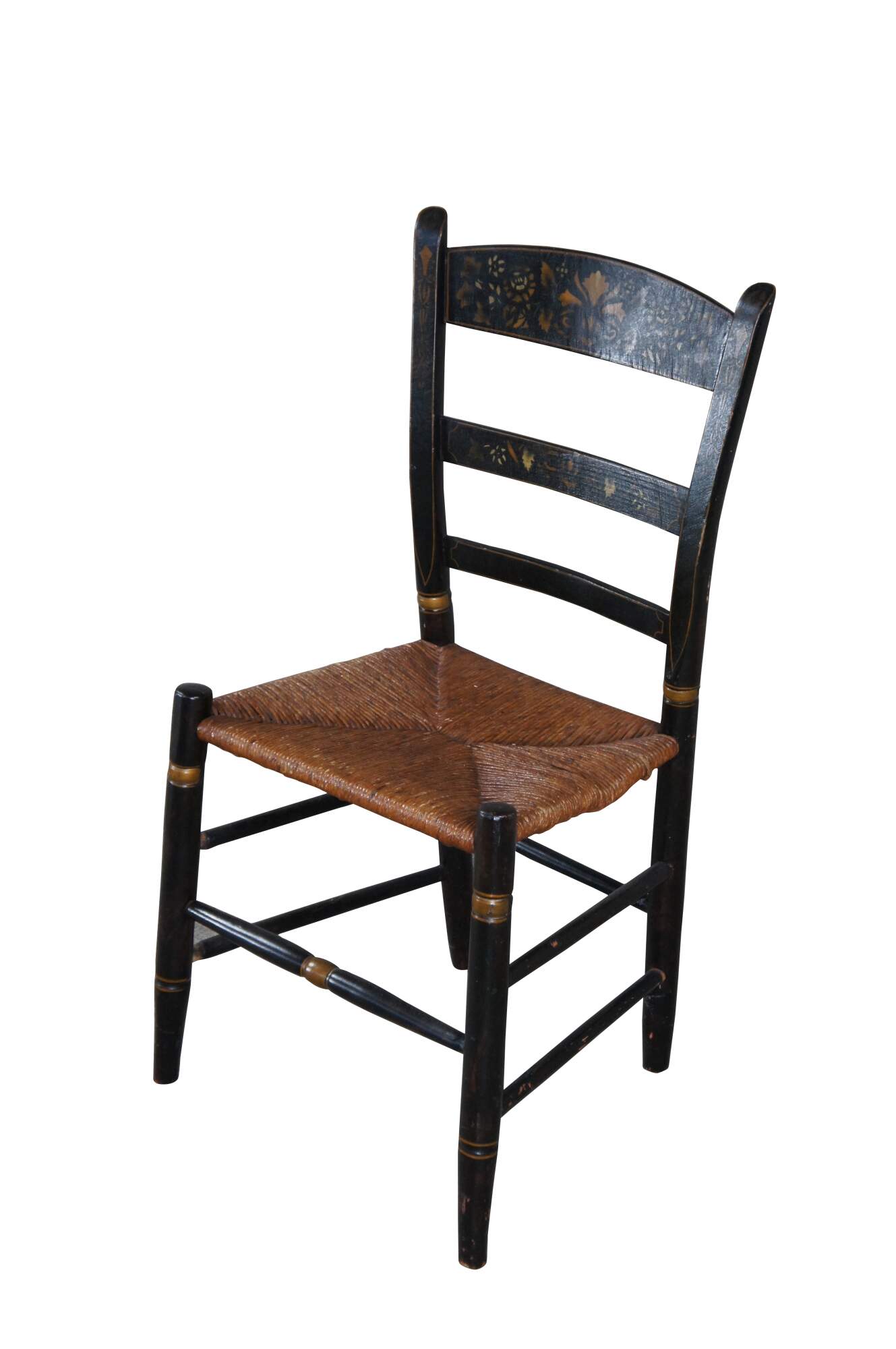 An antique Hitchcock stenciled back farmhouse chair. Feature a black painted frame with gold trim and a fall harvest scene along the back. Seat is woven with rush.