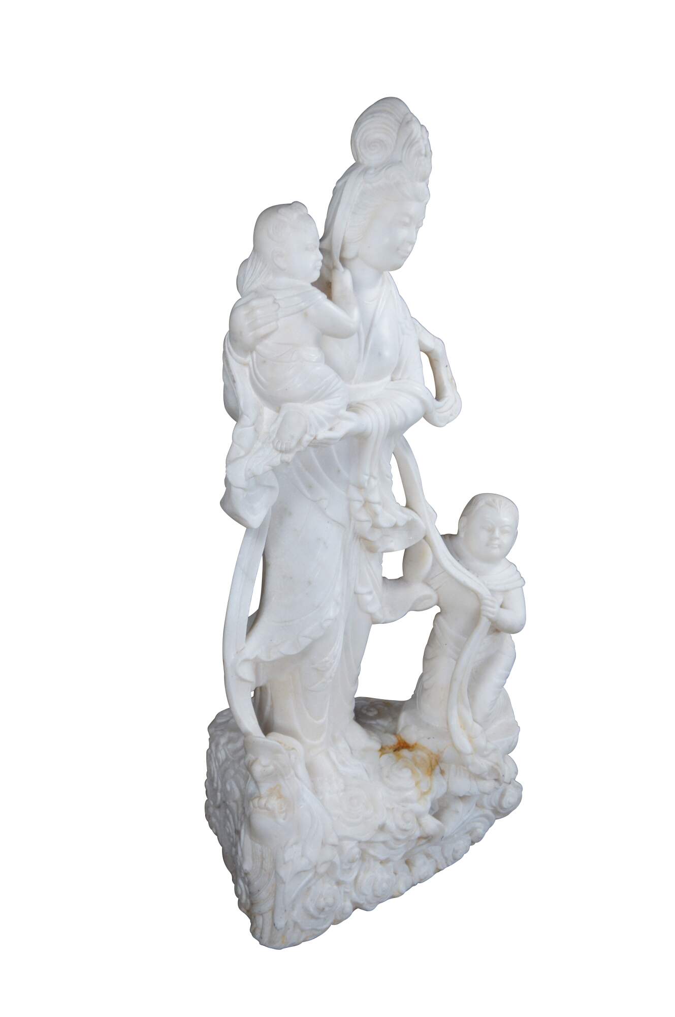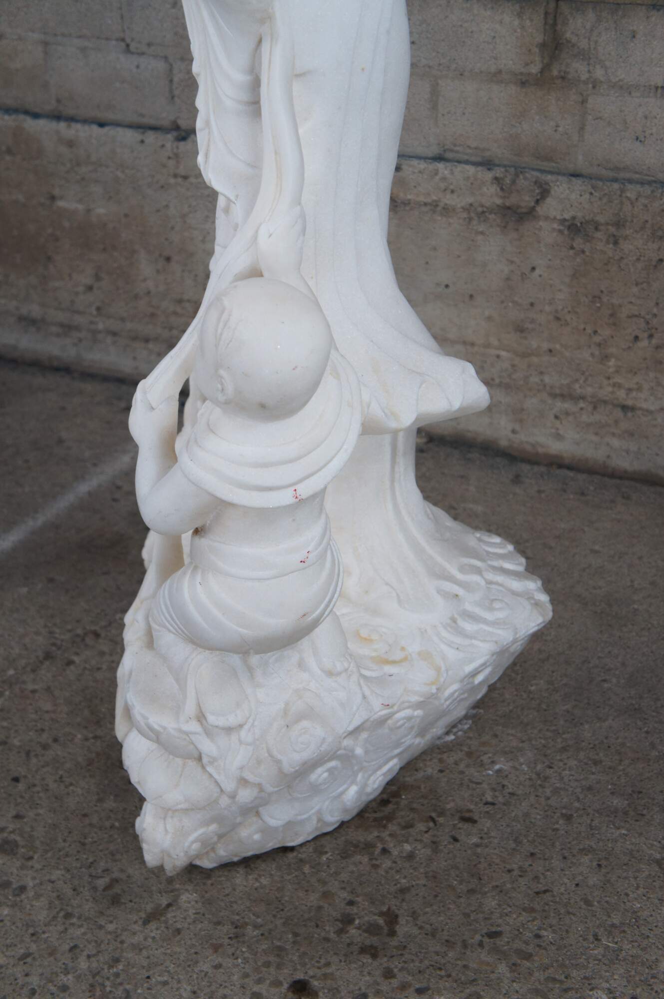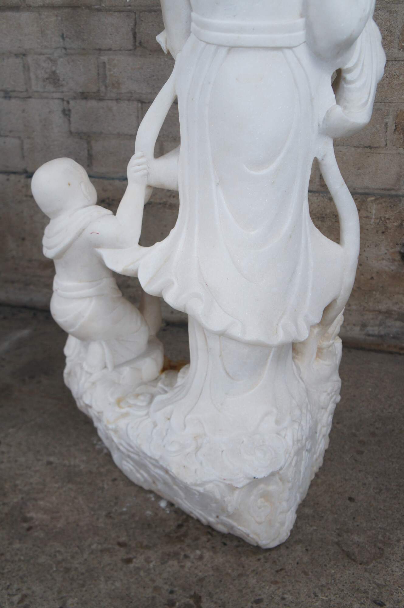 A rare and impressive Life Size Chinese solid white marble carved Guanyin (also spelled Guan Yin, Kuanyin, Kuan Yin, Kwanyin, Kwan Yin) sculpture. Kwan Yin is shown in traditional robe standing on a lotus plinth with two babies and a dragon. One of the babies is in arms and the other along the foreground holding onto a sash that is connected throughout the figure leading around the other side into the dragons mouth. The sculpture is carved with exceptional detail and will display well on the interior of any home or exterior in the garden.