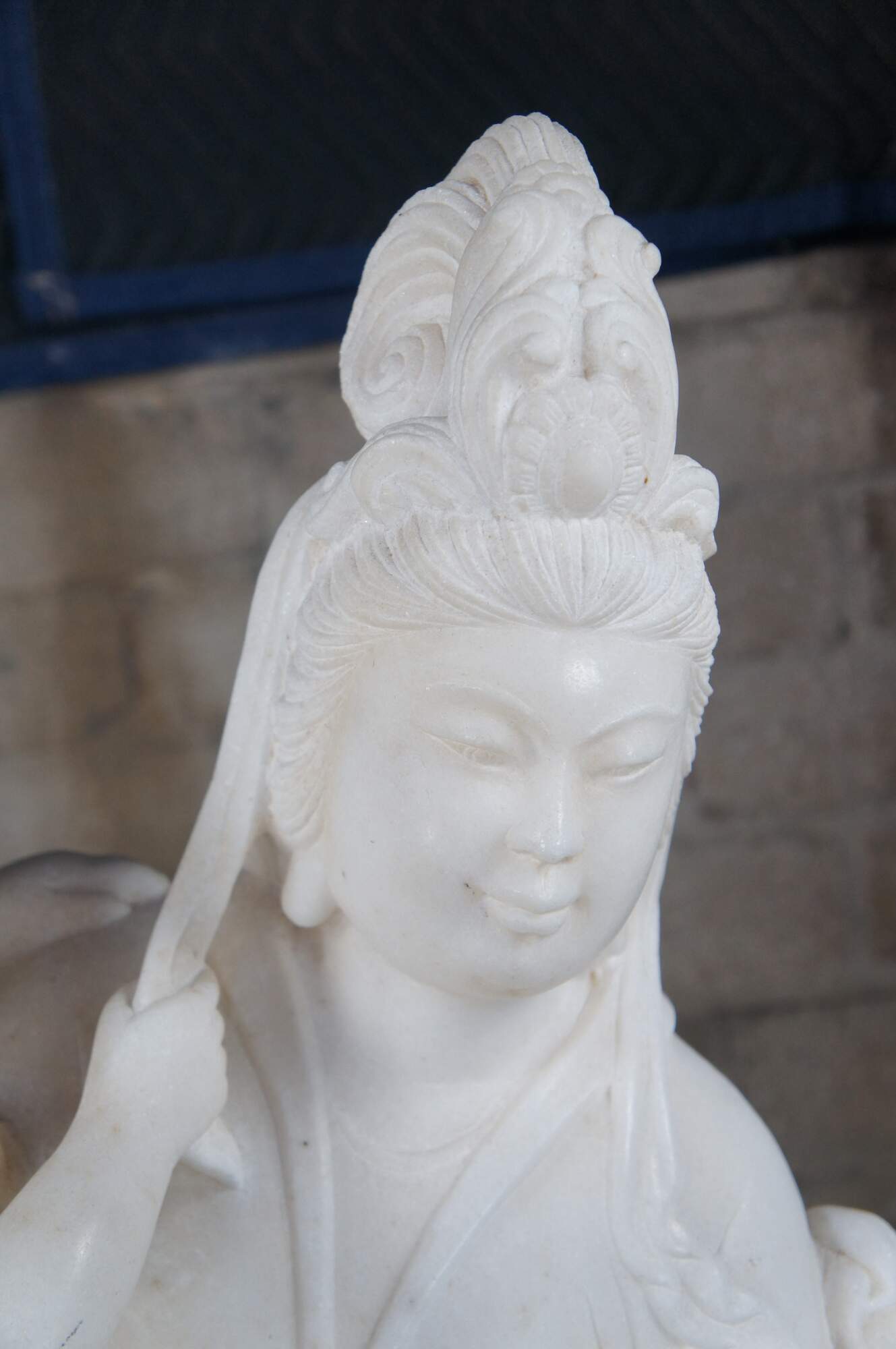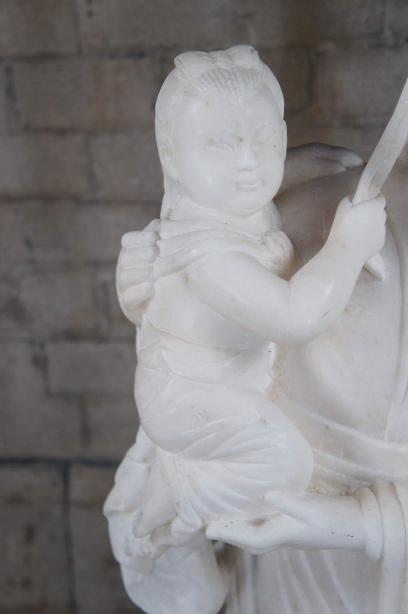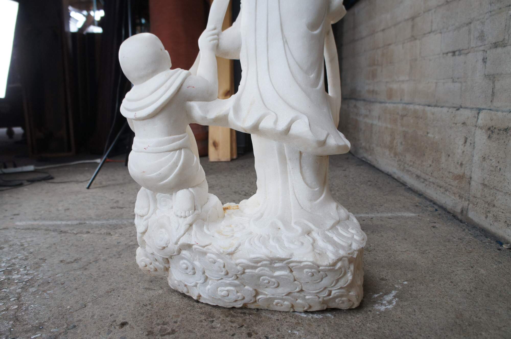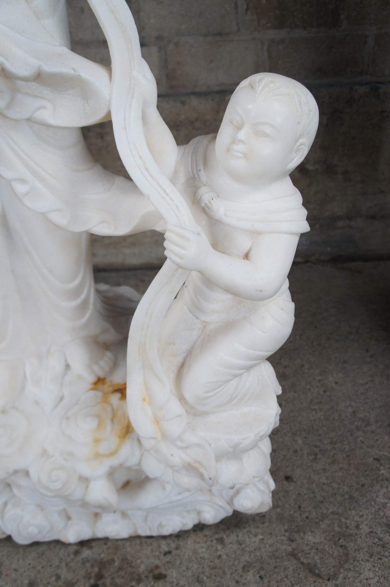 A rare and impressive Life Size Chinese solid white marble carved Guanyin (also spelled Guan Yin, Kuanyin, Kuan Yin, Kwanyin, Kwan Yin) sculpture. Kwan Yin is shown in traditional robe standing on a lotus plinth with two babies and a dragon. One of the babies is in arms and the other along the foreground holding onto a sash that is connected throughout the figure leading around the other side into the dragons mouth. The sculpture is carved with exceptional detail and will display well on the interior of any home or exterior in the garden.