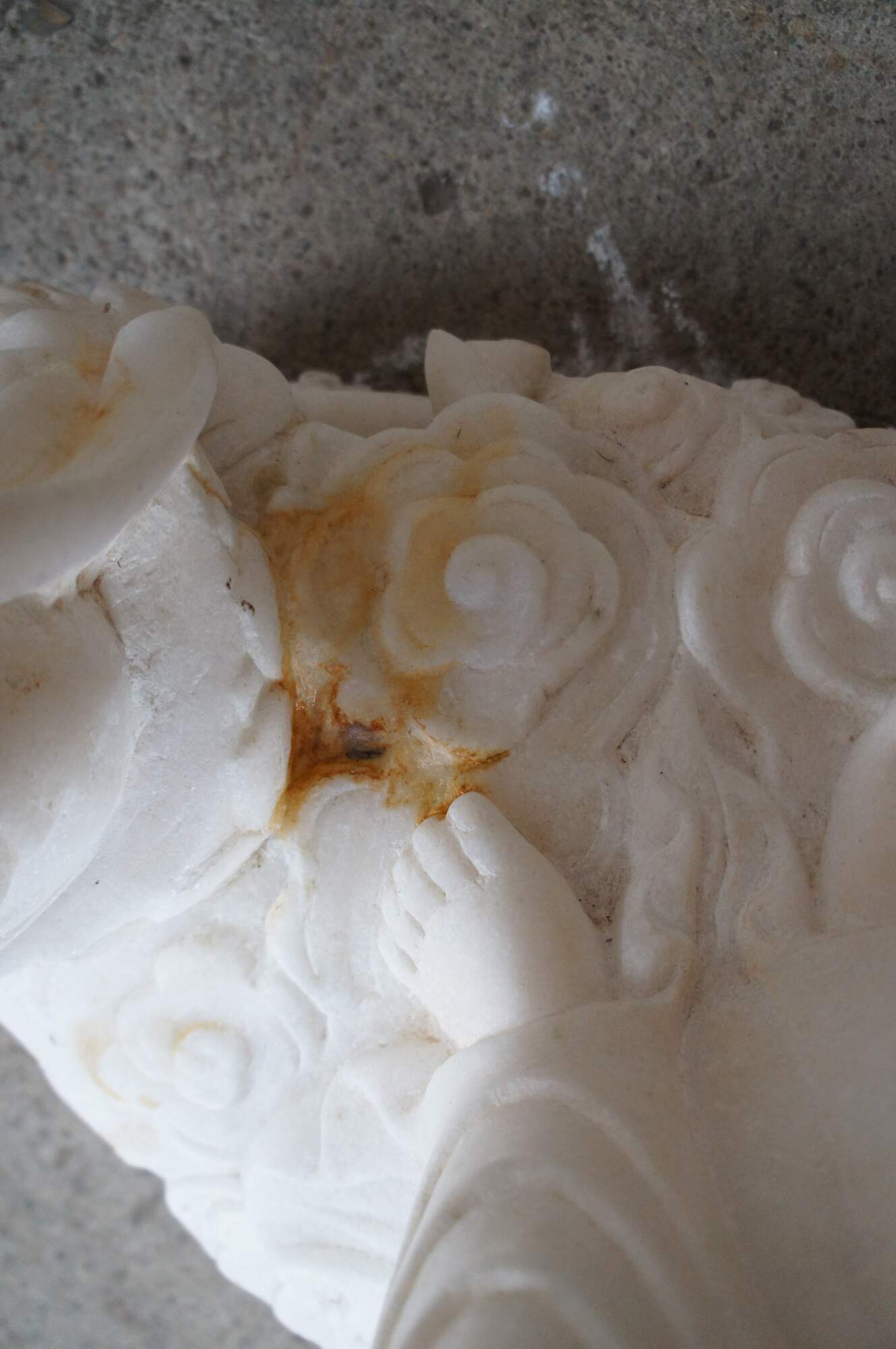 Good Antique Condition; Belmishing / Stain by the left foot lotus area. Past repairs to the the portion of the sash that loops off of the left arm.