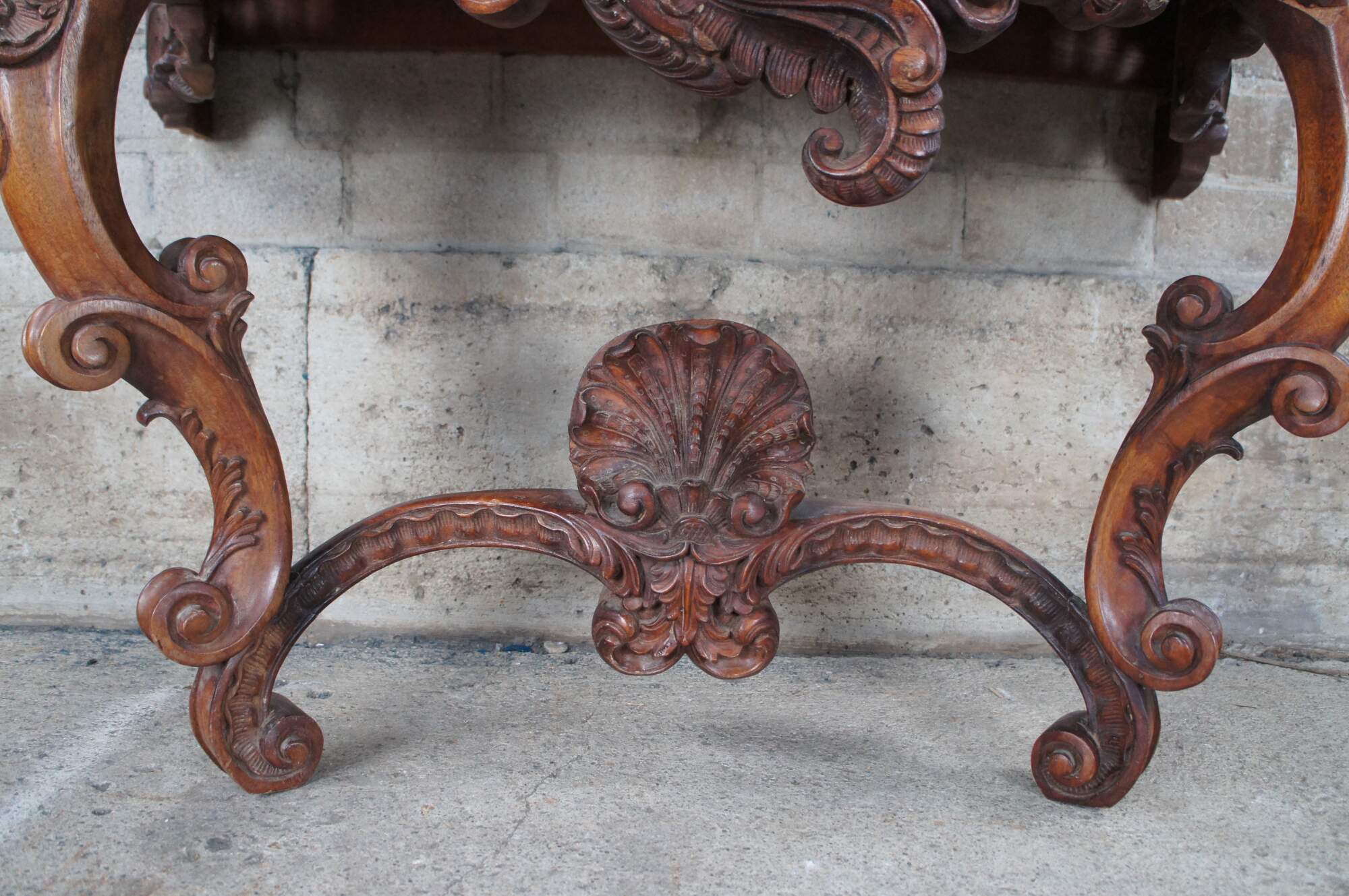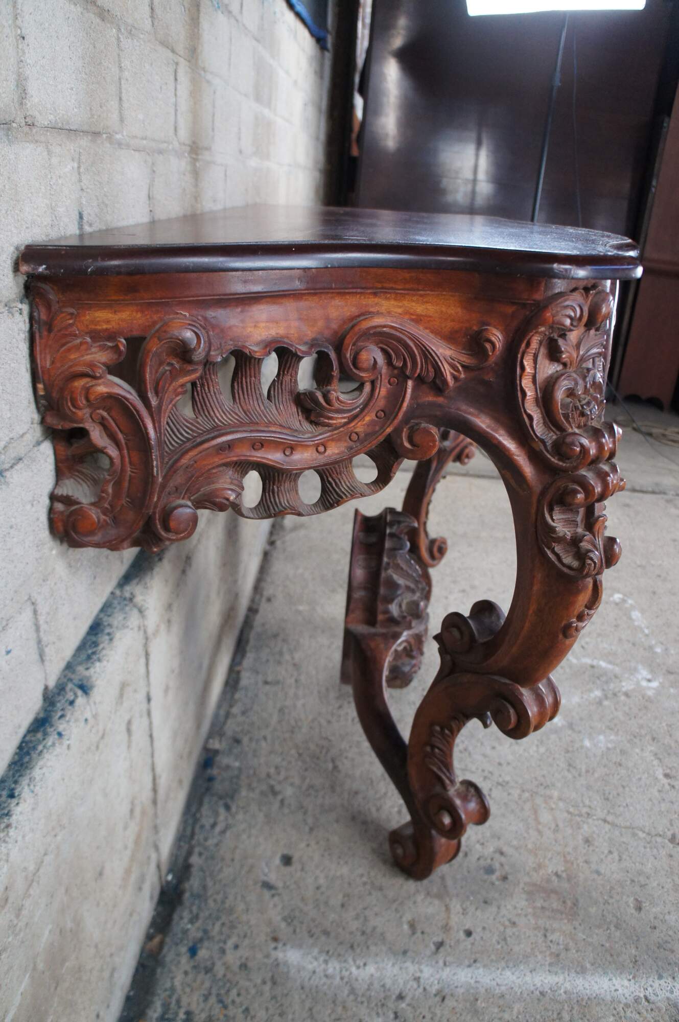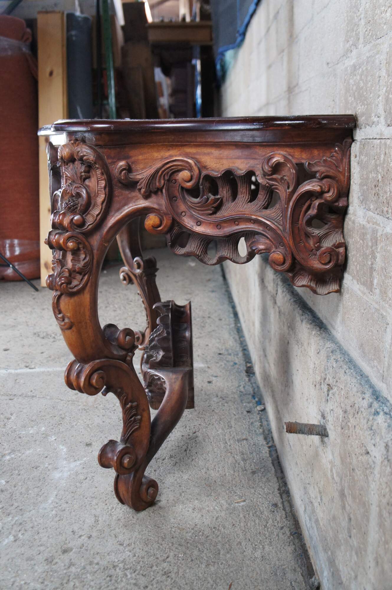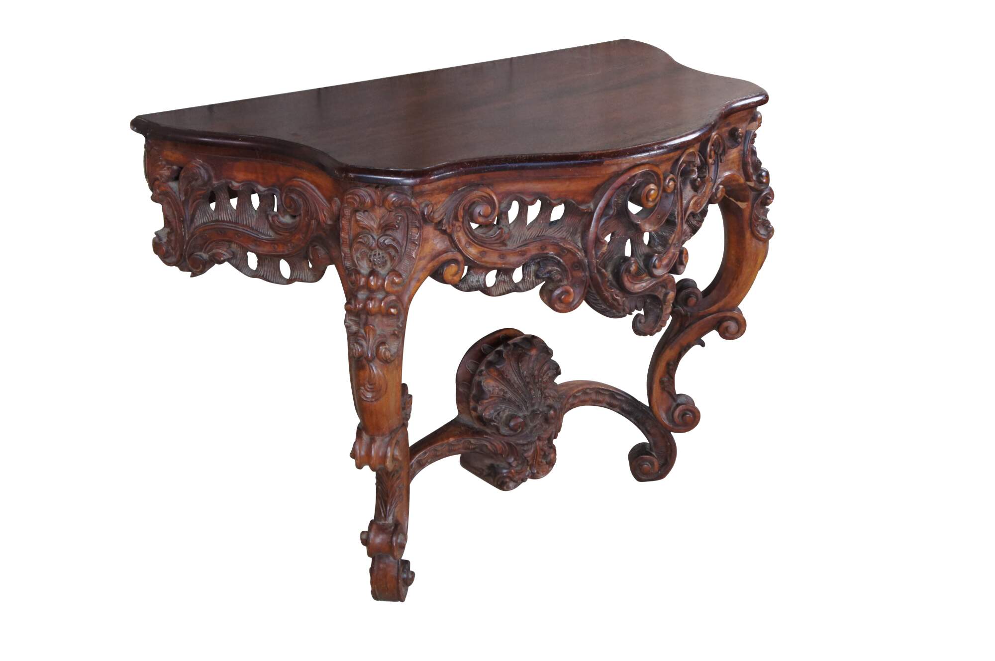 Antique Louis XV style Rococo console table, circa mid-nineteenth century. Features a solid mahogany frame with serpentine turtle top over a meticulously carved base showcasing pierced scallops, foliate, acanthus, "C" and "S" scrolled detail. The table is supported by elaborate cabriole legs connected by an ornately scalloped cross stretcher.