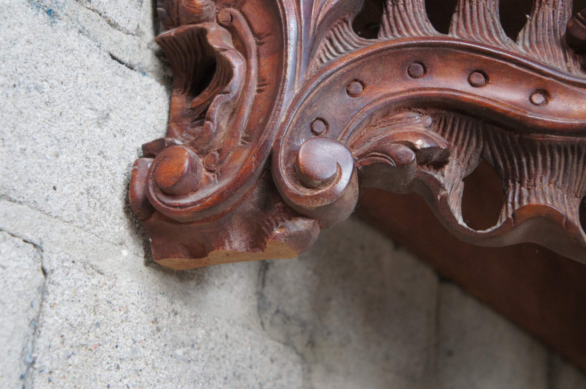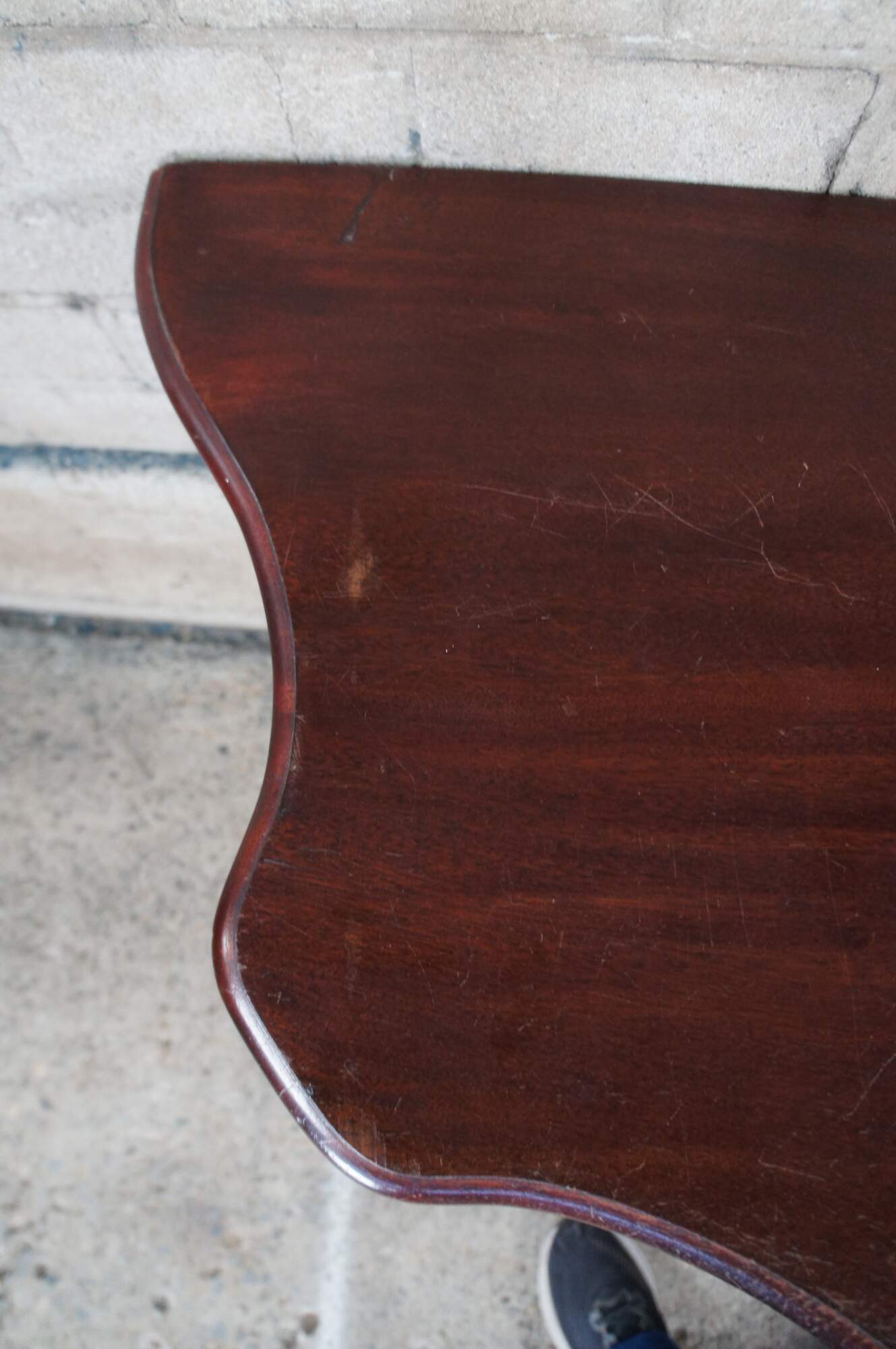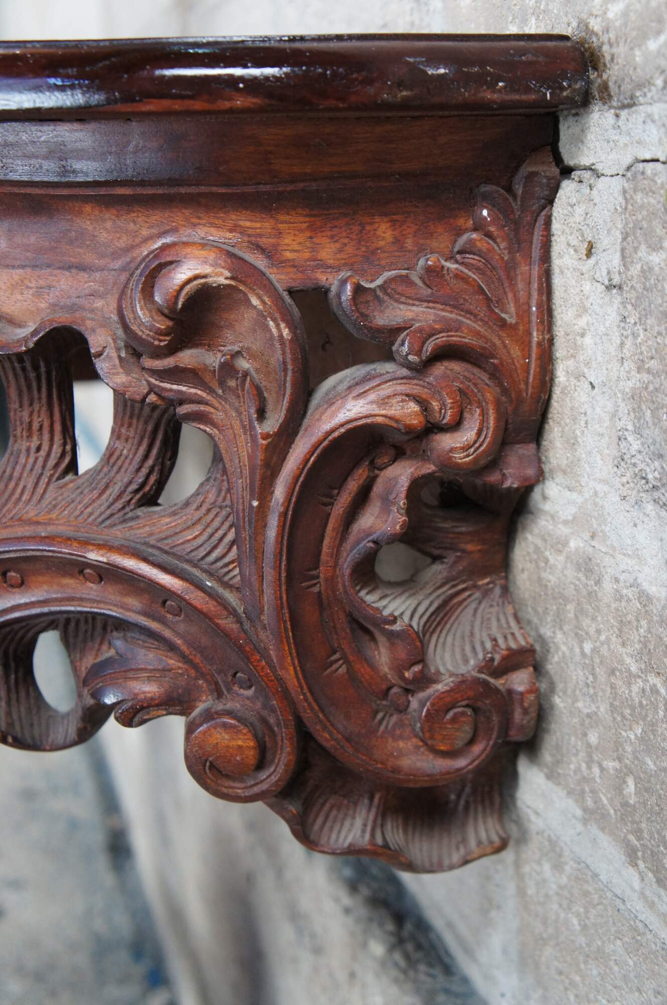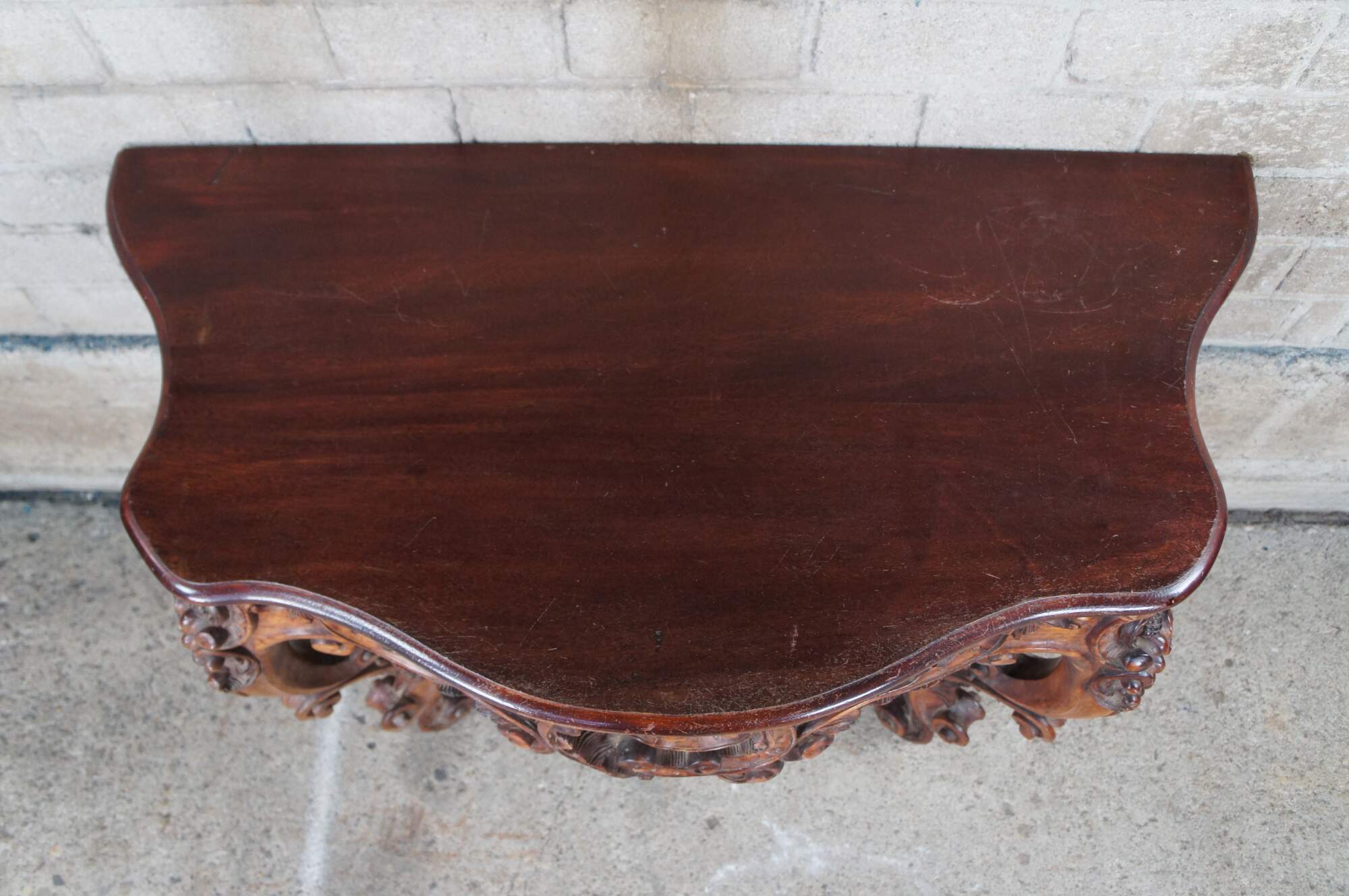 Antique Louis XV style Rococo console table, circa mid-nineteenth century. Features a solid mahogany frame with serpentine turtle top over a meticulously carved base showcasing pierced scallops, foliate, acanthus, "C" and "S" scrolled detail. The table is supported by elaborate cabriole legs connected by an ornately scalloped cross stretcher.