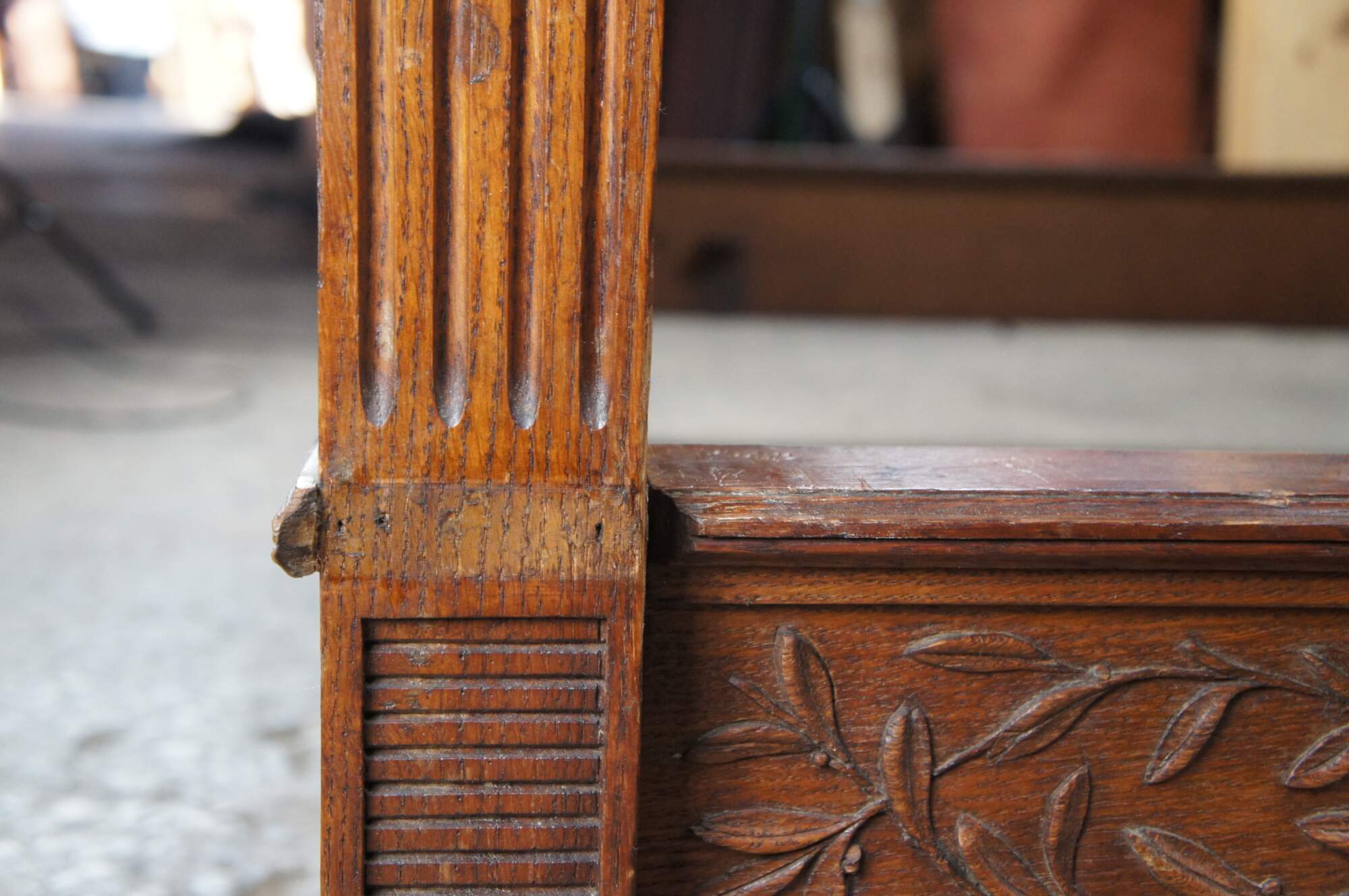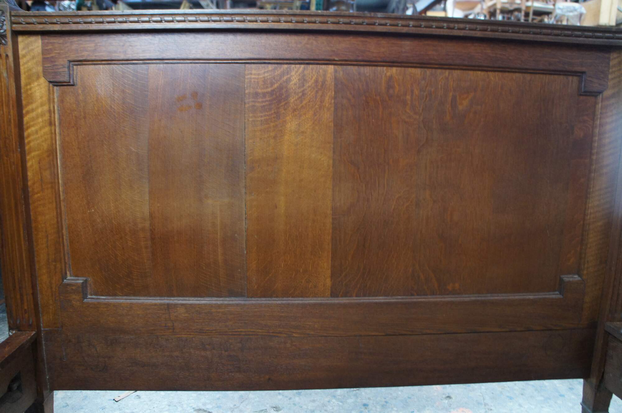 Exquisite antique 19th century French Louis XVI Full Size Bed. Made from solid quartersawn oak with meticulous carving throughout. Features square fluted posts with French medallions. The footboard is beautifully carved with a neoclassical scene showcasing ribbons, torchieres, scrolling foliate and swag. The scene is inset and framed in a panel with stepped dentil molding. Lower apron has a ribbon at the center flanked by an intertwined vine motif. This motif continues along the side rails with some fluting at the center. The final touch of this masterpiece can be seen along the crown of the headboard in a flowing serpentine pierced and carved ribbon and bow motif. This elaborate and large scale carving is rarely found in pieces from this period. The frame is supported by square tapered feet. Side rails have metal L brackets to support box spring and mattress. The perfect addition to any space.