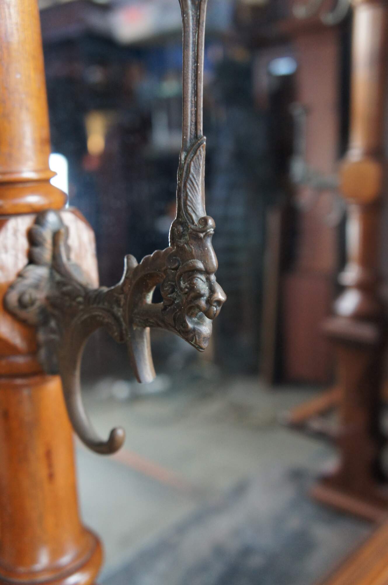 Massive Victorian Era Renaissance Revival hall tree and umbrella stand, circa 1870s. Made from walnut with a large glass plate pier mirror set between ornately turned columns scrolled along the top with figural double hooks. Beneath the mirror is a granite surface over a hand dovetailed drawer. This area is flanked by two umbrella or cane holders with spindled backings and tin inserts along the base. The top is arched with a matchbook burl and posts are neatly carved and fluted beneath a layered sawtooth / repeating half moon crown. The burled motif continues behind the each column and down around the base. A truly exception specimen that will add grandeur to any space.